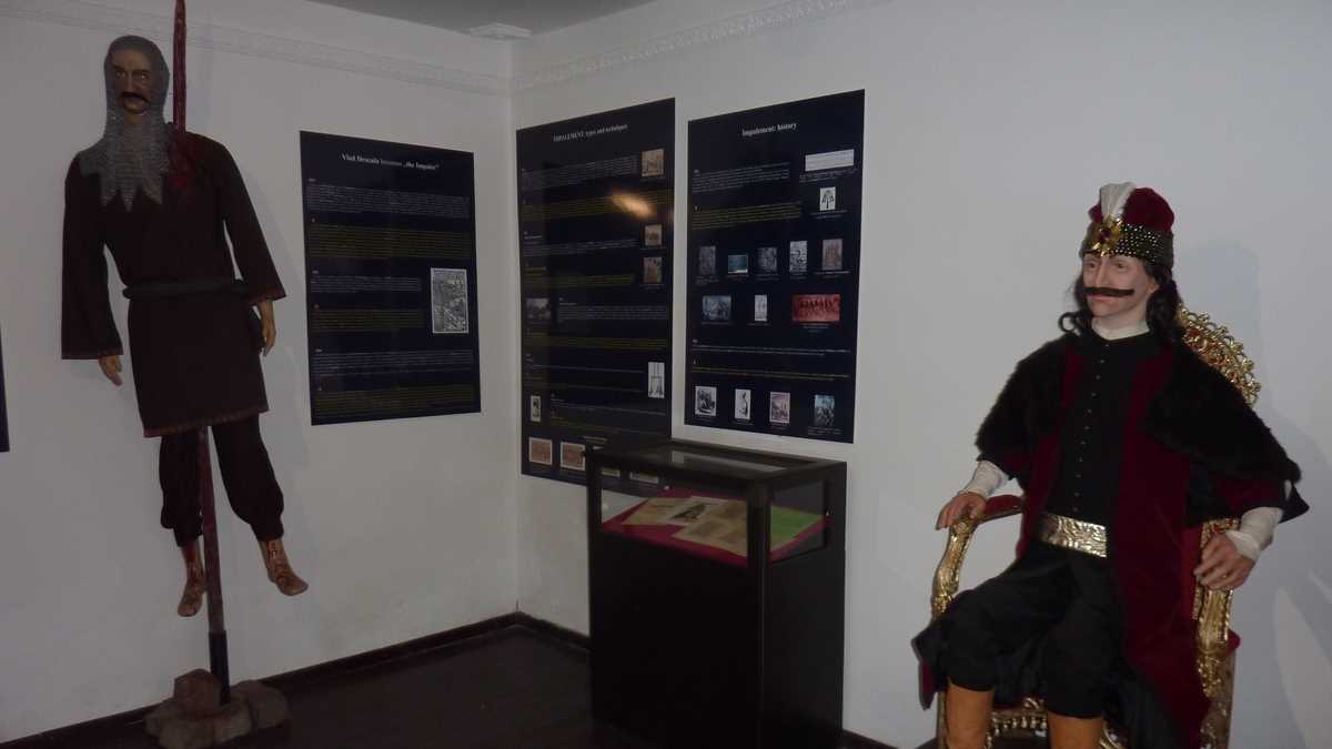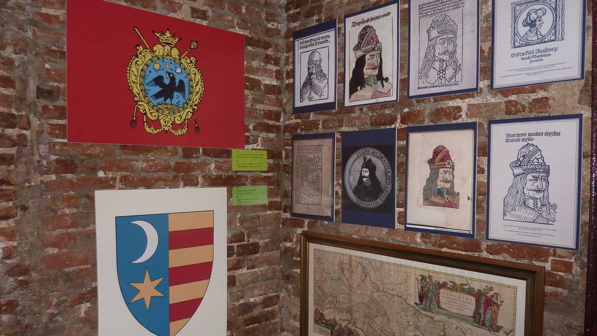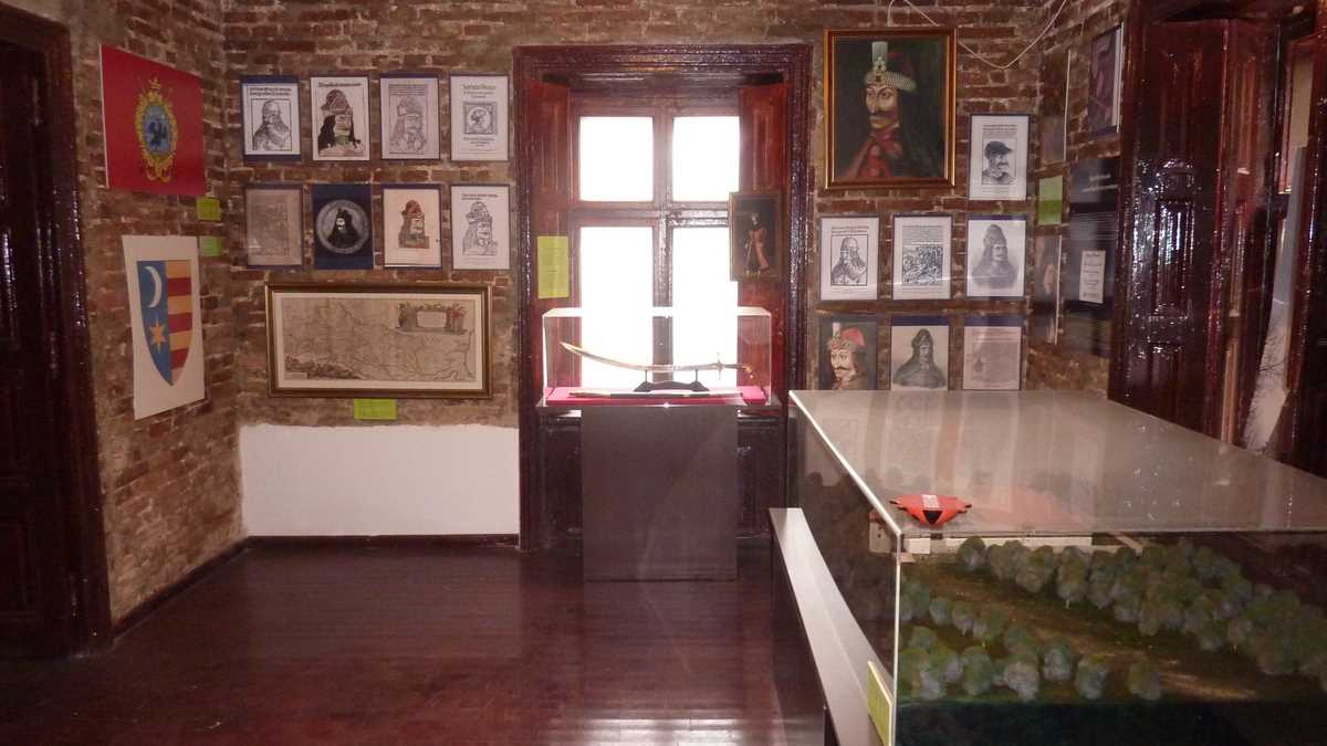 Hărți ale vremii, monezi de argint leșești, în circulație aici pe timpul său (aparent, ca țară mică, nu-și permitea baterea propriei monede, deși ar exista, cică, pe undeva, un bănuț cu heraldica lui), portrete, gravuri, coifuri originale de ieniceri, foarte rare și cu formă puțin știută (pentru că erau ascunse de turban), proiectile de tun, căști de mercenar (oastea sa cuprindea zece mii de mercenari devotați, foarte bine plătiți), replica unui iatagan din epocă, arma folosită toată viața (ostatic opt ani la curtea sultanului, și-a desăvîrșit educația și școala de arme acolo). Piesele de rezistență sînt statuile din ceară Vlad Țepeș (reprezentarea lui pe un jilț făcut la o mînăstire grecească specializată în artefacte ortodoxe, cea mai scumpă piesă a colecției) și Dracula turnate în Olanda, la comandă, de calitate superioară celor expuse la Madame Tussauds.