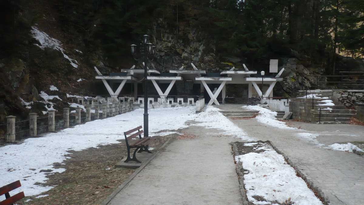 Primele semne de viață au răsărit abia la intrarea în traseul izvoarelor minerale de pe malul Slănicului: două tarabagioaice. Printre alune de pădure și siropuri de păpădie, cornată și afinată la promoționalul preț de doar 10 lei sticluța de 200 ml. E naturală, maică, de casă, m-a îmbiat mamaia, turuind ca Ilie Dobre un pomelnic de boli speriate de licorile sale. Am luat o afinată, nu atît ca să scap de insistența ei, cît ca să mă încălzesc nițel pe parcursul circuitului Izvoare (lîngă cel cu nr. 5, cineva s-a mutat cu tot cu rulotă) – Păstrăvărie (în restaurant, m-am simțit foarte special: eram singurul client) – Cascadă (complexul de lîngă care Slănicul cade în gol vreo cinci metri e foarte închis) – Camping (pe locul unde altădată se stătea cu cortul, cîțiva băieți deștepți și-au întins niște vile beton) și retur.