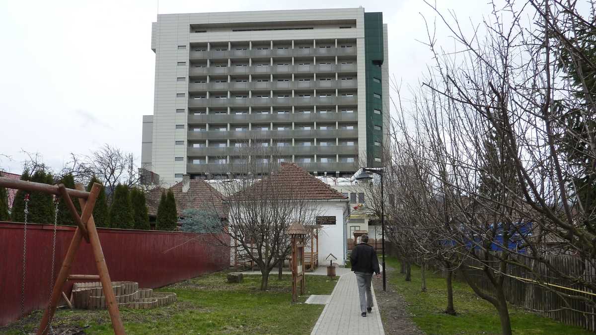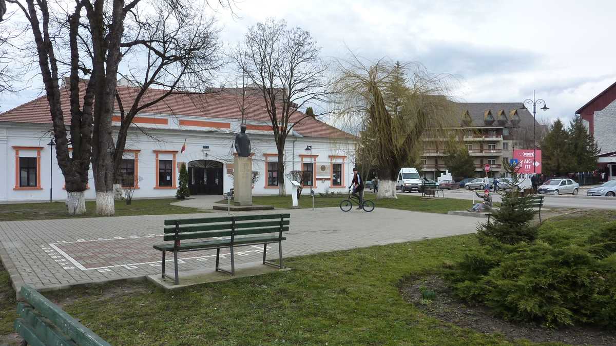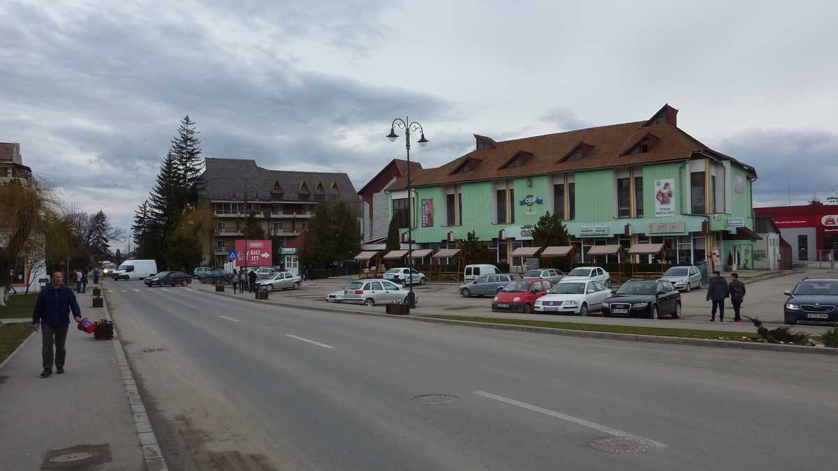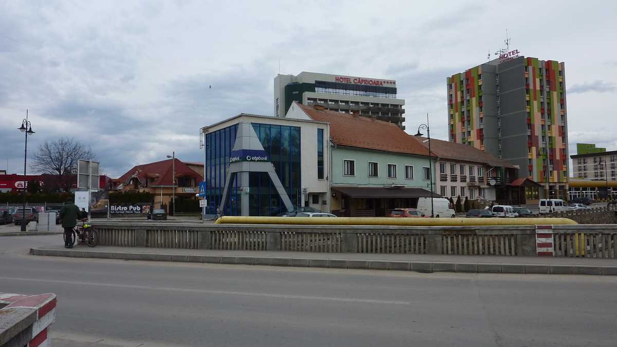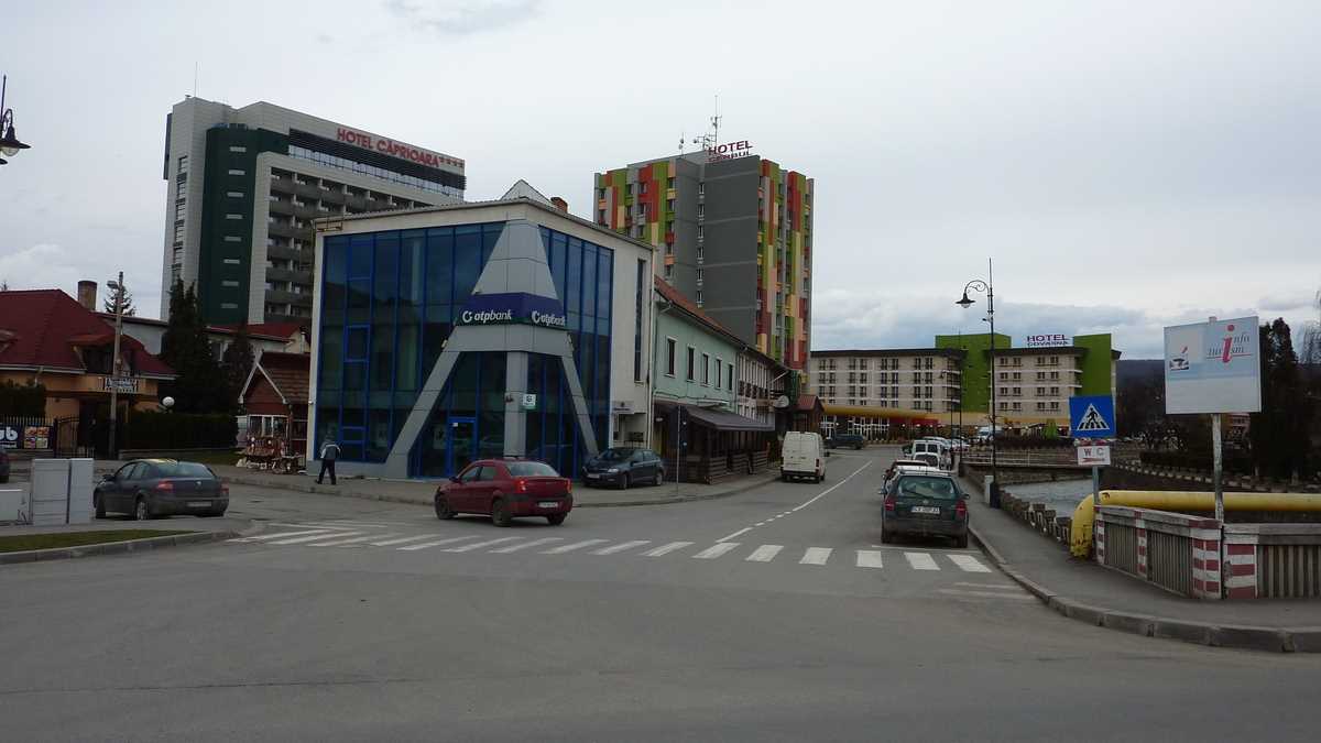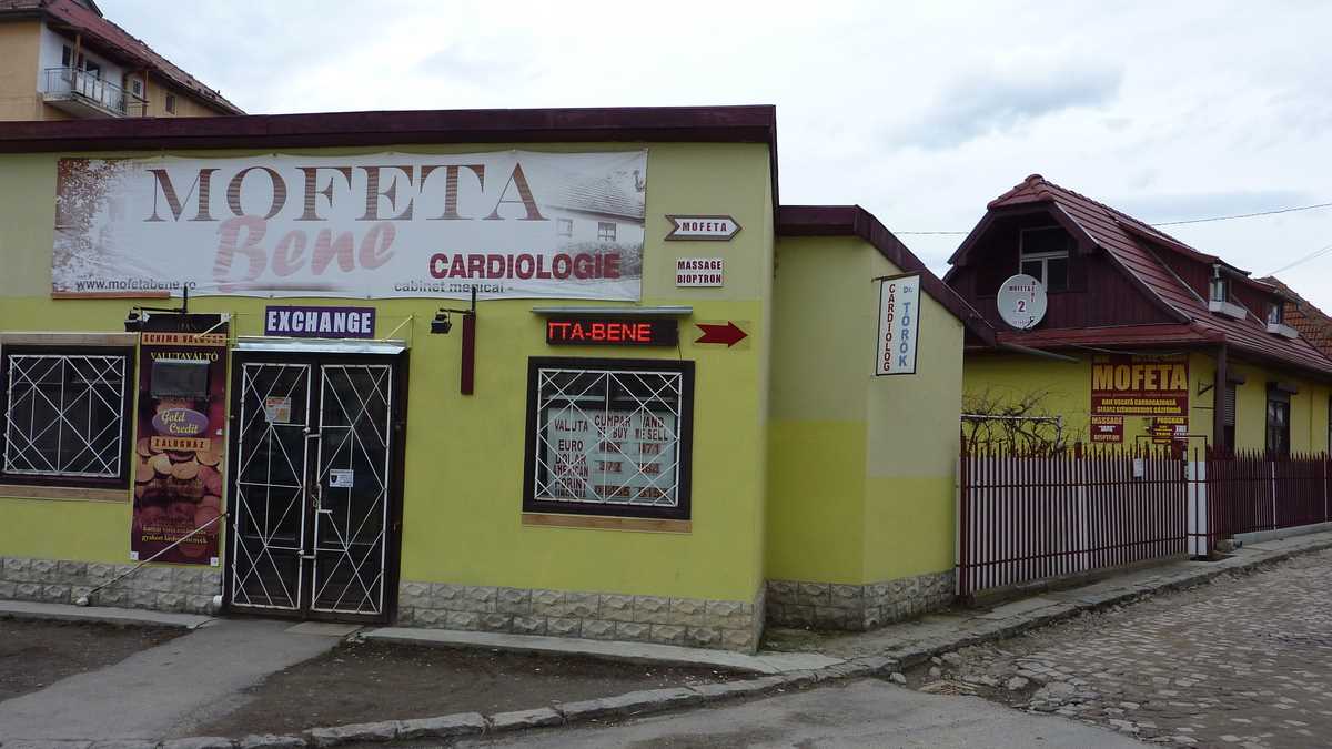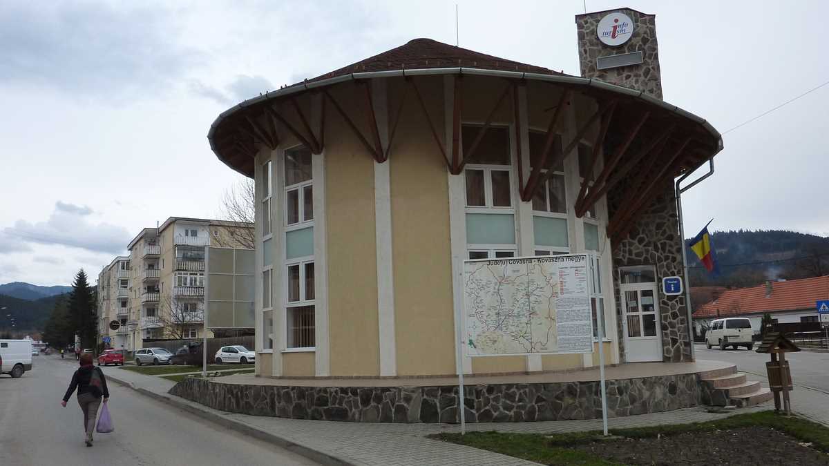 Plimbarea de documentare ne-a mai purtat și prin centrul de informare turistică, situat în apropierea centrului, pe strada care duce spre pîrtie, încă deschis vineri după-amiază (performanță cu care puține localități mai mult sau mai puțin turistice se pot lăuda; aici am primit o hartă a orașului de la o tanti amabilă cu care m-am conversat în românește, deși eram pregătit să comut pe engleză, după cîtă lume auzisem vorbind în maghiară pe stradă), pe la Mofeta Bene din spatele blocurilor centrale, în care emanațiile gazoase post-vulcanice așteaptă nări dornice să le inhaleze, și, surpriză, prin curtea casei în care e chiriașă o galerie de artă contemporană (închisă la momentul trecerii noastre pe acolo, o zi de martie veștejită și rece – probabil era plecată puțin după culori).