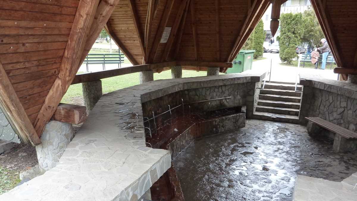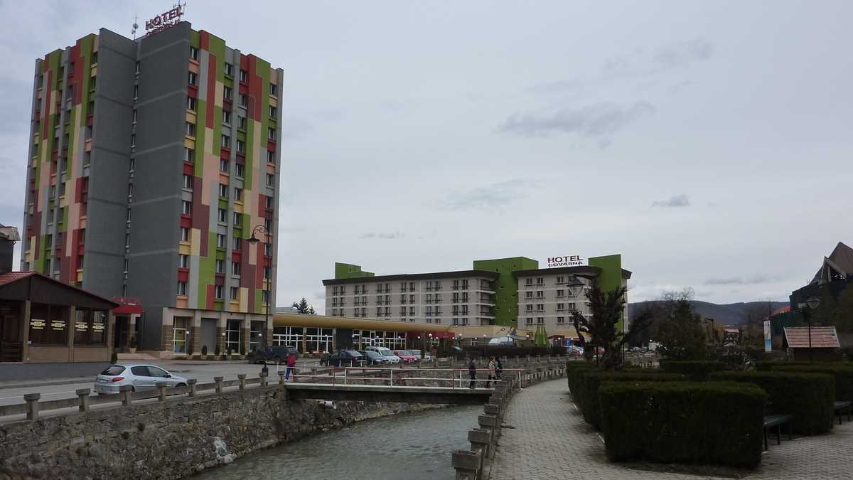 Revenind în centru, pîrîul Covasna îl taie în două, despărțind parcul îngrijit, cu bănci cu vopseaua nescorojită și copaci ornați cu căsuțe pentru păsărele, de parcările hotelurilor Căprioara, Cerbul, Covasna, Turist, care, din afară, par recent renovate. Locatarii lor, preponderent pensionari, clienți ai unui turism de avarie (a se citi, sănătate), trec podul peste pîrîu, într-un pelerinaj cu sticla în mînă spre apa izvorului Elvira, sursa alinării diverselor afecțiuni reumatismale. Ceva mai încolo, tot pe partea asta cu parcul, se află un alt loc de pelerinaj: Balta Dracului, vulcanul noroios monument al naturii folosit în trecut ca baie terapeutică publică, un obiectiv turistic împachetat acum într-o cutie din lemn, genul cabană cu multe uși.