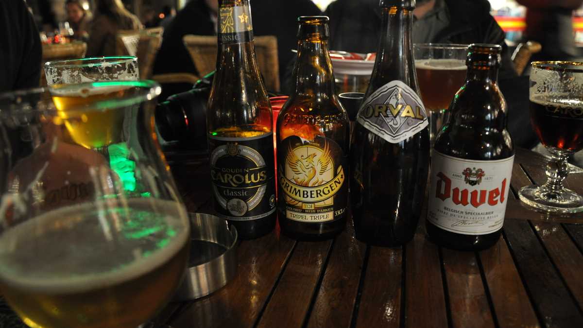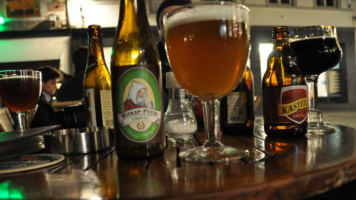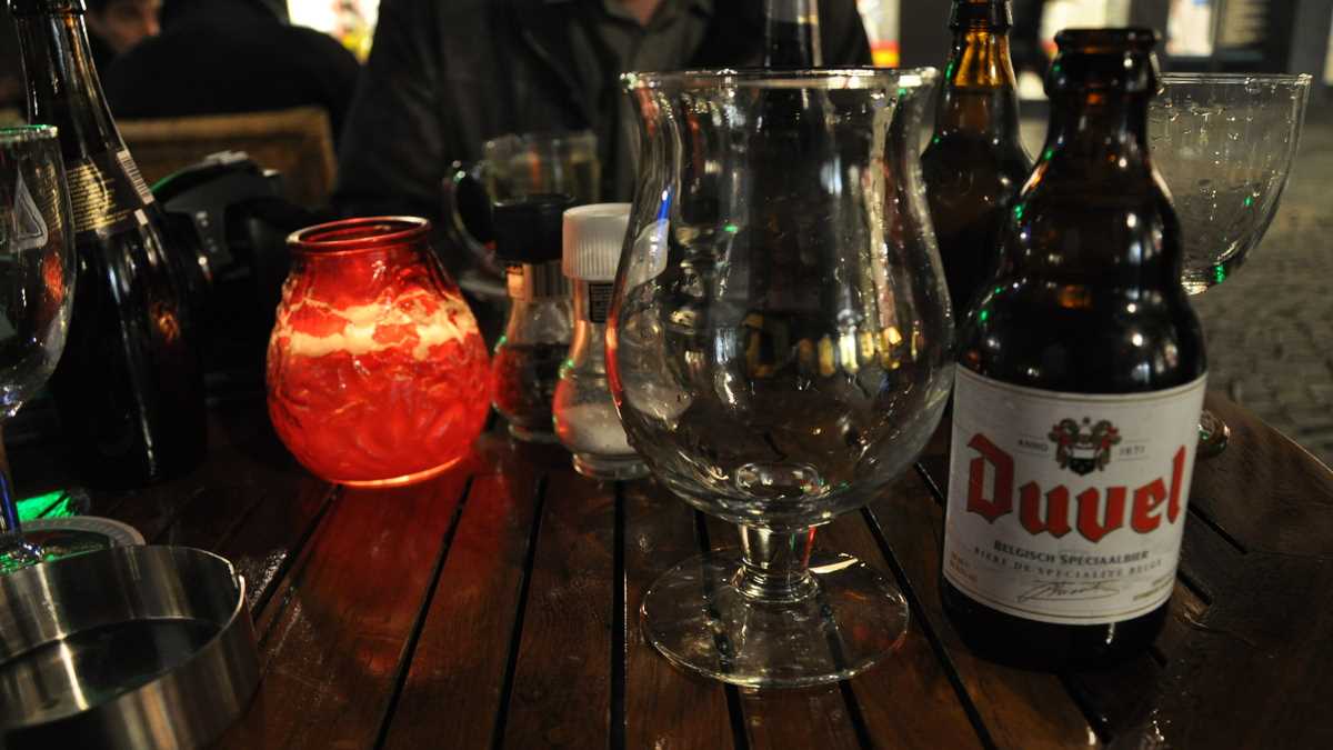 Dar să ne întoarcem la, pardon de expresie, barurile noastre: ajungeam, pe la asfințit, în Maastricht și, după găsirea unui loc de parcare pe o străduță aglomerată din apropierea centrului, se vota în unanimitate o degustare de beri belgiene nefiltrate pe terasa pub-ului Café Falstaff din piațeta Sint Amorsplein, o intersecție de pietonale foarte circulate patronată de statuia Sfîntului Amor (ocrotitorul homeleșilor, nu al îndrăgostiților, cum s-ar gîndi cei contaminați cu inimioarele perioadei). Începea, astfel, o seară lungă; mai întîi, pentru chelnerul arondat zonei în care ne așezasem, condamnat la o serie de curse destul de dese spre masa noastră, pentru alimentarea periodică cu exemplare din aproximativ toate mărcile reprezentative ale cîrciumei. Orval Trappist (7,2%, 4 euro), Witkap-Pater Tripel (7,5%, 4 euro), Duvel (8,5%, 4 euro), Hoegaarden Verboden Vrucht (8,5%, 4 euro), Gouden Carolus Classic (8,5%, 3,80 euro), Grimbergen Tripel (9%, 4 euro), Rochefort 8 (9,2%, 4,80 euro), Kasteel Rouge (8%, 4 euro), La Trappe Wit (3,60 euro), ca să citez din nota de plată cîteva dintre etichetele care au defilat pe masă; toate îmbuteliate la 330 ml, fiecare cu designul propriu de sticlă și paharul său branduit. Plus, între beri, cu niște porții de friet met mayonaise, ca să n-avem senzația că, la o cină atît de bogată, nu s-a și mîncat ceva.