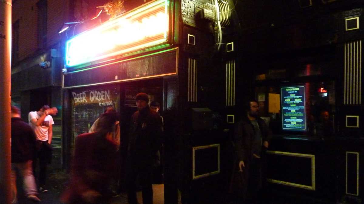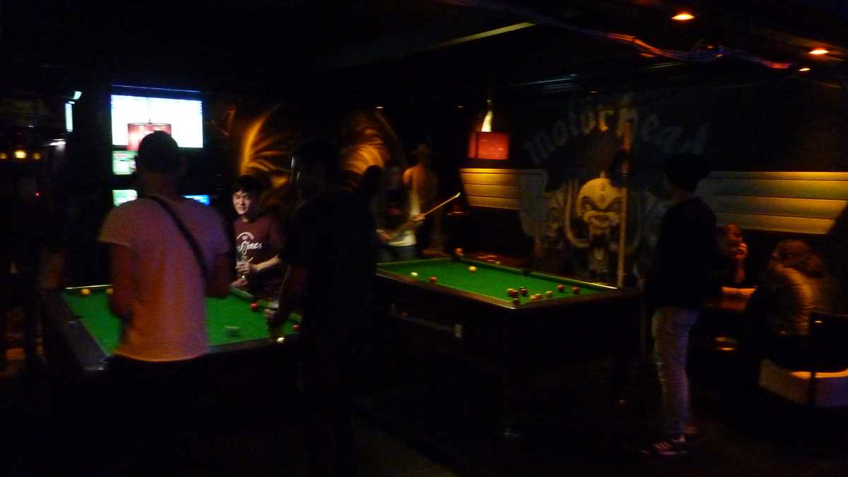 Adică unde, mai exact: La o scurtă trecere în revistă, locul cam întunecat, luminat doar de reclamele barului, ecranele televizoarelor de pe pereți și lămpile de deasupra meselor de biliard, e un club spațios cu scena pe capătul opus intrării, în care gașca stă mai mult în picioare, bîțîindu-se în ritmul muzicii de pe-un bocanc pe altul și sorbind din băutura așezată pe polițele înguste ale stîlpilor de rezistență. Pentru cei care nu pot fără țigară, pe o ușă din dreapta scenei, se iese în beer garden, un fel de terasă de aerisit fumurile.