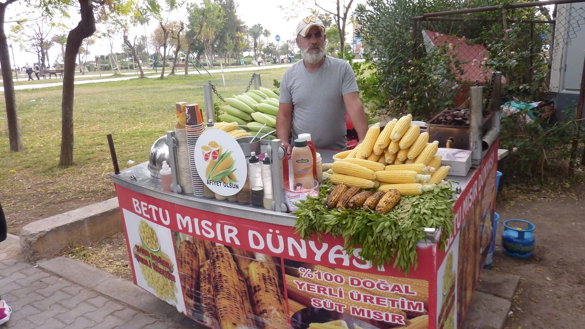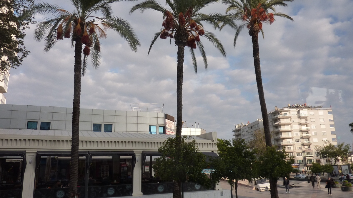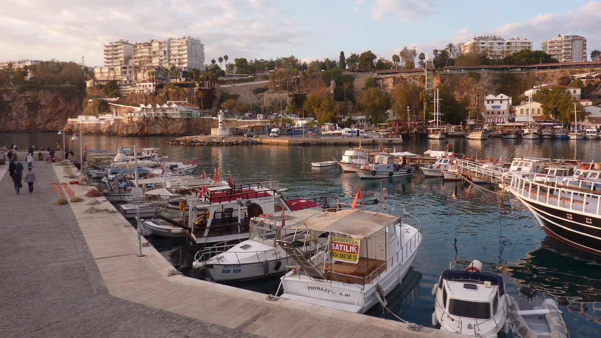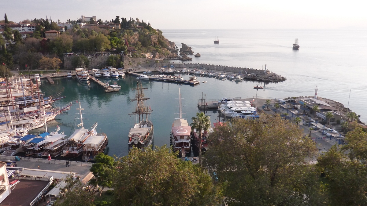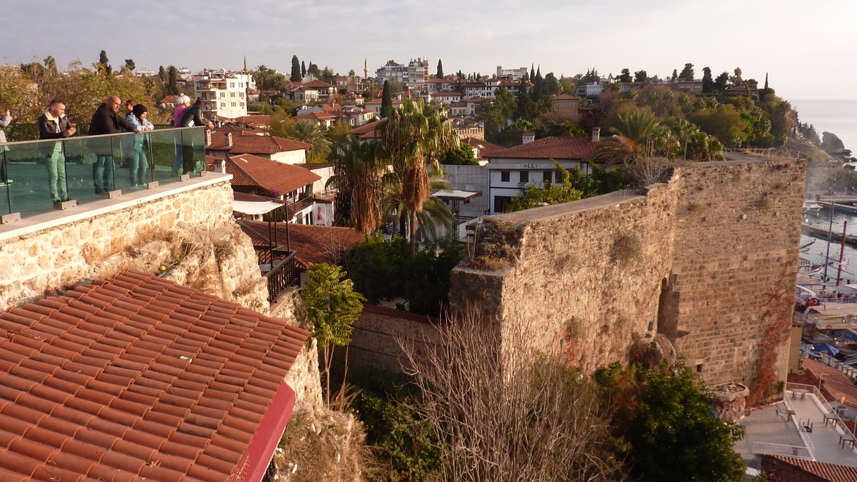 Am avut apoi o oră și ceva de explorat individual prin Kaleiçi, centrul istoric cu căsuțe restaurate înapoi la condiția lor modestă de secol XVIII-XIX și construcții sfinte care-au parcurs în timp neobișnuitul traseu confesional templu-biserică-moschee. Desfășurat la înălțime, printre leandri, lămîi și portocali, pe și sub zidurile otomane ale vechii fortărețe cu fundații romane și bizantine care arunca cu bombardeaua în calea celor care îndrăzneau să se apropie neinvitați. Nu mai e cazul azi: la terasele populate cu o lume foarte cosmopolită, europenizată clar (foarte puține femei mai sînt îmbrăcate în portul local care lasă descoperiți doar ochii), atmosfera e foarte pașnică. De la mesele la care se consumă nu numai ceai sau cafea, în buna tradiție musulmană, ci și nenumărate pahare cu bere, ai vedere directă, jos, spre marina din micul golf și bucata de plajă de sub pereții stîncoși de la baza falezei. Ajungi și acolo, coborînd trepte, străduțe pavate sau cu modernul lift care face curse parter-etaj cu o singură stație, trecînd mai întîi prin zona cheiului cu restaurante, de unde pleacă în croazieră corăbiile fioroase, pavoazate cu zeități marine sau cu corsari celebri din filmele cu Barbă Neagră sau Jack Sparrow, acostate la țărm pînă se umplu cu turiști. Care, deocamdată, preferă să se preumble bezmetici printre intreprinzătorii cu măsuță pliantă, furnizori de gustări rapide de pe tava cu stridii cu lămîie, sau trubadurii de trotuar, degrabă vărsători de ritmuri orientale din clarinet, vioară și percuție, ca să se oprească pe dig, lîngă pescarii de plăcere, spectatori ai apusului ce lasă o dîră luminoasă pe mare înainte ca discul incandescent să dispară după crestele munților.