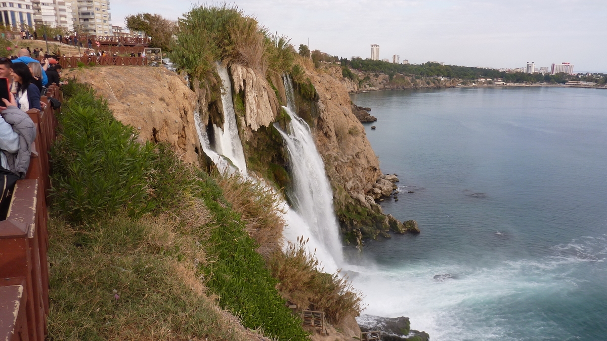 Primul loc fără cazare în care ne-a dus autocarul gazdei, agenția de turism parteneră, a fost Aşağı Düden Şelalesi, pentru un peisaj pe care îl mai vezi doar pe desktop, în jpeg-urile photoșopate cu rezoluție 4K, de privit, pierdut, în pauza dintre două Excel-uri: o cascadă care curge direct în mare. Exact, fix asta se întîmplă cu rîul Düden, izvorît din Munții Taurus, al cărui curs e deviat și prin turbinele unei hidrocentrale: își termină excursia plecată de la munte, zeci de kilometri mai la vale, aruncîndu-și apele zgomotos, de la vreo 40 de metri, în Mediterana, în timp ce lumea din jur venită la acest spectacol unic comentează, face poze și postează pe FB sau Insta.
