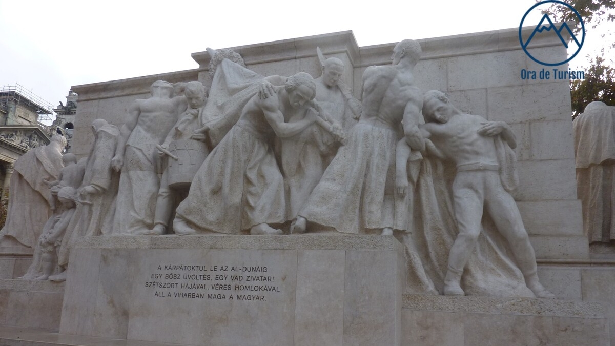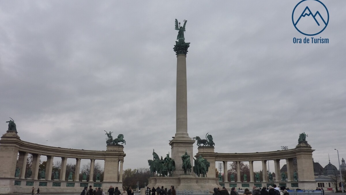 Prima stație în care a coborît toată lumea, pentru niște explicații și mai multe poze, s-a făcut în Piața Eroilor, la Monumentul Mileniului, dedicație specială pentru mia de ani trecută de la stabilirea maghiarilor în zonă. Un ansamblu memorial dominat de coloana de 36 de metri înălțime pe care arhanghelul Gabriel ține într-o mînă coroana și în cealaltă crucea și de grupul statuar al căpeteniilor celor șapte triburi de mercenari nomazi venite din stepele dintre Volga și Urali, păgînii convertiți ca să fie recunoscuți de Europa creștină. Pe arcadele din spate stau aliniați cei mai importanți conducători ai istoriei maghiare de după ei: István I, László I, Andrei al II-lea, Bela al IV-lea, ultimul rege din dinastia arpadiană, Carol Robert de Anjou, primul rege maghiar de origine străină, care a bătut monedă, numind-o forint după modelul florinilor italieni, Ludovic cel Mare, principii de Transilvania Iancu de Hunedoara și Matei Corvin. Ultimul în linie cronologică e Lajos Kossuth, revoluționarul de la 1848 care-a semnat (tardiv) un contract de colaborare cu Bălcescu. Lipsește, surprinzător, marele hun Attila, despre care istoriografia maghiară preferă să nu dea prea multe amănunte. Probabil, nu există interesul de a fi promovată perioada nomadă.
