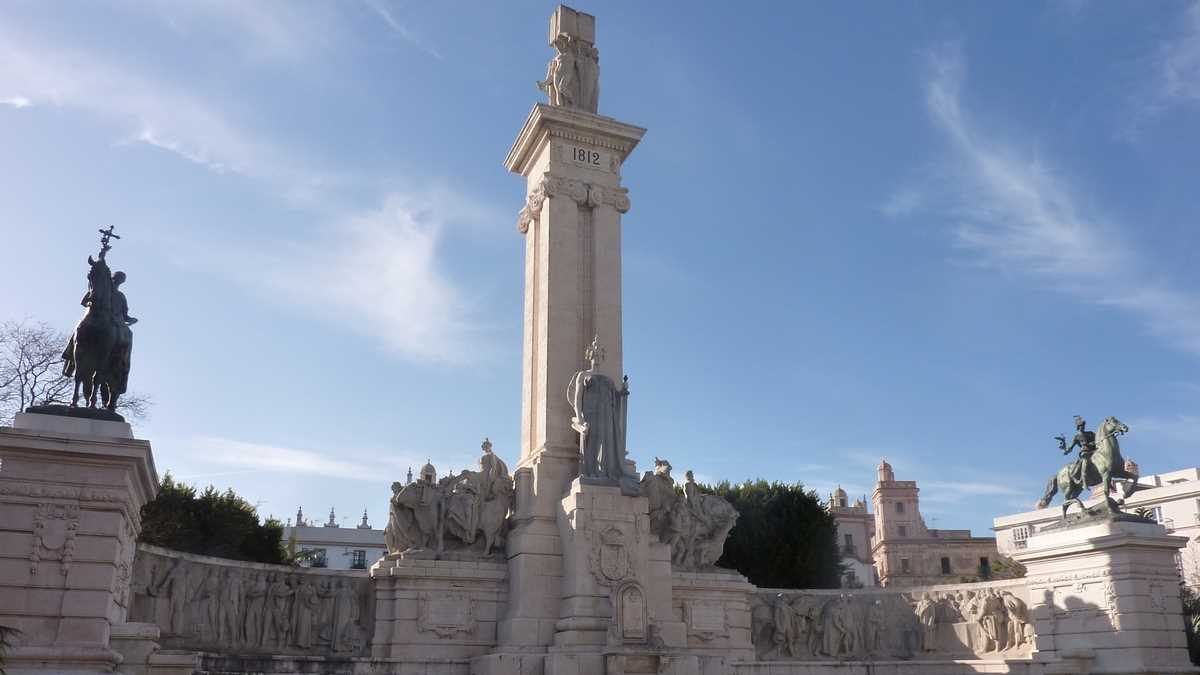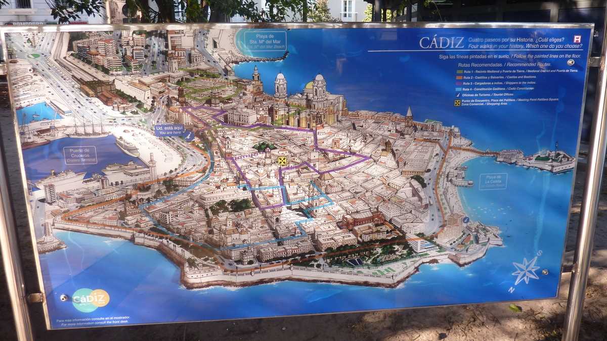 Opțional, după inspecția zecilor de metri de nisip umed părăsiți de apa refluxului, traseul galben continuă și pe faleza de sud, acolo unde poți fi spectatorul solitar al kilometrilor de plaje bătute de valuri, pînă cînd, undeva în spatele catedralei, o s-o iei, brusc, spre inima Orașului Vechi. Comutînd pe traseul mov, dacă nu te-ai pierdut în caroiajul străduțelor înguste, pietruite, dintre clădirile înalte, din Piața San Juan de Dios a Primăriei, cu palmieri, fîntînă arteziană și terase de la care se aud acordurile vreunui trubadur stradal și aplauze răzlețe, poți ajunge la capătul periplului în Plaza de España, la monumentul ridicat cu ocazia centenarului primei Constituții spaniole, documentul numărul 1 al națiunii semnat aici, în 1812.