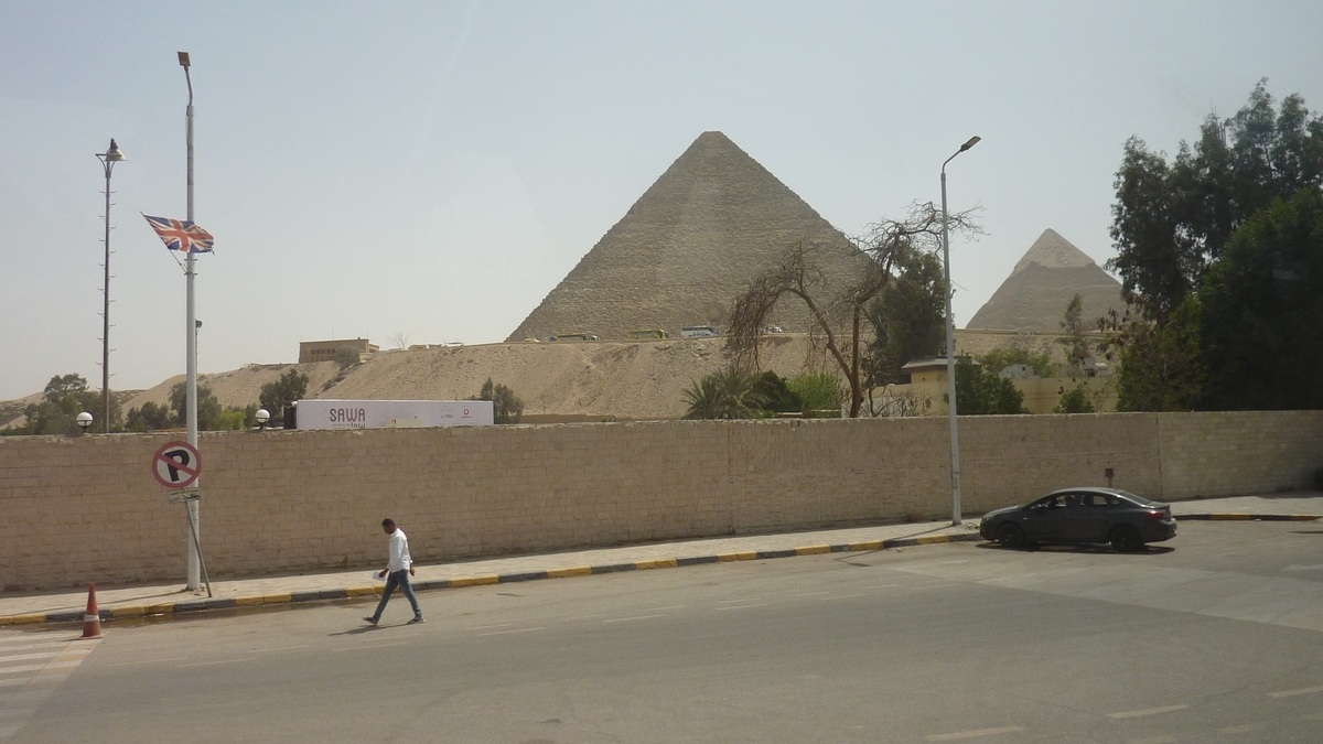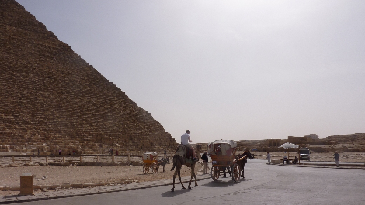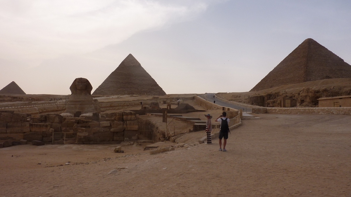 De Sfinx, aflat niște sute de metri mai încolo, nu te poți apropia mai mult decît pînă la gardurile care limitează accesul în zonă; oricum, poza cu Piramidele în fundal din manualul de Istorie se potrivește în cadru doar de la distanță. Alte imagini iconice pot fi reconstituite dinspre platforma de belvedere de pe partea cealaltă a complexului, de lîngă tarabele cu suveniruri și închirieri cămile cu ora. De la 350 de lire egiptene, în funcție de moment, număr de persoane și talentele de negociator ale fiecăruia.