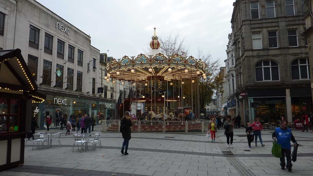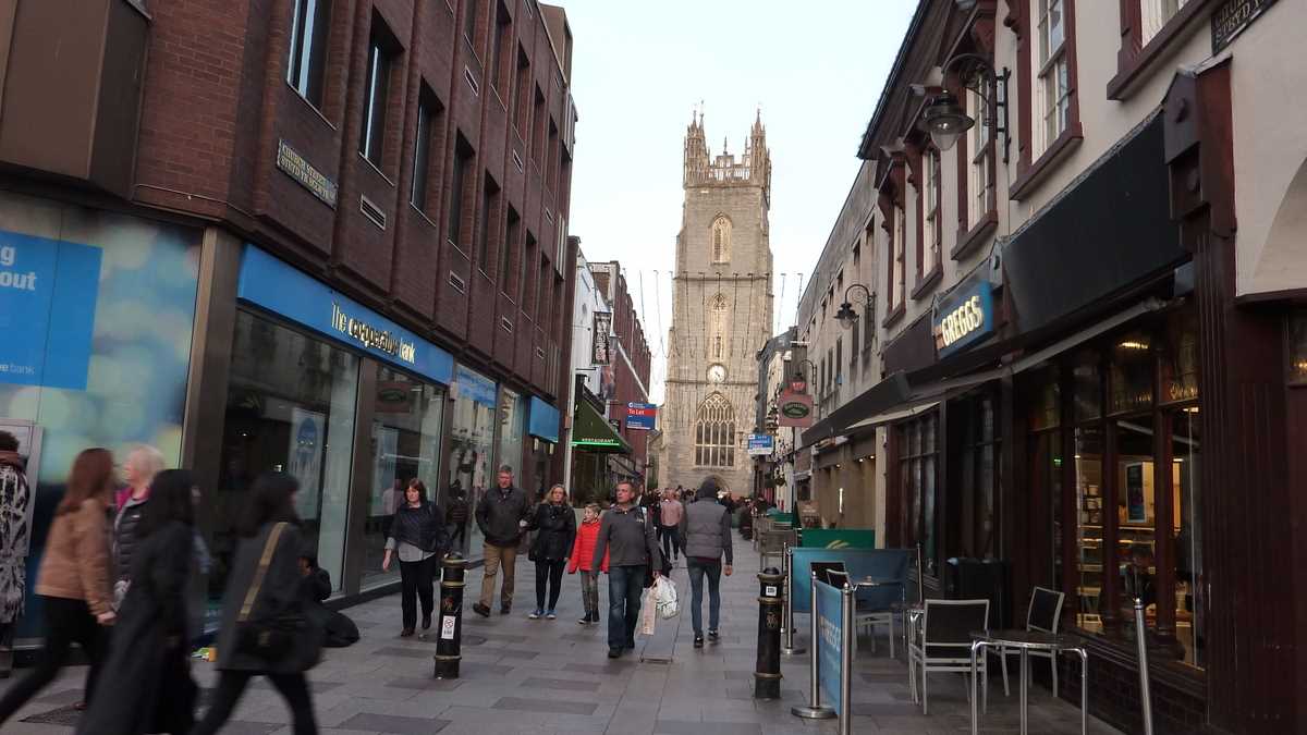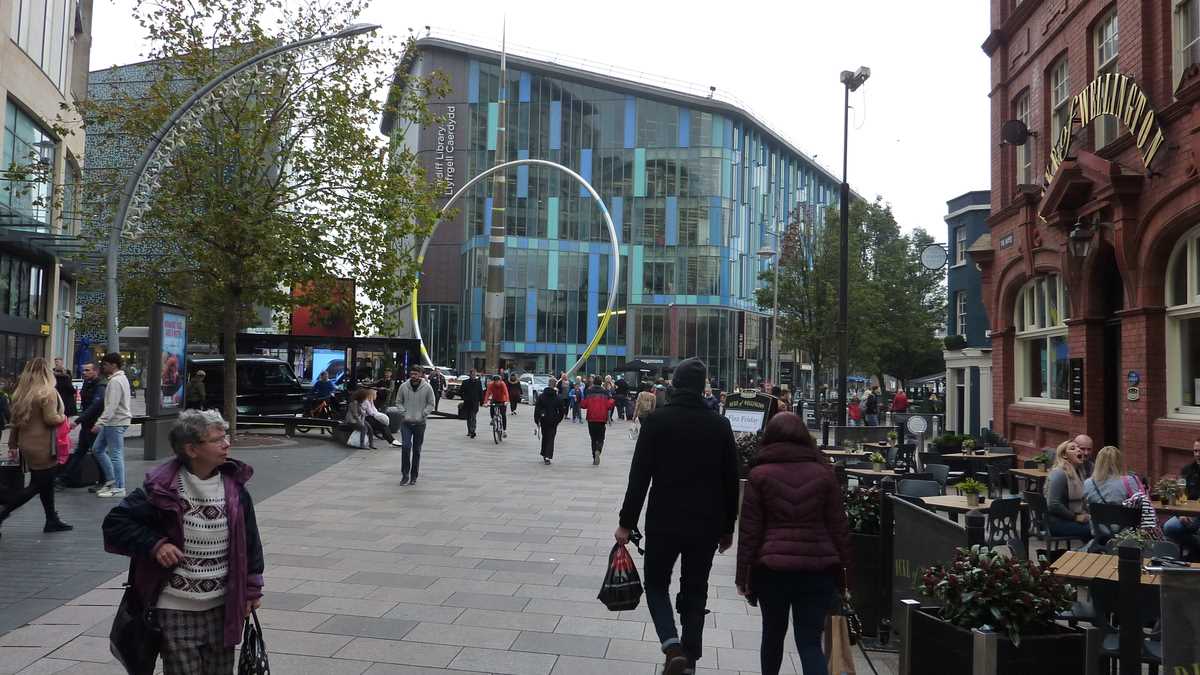 Orice sightseeing al peisajului urban regenerat în ultimele decenii cu clădiri moderne multietajate începe, desigur, cu arhitectura medievală a Castelului și continuă pe sub arcadele victoriene și eduardiene ale pasajelor dintre pietonalele de shopping centrale The Hayes, Queen Street și St. Mary Street. Nu atît prin buticurile de firmă găsibile prin mai toate orașele europene, cît prin, să zicem, Spillers Records, cel mai vechi magazin de discuri din lume, sau Cardiff Market, piața acoperită în care așteaptă să fie achiziționate o mulțime de chilipiruri. Atenție, cînd traversezi bulevardul, tot în dreapta trebuie să te uiți, ca peste tot în UK, ca să nu te calce cumva celebrul autobuz londonez cu etaj special închiriat pentru nuntașii căsătoriei lui Ryan cu Martin.