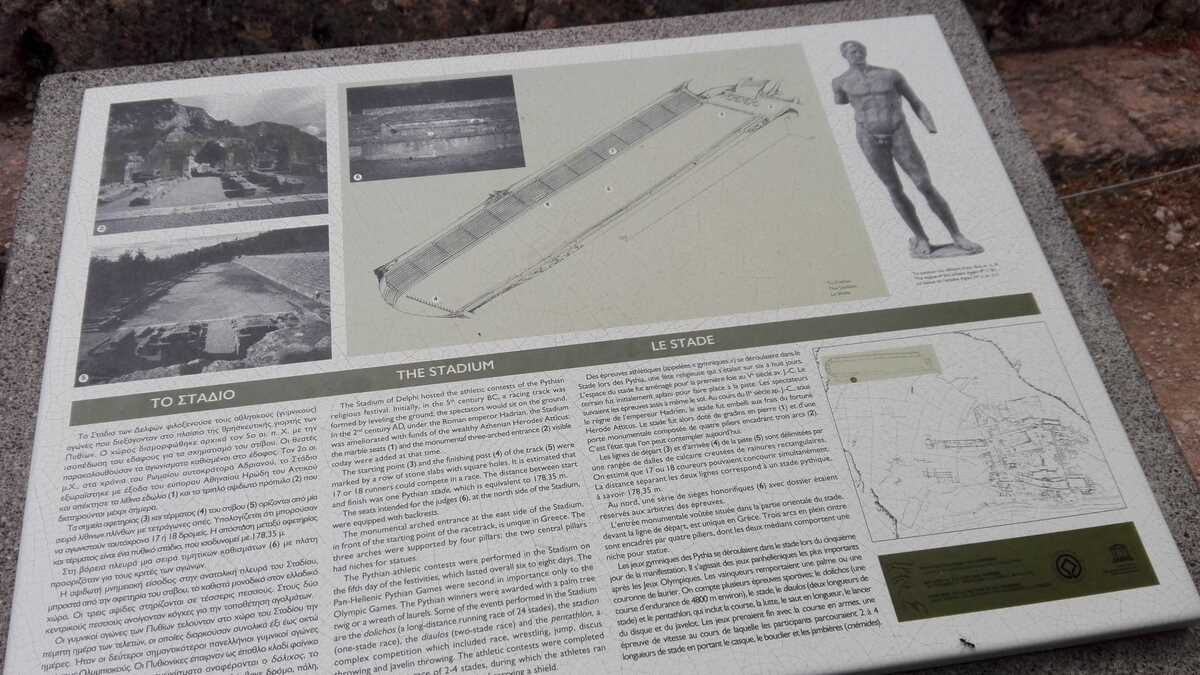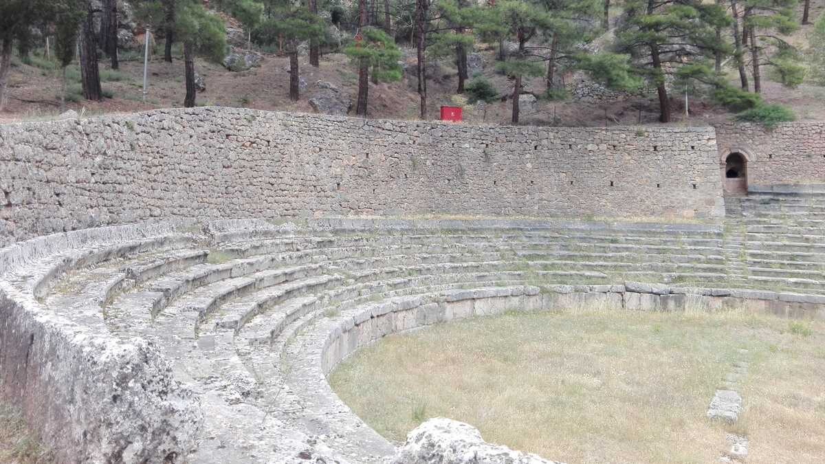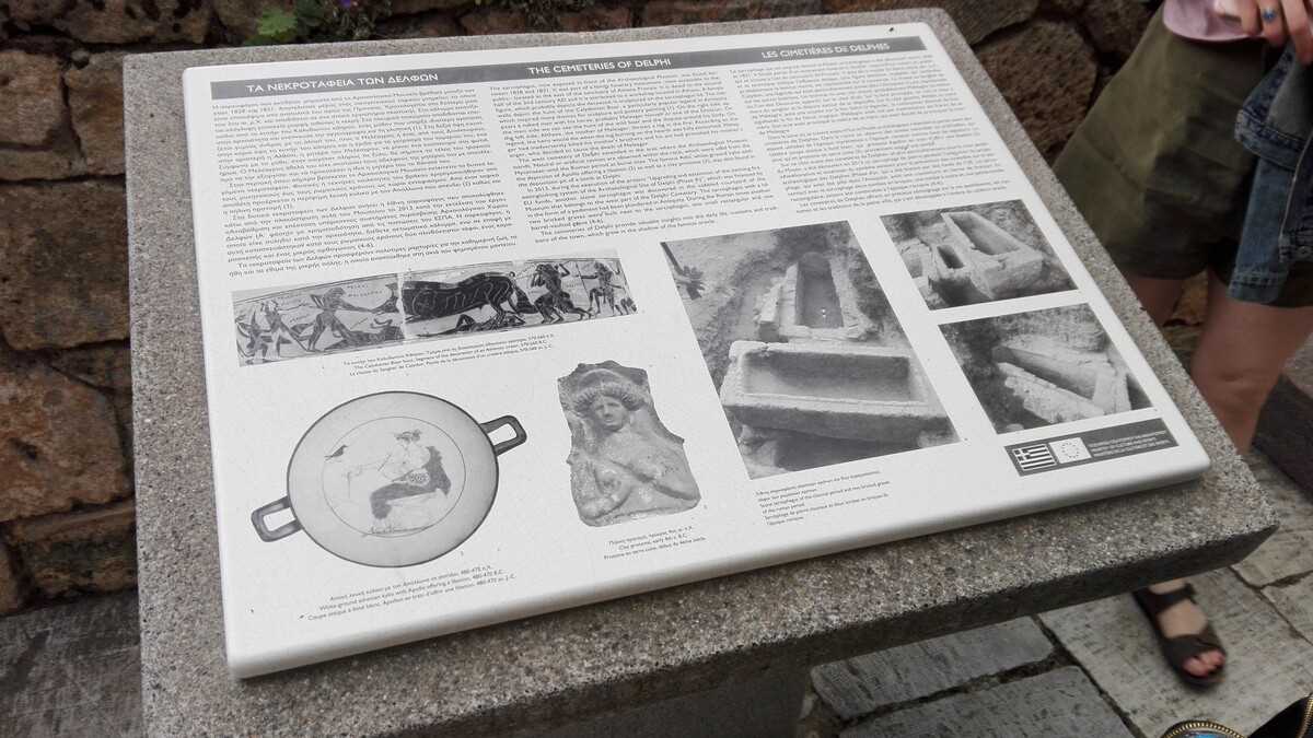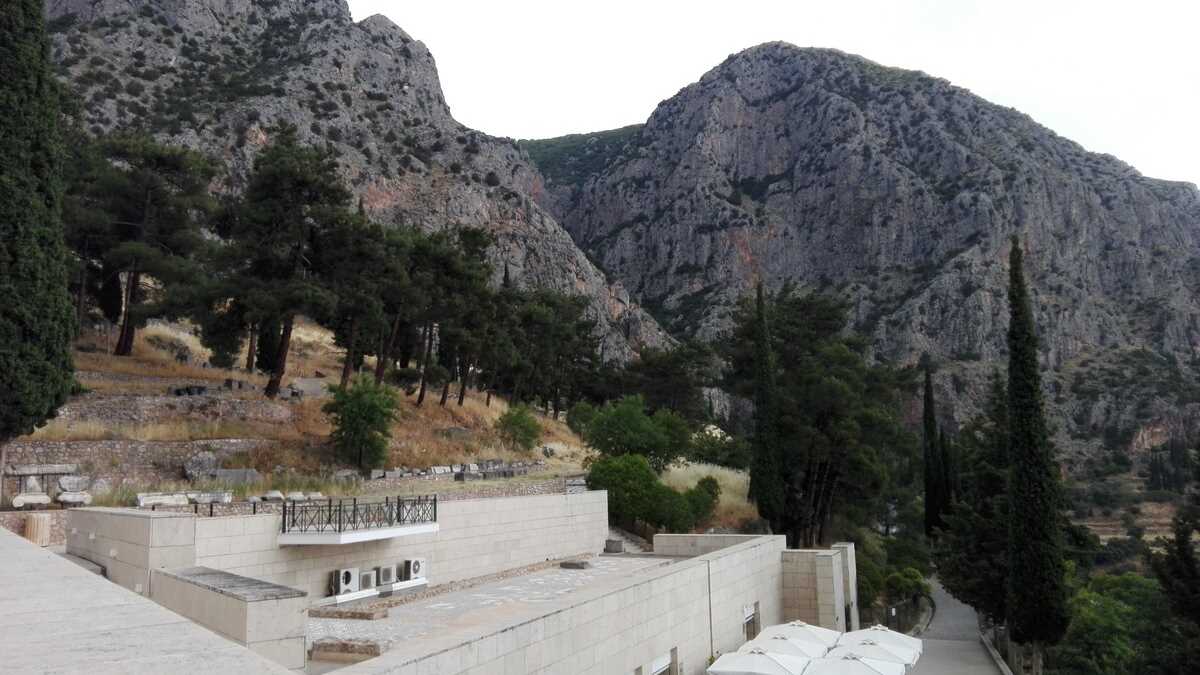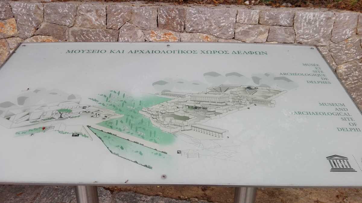 Astăzi, tot ce-a mai rămas din fostul centru al lumii este un amfiteatru de ruine la baza unui versant al muntelui Parnas, cu vedere în vale, printre pini și chiparoși drepți ca lumînarea, spre Golful Corint. În biletul de 12 euro ai incluse plimbarea pe aleea în serpentine care urcă pe lîngă pietre și rămășițe de coloane (ghidat de panourile cu desene explicative care, dacă vrei să știi cum arăta totul acum 2.500 de ani, îți testează din plin imaginația) și accesul în muzeul modern construit pe două niveluri, în stînga intrării parcului arheologic, unde sînt expuse toate artefactele originale dezgropate de-a lungul timpului, (fragmente de) statui și elemente arhitectonice.