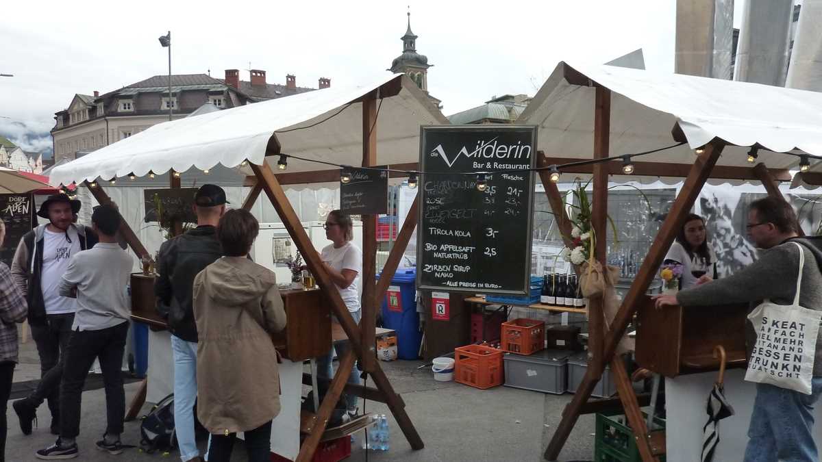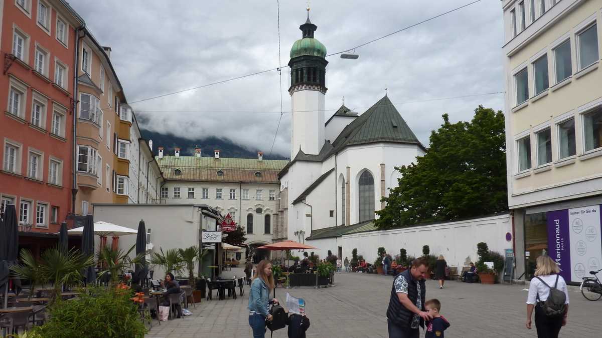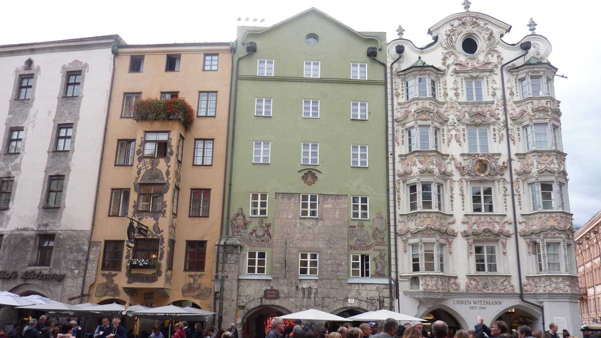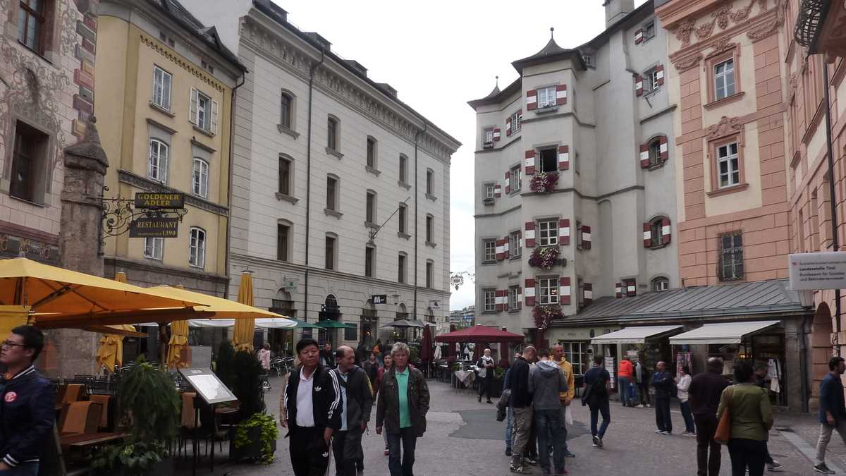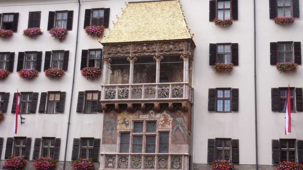 În pauza dintre cristiane, o s-o iei la pas prin oraș, fără schiuri, curios de ce-ar fi interesant de văzut în Podul de pe Inn. Cel mai probabil, la fel ca mine, pe malul rîului care curge la poalele Alpilor, ținînd firul apei, cu ochii la vilele de pe versant, pînă la podul principal Innbrücke care leagă Mariahilf, cartierul fațadelor de clădiri lipite una lîngă alta de peste rîu, cu centrul. Unul destul de mic și de adunat în jurul fostei reședințe imperiale Hofburg: cîteva piețe, un dom (Catedrala St. Jakob), un teatru (Landestheater), o columnă (Annasäule), un arc de triumf (Triumphpforte). În piațeta interioară a palatului Hofburg toate privirile sînt atrase de Goldenes Dachl, Acoperișul de Aur, simbolul orașului construit pe la 1500 pentru nunta împăratului Maximilian I cu Bianca Maria Sforza a Milano-ului, după alăturarea a 2.657 de foițe de cupru pe balconul de unde cuplul regal asista la diferitele spectacole de dedesubt (festival, turnir, execuții). În prezent, spectacolele se țin ceva mai încolo, în piața cu mese, bănci și tarabe cu vin/bere pentru trecătorii de pe malul Inn-ului: concertele ad-hoc pe ritmuri tiroleze ale unor instrumentiști stradali îmbrăcați în costume populare.