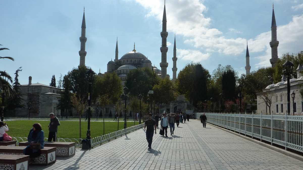 Cu un ochi aruncat periodic pe harta primită de la hostel și cu faze din romanul lui Vintilă Corbul în cap, mi-am început explorarea istorică, cronologic, cu o inspecție pe coasta sudică de la litoralul Mării Marmara, la ce-a mai rămas din defensiva bizantină a momentului 1453: ruinele palatului Bucoleon și o porțiune din zidurile ridicate pe timpul împăratului Theodosius al II-lea (408-450). Am urcat apoi din nou în oraș, trecînd printr-un bazar și pe lîngă sofalele cu narghilea ale unor cafenele, ca să ajung la celebra moschee Sultanahmet (nume de scenă: Albastră), singura din oraș cu șase minarete. În furnicarul de lume din fața ei, un negustor încerca foarte amabil să-mi vîndă un covor. Man, come on, nu te uiți la mine: unde să-l pun, în ghiozdan? No problem: I’ll deliver it by DHL. L-am lăsat cu carpetele lui și m-am îndreptat spre intrarea specială pentru turiști din lateral dreapta (Blue Mosk poate fi vizitată gratis), depășind zona cu robinete unde enoriașii se spală pe picioare, înainte de rugăciune. Din curte, o coadă pe două rînduri te conduce pînă în sala mare plină de curioși în șosete care pășesc uimiți pe covoarele groase, cu sacoșa cu încălțări într-o mînă și cu ochii pe sus, spre boltele înalte placate cu mozaic, în care cel albastru iese cel mai mult în evidență.