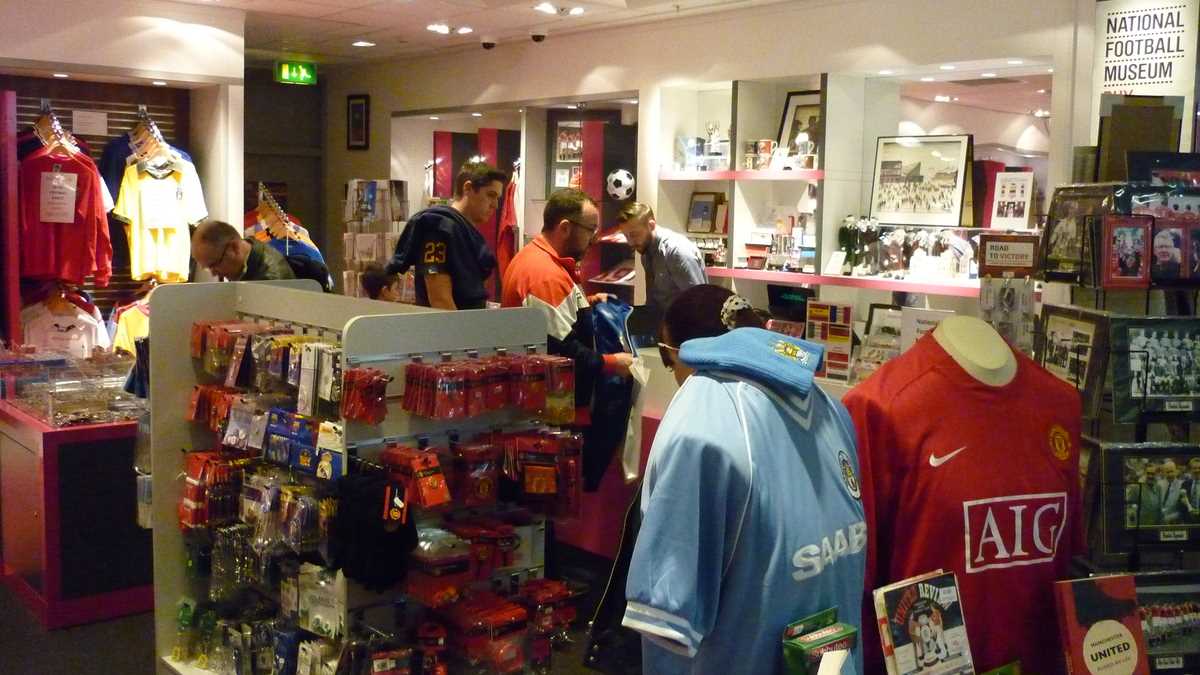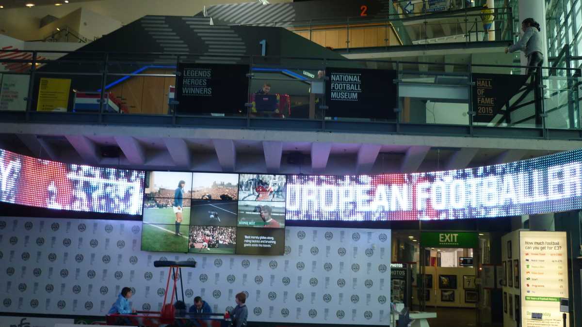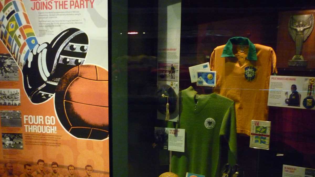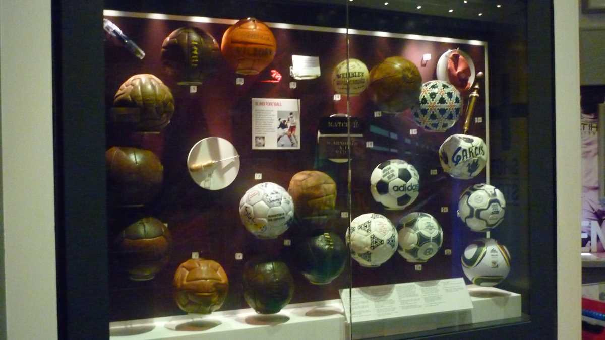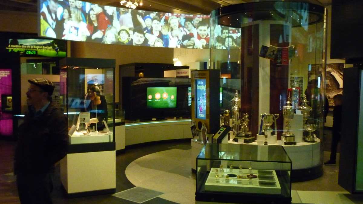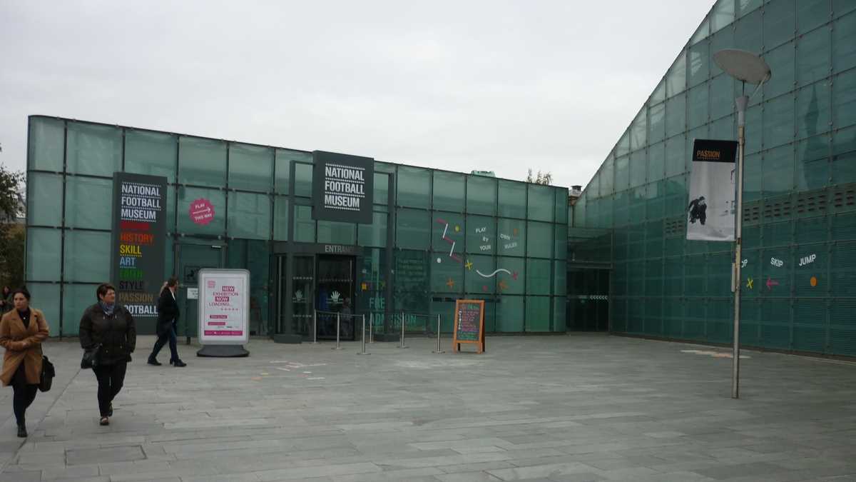 Chiar la intrarea în clădirea futuristă construită în scară, pe cinci niveluri, ești întîmpinat de un podium pe care poți să fabrici momentul în care ai ridicat deasupra capului trofeele fotbalului englez și, în memoria camerei foto, o să ai și dovada performanței de a plăti doar 3 lire pentru o poză cu cupele-replică. Aproape un întreg etaj este alocat, desigur, celor două echipe-fanion ale Manchesterului, United și City, dar și echipei naționale. Pregătește-te, deci, să fii spectatorul unor povești memorabile istorisite de diversele artefacte din vitrine; de exemplu, doar mingea finalei World Cup din 1966, singurul campionat mondial cucerit de englezi, acasă, pe vechiul Wembley, ar putea spune dacă a trecut sau nu linia porții în partida aia celebră de acum 50 de ani cîștigată în prelungiri cu 1-0. Doamnele microbiste se vor delecta cu o paradă a modei echipamentului sportiv de-a lungul timpului: de la puloverul din perioada romantică a fotbalului purtat în 1872 de englezul Arnold Smith la Anglia-Scoția, primul meci internațional ever, sau tricourile clasice ale unor jucători mai mult sau mai puțin necunoscuți, gen Pelé sau Maradona, la costumul accesorizat cu senzori purtat de Messi pentru computerizarea mișcărilor sale în jocul FIFA 16.