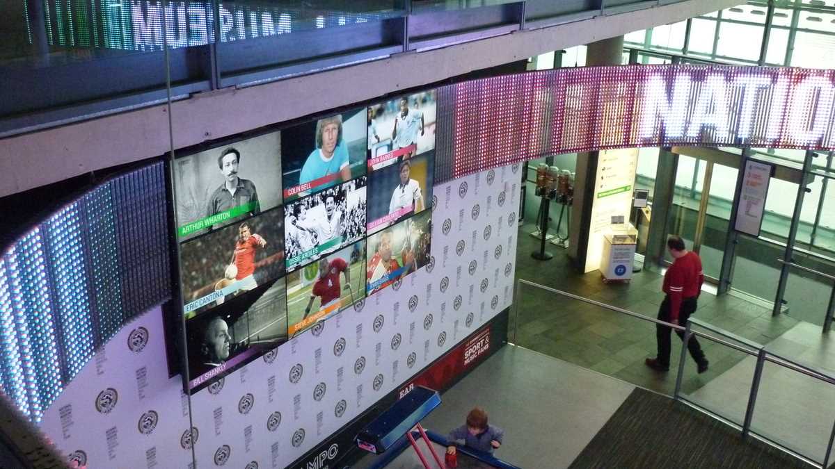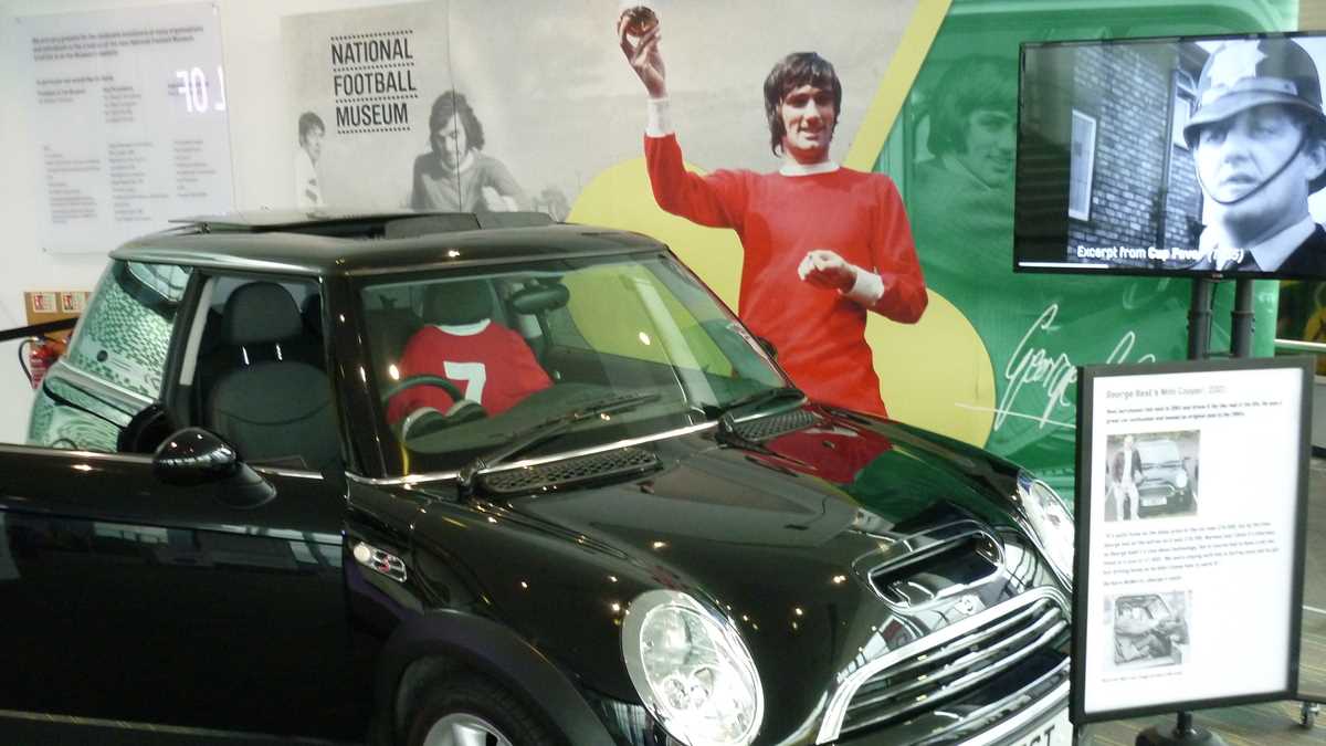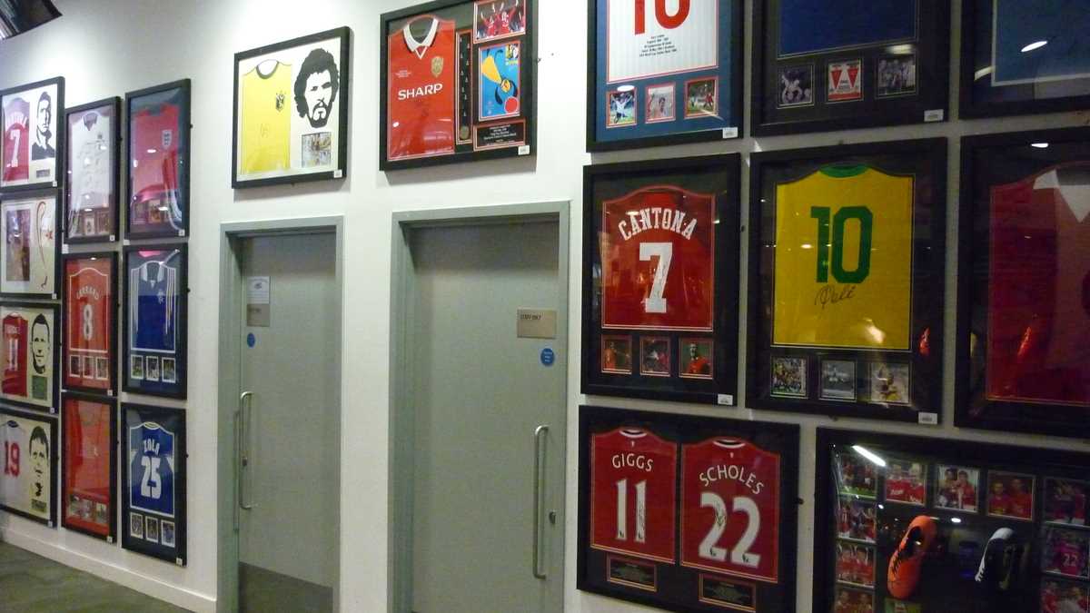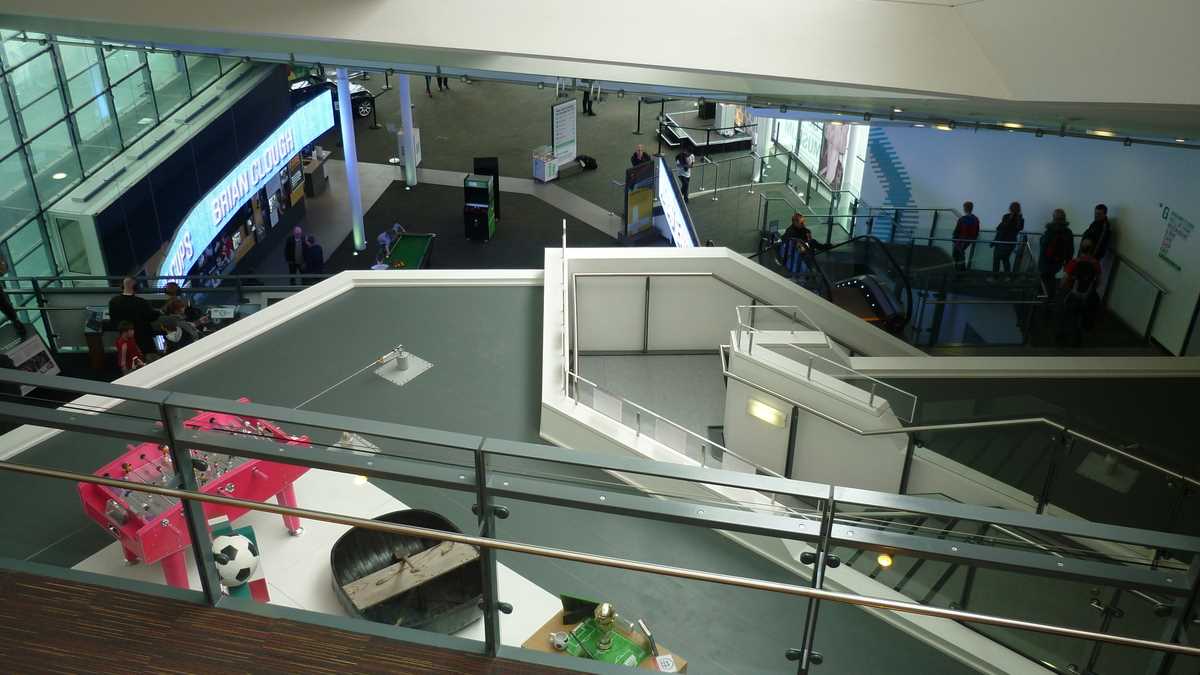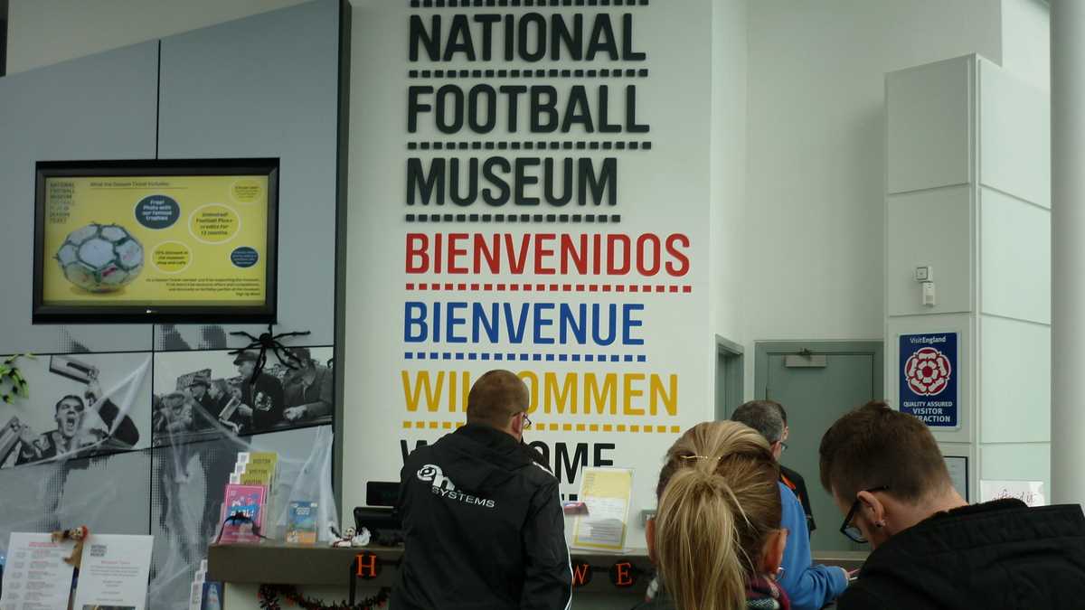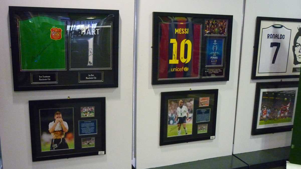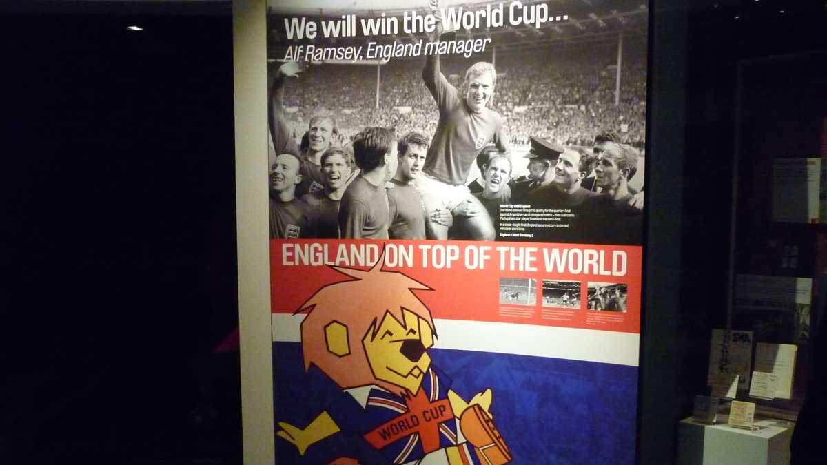 Chiar la intrarea în clădirea futuristă construită în scară, pe cinci niveluri, ești întîmpinat de un podium pe care poți să fabrici momentul în care ai ridicat deasupra capului trofeele fotbalului englez și, în memoria camerei foto, o să ai și dovada performanței de a plăti doar 3 lire pentru o poză cu cupele-replică. Aproape un întreg etaj este alocat, desigur, celor două echipe-fanion ale Manchesterului, United și City, dar și echipei naționale. Pregătește-te, deci, să fii spectatorul unor povești memorabile istorisite de diversele artefacte din vitrine; de exemplu, doar mingea finalei World Cup din 1966, singurul campionat mondial cucerit de englezi, acasă, pe vechiul Wembley, ar putea spune dacă a trecut sau nu linia porții în partida aia celebră de acum 50 de ani cîștigată în prelungiri cu 1-0. Doamnele microbiste se vor delecta cu o paradă a modei echipamentului sportiv de-a lungul timpului: de la puloverul din perioada romantică a fotbalului purtat în 1872 de englezul Arnold Smith la Anglia-Scoția, primul meci internațional ever, sau tricourile clasice ale unor jucători mai mult sau mai puțin necunoscuți, gen Pelé sau Maradona, la costumul accesorizat cu senzori purtat de Messi pentru computerizarea mișcărilor sale în jocul FIFA 16.