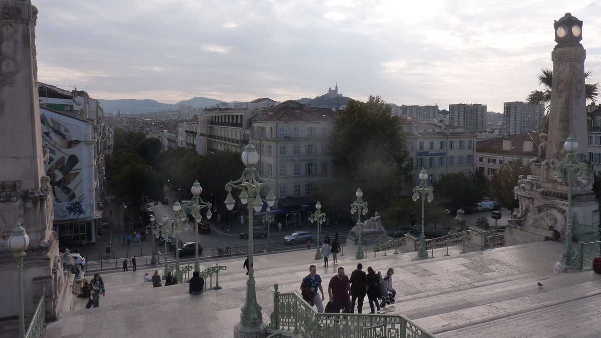Avionul low-cost-ului irlandez decolat de pe Otopeni debarcă pasagerii la capătul dinspre uscat al pistei-ponton care se termină în mare, undeva la vreo 25 de kilometri nord-vest de Marsilia, la marginea orășelului mediteraneean Vitrolles. Transferul rutier către metropolă așteaptă clienți la peroanele din fața terminalului: autobuzul 91, un autocar care, pentru 10 euro, te duce, în vreo jumătate de oră de trafic normal, pînă la autogara lipită de gara principală Marseille Saint-Charles. Tot acolo ajungi, ceva mai ieftin (6,20 euro), și cu trenul, dacă n-ai bagaj mai mare de-un rucsac și nu te deranjează să mergi pe jos vreo doi kilometri pînă la gara aeroportului cu oraș. (Am ales varianta asta, mai mult din curiozitatea de a explora zona, decît tentat de diferența de preț rămasă în buzunar, un mărunțiș cu care nu bei nici măcar o bere în cîrciumile centrale din Marsilia.) Trenul e rapid, are vagoane curate și merge lin, fără zguduiturile și zdrăngăniturile cu care te-a obișnuit CFR-ul că s-ar circula pe șine. În vreo 20 de minute, după opriri scurte în trei stații, ești în Marseille Saint-Charles, o clădire imensă, veche de vreo două secole, deosebită din punct de vedere arhitectonic. Treptele flancate de statui ale piațetei din fața gării te duc chiar cu gîndul la iconica scenă din Crucișătorul Potemkin.