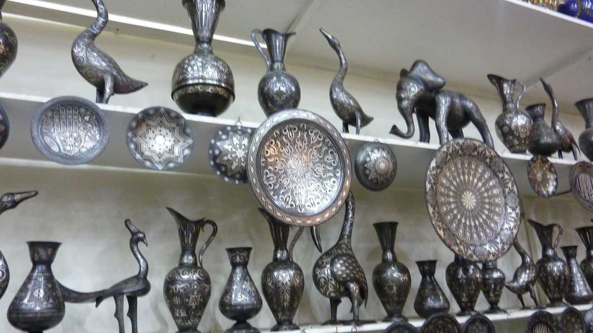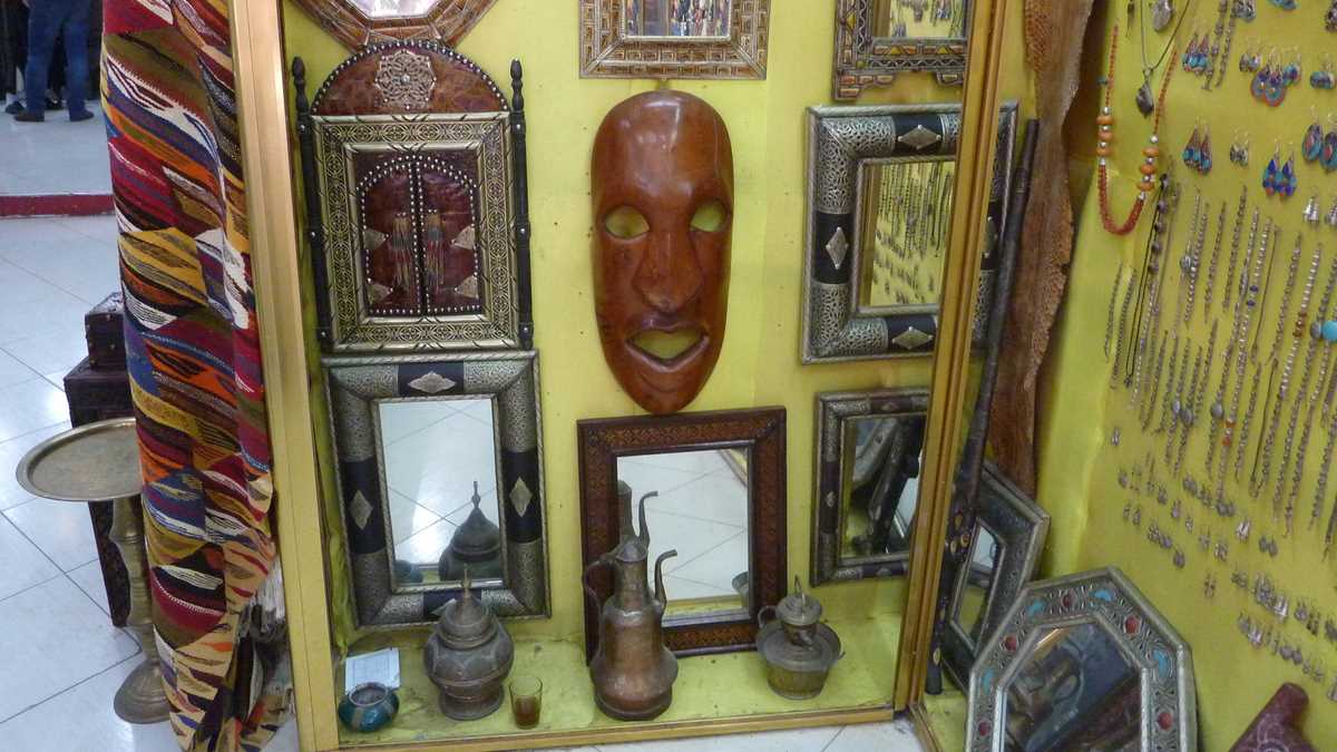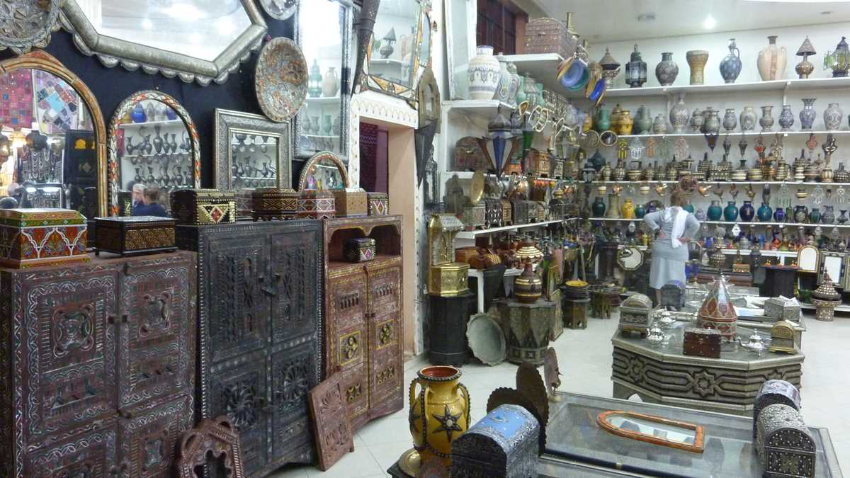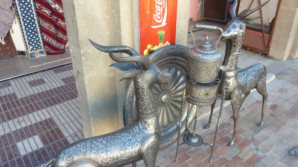 După prînzul tîrziu într-un restaurant din medina, slalomînd printre carpete și covoare berbere scoase la licitație în stradă, ghizii ne-au dus în magazinul de artizanat pompos botezat Palais des Arts et Traditions. Pentru vizitarea expoziției de ceramică de Meknes încrustată cu fir de argint (într-un colț, un nene bătea, demonstrativ, cu ciocănelul, sîrmă pe suprafața unei farfurii), vase, pumnale, hangere, săbii, bijuterii și tot felul de obiecte decorative, de la rame și măști la cămile și cai la scara 1/2. Chiar dacă prețurile finale de vînzare pot ajunge prin negociere la 30-40% din cele cerute inițial, fiind setate pe bugete turistice occidentale, pentru buzunarele românești, tot mari rămîn.