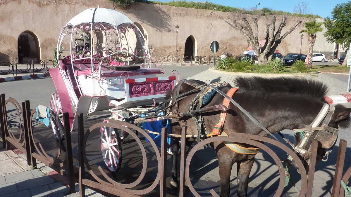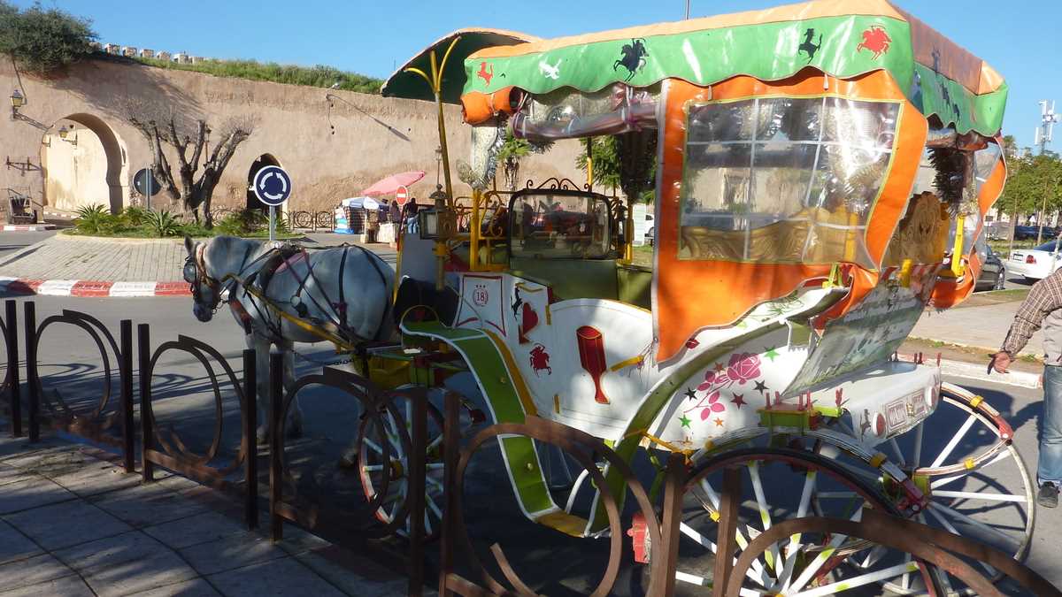 Judecînd după locurile pe unde ne-au plimbat gazdele, Meknesul arată civilizat și verde. Periplul nostru prin oraș a trecut pe la Bassin de l’Agdal, bazinul-rezervor de patru hectare pentru timpuri de secetă sau asediu; de la distanță, de pe pod, ni s-au arătat, peste oglinda iazului, hambarele și grajdurile sultanului Moulay Ismail (1672-1727), cel care și-a stabilit capitala aici. Apa bazinului irigă și grădinile regale, parcul superb înconjurat de zidurile palatului alăturat, în care relativ recent s-a amenajat un teren de golf deschis publicului – dacă achiți cotizația anuală de membru de vreo mie de dolari, poți să-ți faci programare și să joci cînd vrei (mai puțin lunea), inclusiv în nocturnă. Pe bulevardele largi trasate de-a lungul nesfîrșitelor ziduri sparte de multele porți ale orașului vechi, Logan-uri, Duster-uri și Lodgy-uri se amestecă în trafic cu trăsurile turistice al căror coviltir are culori și forme extrem de originale, de la decapotabilă la pagodă, în funcție de gusturile estetice ale proprietarului. Există în ofertă chiar și caleașca roz cu care Cenușăreasa s-a deplasat la bal.