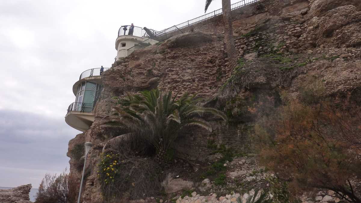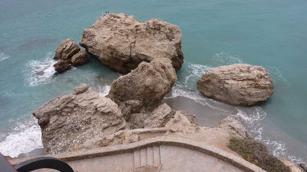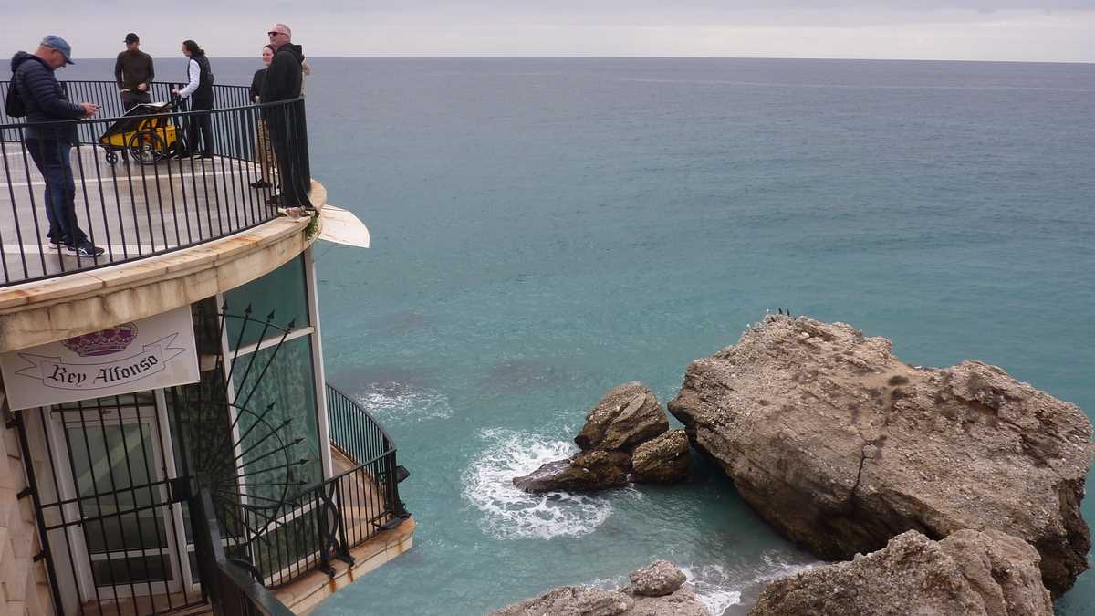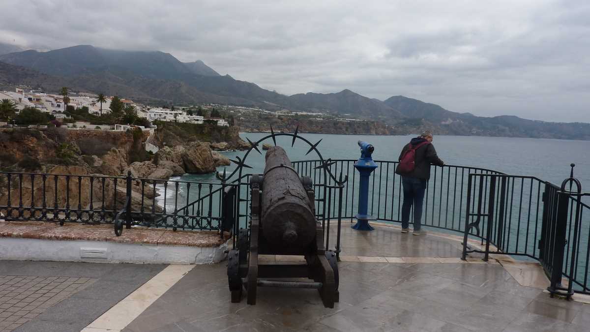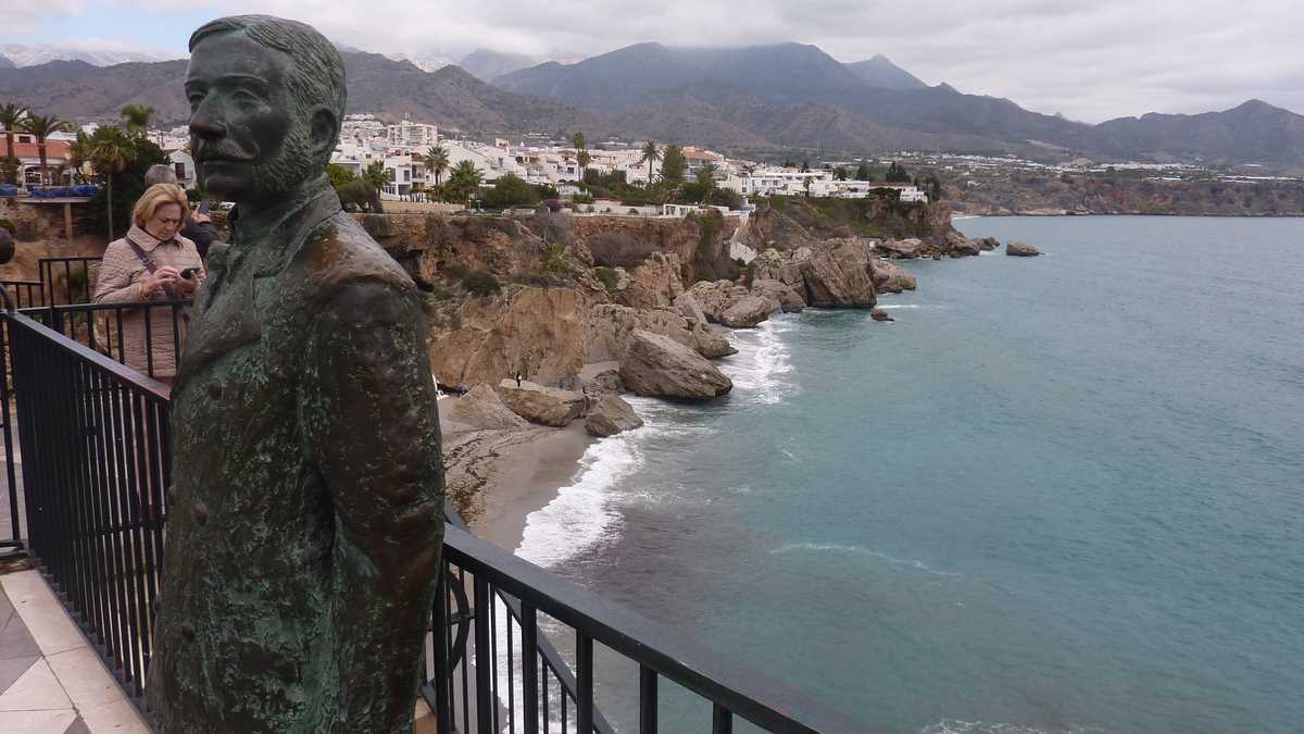 Ai ajuns la destinație, da. Balcón de Europa, loja pavată cu gresie de pe acoperișul unui restaurant cu pereți circulari din sticlă construit pe capătul superior al unui mic promontoriu, la vreo 15-20 de metri deasupra valurilor Mediteranei. Din turnul de observație maur, care, ceva mai tîrziu, spre sfîrșit de Ev Mediu, a servit și ca bastion de apărare împotriva atacurilor navale, au rămas doar două tunuri ruginite cu care mai fac shooting-uri doar turiștii cu aparat foto agățat de gît. Naș i-a fost, cică, după vizita aici din 1885, însuși regele Alfonso al XII-lea al Spaniei. Chiar domnul din bronz care stă țeapăn, sprijinit de balustradă, pozînd live, pentru trecătorii mesmerizați de loc, și înregistrat, în toate selfie-urile lor. Pentru o imagine completă, landscape și portret, Balcón-ul de la aproximativ etajul 5 al acestui impresionant bloc stîncos european trebuie văzut neapărat și de jos, de la parter, nivelul aleii care trece fix pe dedesubt, și din profil, de pe sălbaticele plaje alăturate mărginite de bolovani colțuroși.