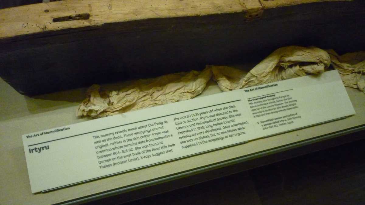 Pentru alte războaie te deplasezi la următorul muzeu, Great North Museum: Hancock, la care ajungi trecînd prin Chinatown și pe lîngă stadionul St James’ Park. Cam jumătate din parter este anglo-saxon (după retragerea romană din insulă de la 410, Newcastle a făcut parte vreo cîteva sute de ani din regatul anglo-saxon Northumbria), teritoriu preluat ostil, dacă stai să judeci după mulțimea de platoșe, sulițe, scuturi, coifuri. Etajul e ocupat pașnic de egipteni, greci, romani și alte statui sau relicve arheologice. Aici locuiește și mumia lui Irtyru, o egipteancă de vreo 30-35 de ani care a trăit, pînă să se mute la Newcastle, în Teba anilor aprox. 664-525 îC.