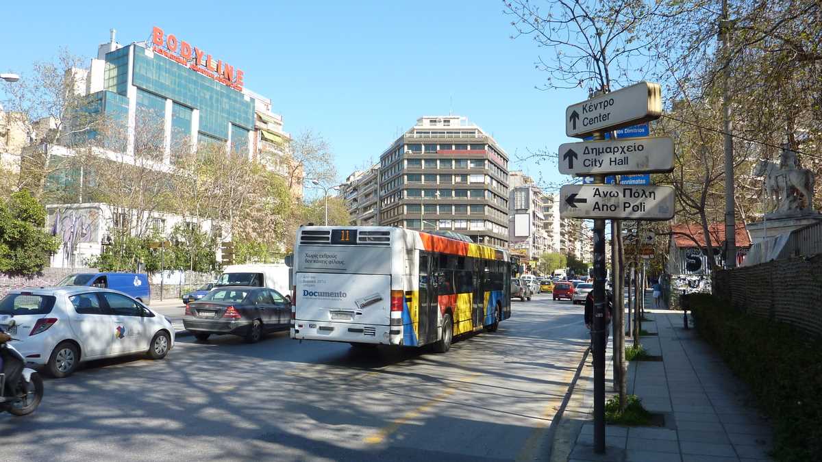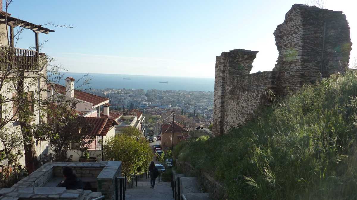 Dacă vrei să-l vezi și de deasupra, odată întors înapoi în centru, obosit de-atîta mers pe jos și flămînd ca un călugăr în zi de post, o să cumperi, în stația din Piața Eleftherias, un bilet de autobuz (1 euro) și un gyros de pui (3 euro) și-o să-l iei pe 23, pînă la capăt. Autobuzul ăsta urcă străduțele spre Ano Poli, Orașul Vechi (sau Orașul de Sus), cartierul neafectat de marele incendiu de fix acum o sută de ani care a devastat o bună parte a Salonicului. Paradoxal, aia mai apropiată de apă.