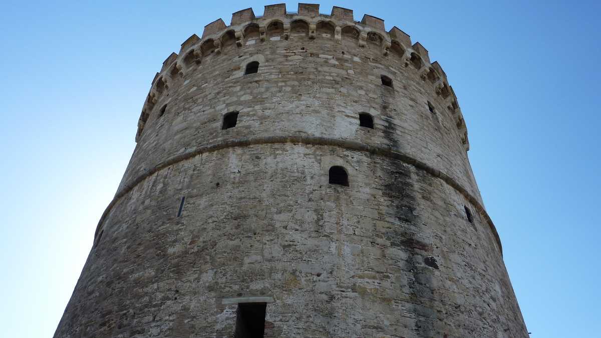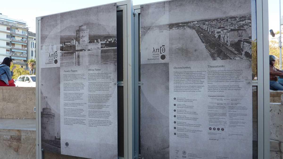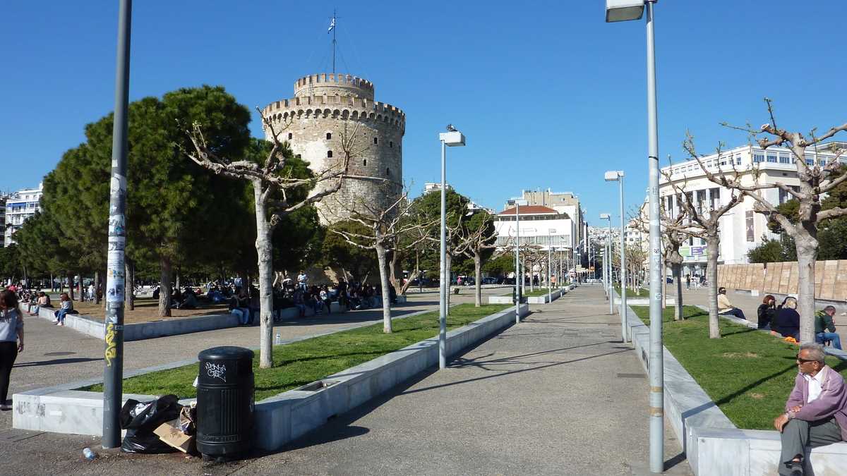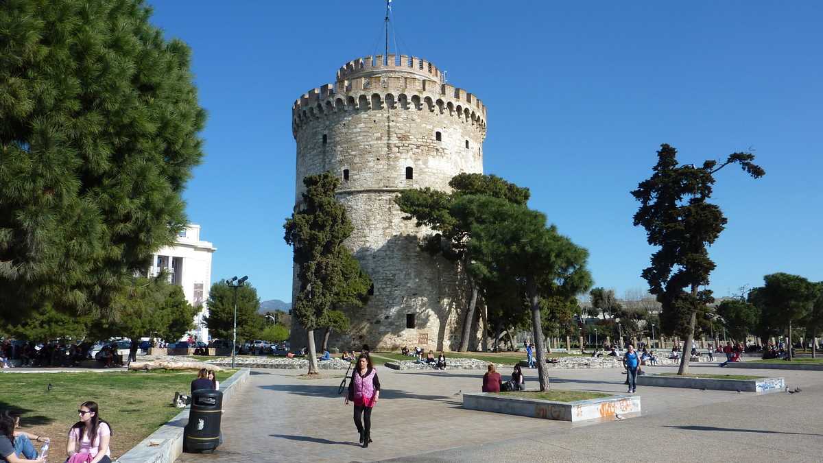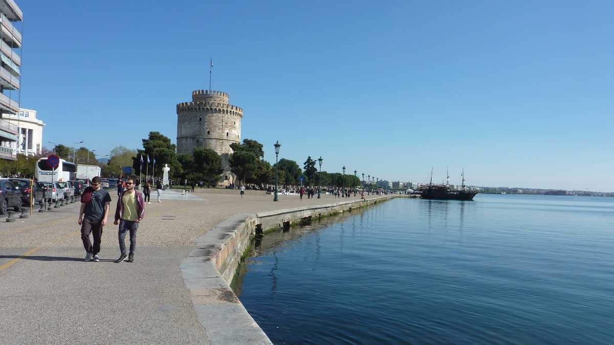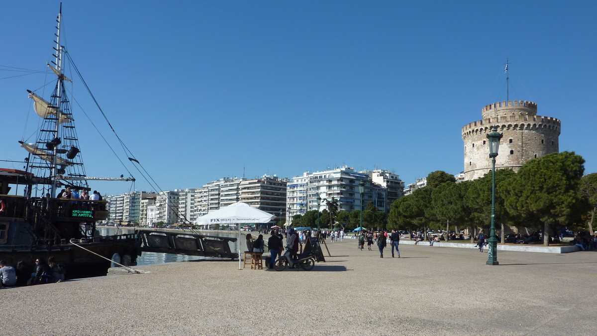 Chestiile astea pot fi citite prin broșurile centrului de informare turistică, pe care îl găsești într-un acvariu din sticlă fumurie plantat în centru (nu-i foarte departe: la ieșirea din gară, faci stînga, mergi cale de vreo trei-patru intersecții și apoi o iei la dreapta, spre mare), în Piața Aristotelous, o esplanadă imensă despărțită de faleză de un bulevard foarte circulat. Dacă tot ai ajuns aici, probabil că o să te ții și tu după lumea care se îndreaptă, călcînd în picioare – agale, a plimbare – cei doi-trei kilometri ai fîșiei de beton a țărmului, spre simbolul orașului, Turnul Alb, singura parte a fortificațiilor bizantine din port rămasă cît de cît intactă, care se vede din orice punct al falezei. În fața turnului e acostat vasul-bar Arabella, pe care te poți îmbarca gratis (trebuie să fii pregătit, însă, pentru o consumație minimă obligatorie: berea mică, la 330 ml, costă 5 euro). Cînd nu pleacă în larg: din oră-n oră, de la prînz pînă tîrziu în noapte, vasul pornește într-o croazieră de 30 de minute în jurul golfului, prilej pentru consumatorii de la bord de a vedea orașul din toate unghiurile, de pe mare.