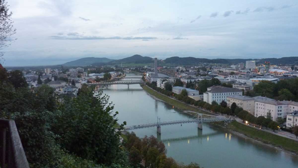 Dacă vrei să-l vezi și pe ăsta de sus, cobori înapoi în centrul istoric, ții pînă la capăt pietonala cu magazine de firmă și faci dreapta ca să dai de turnichetul de acces (3,80 euro) la lifturile care, în 30 de secunde, te duc la platforma muzeului de artă modernă Mönchsberg de pe vîrful dealului omonim, pentru o altă panoramă a orașului, dar din alt unghi. Cînd am ajuns acolo, soarele abia asfințise și mulțimea rezemată de balustradele de piatră ale terasei din fața muzeului privea în jos spre spectacolul orașului. Grupul de oameni îmbrăcați la patru ace care părăsise un restaurant de lux ca să încheie cina cu un desert vizual mi-a confirmat intuiția că ăsta ar fi locul și momentul perfect pentru o ultimă vedere cu luminile orașului, înainte de plecare.