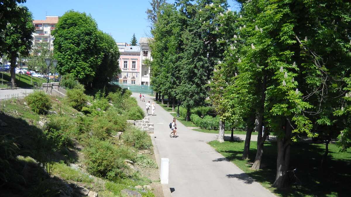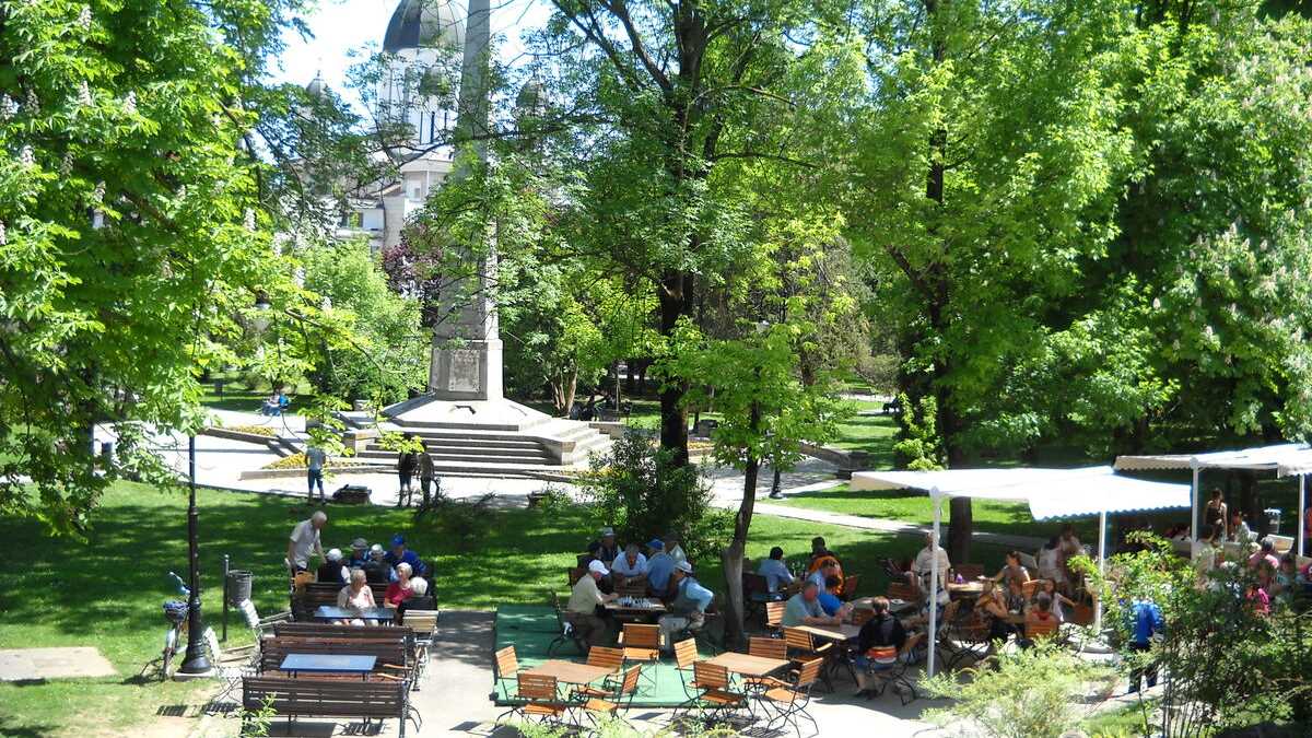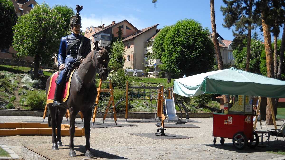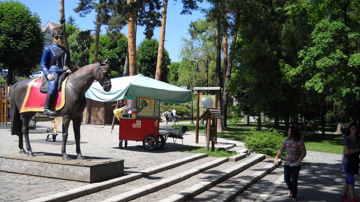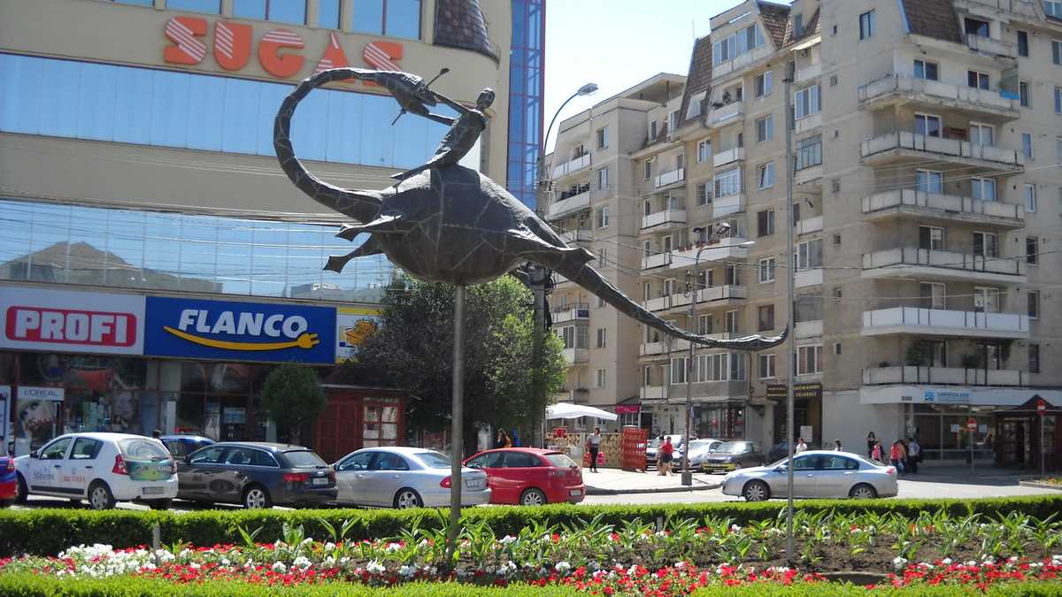 N-a durat prea mult pînă să ajung în centrul mic, în care patronul orașului ucide un balaur în scuarul din fața magazinului universal, scuze, mall-ului Șugaș – cel puțin asta-i interpretarea oficială dată structurii metalice stilizate în care un individ călărește un fel de dinozaur. Cinci minute mai tîrziu, după ce-am trecut pe lîngă casa care adăpostește expoziția cinegetică a Ținutului Secuiesc (închisă la ora aia), mă plimbam prin parcul liniștit și curat Erzsébet/Elisabeta, între obelisc, podețul cu balustradă din fier forjat peste un iaz cu pești, pavilionul fanfarei și husarul pe cal care supraveghează zona de joacă a copiilor. Din parc, dacă urci niște scări, o să ajungi într-o piață, la o altă statuie ecvestră: Mihai Viteazul, înconjurat de niște secui pedeștri.