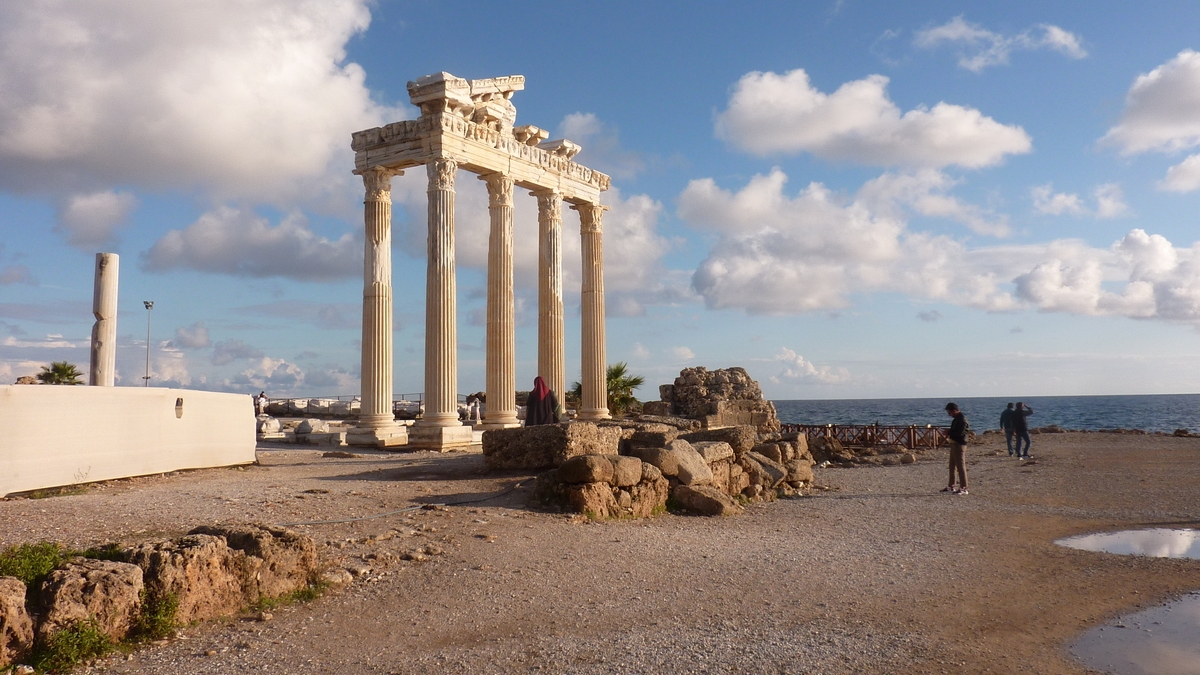 Pentru plictisitul de istorie care n-a luat-o pe jos printre resturi de ziduri și coloane, la vizionat de pietre vechi și la citit panouri explicative, există tractorașul turistic care pleacă din parcarea autocarelor și te duce pe repede-înainte prin două milenii de istorie în cîteva minute, pînă la partea mai modernă a sitului, cea apropiată de mare a peninsulei. Din piațeta cu statuia lui Atatürk în centru a falezei largi dintre palmieri, dacă o iei în stînga, cum te uiți la apă, ajungi la Templul lui Apollo, din care-au mai rămas în picioare doar cinci coloane unite de o bucată de fronton. Dacă nu te-ai oprit pe la vreo terasă sau n-ai urcat deja într-unul din vaporașele care te îmbie cu oferte (25-30 de euro, pauză de înot și masă incluse) de văzut Side și din larg. (Pe o barcă dintr-asta ne-am urcat și noi. Dar nu aici și nu acum. Ceva mai tîrziu, la Manavgat, pentru o croazieră pe rîul cu același nume, pînă la vărsarea sa în mare, printre corăbii cu zeități acvatice, dragoni sau pirați atîrnați la prora, acostate într-un stufăriș ca de Deltă.)