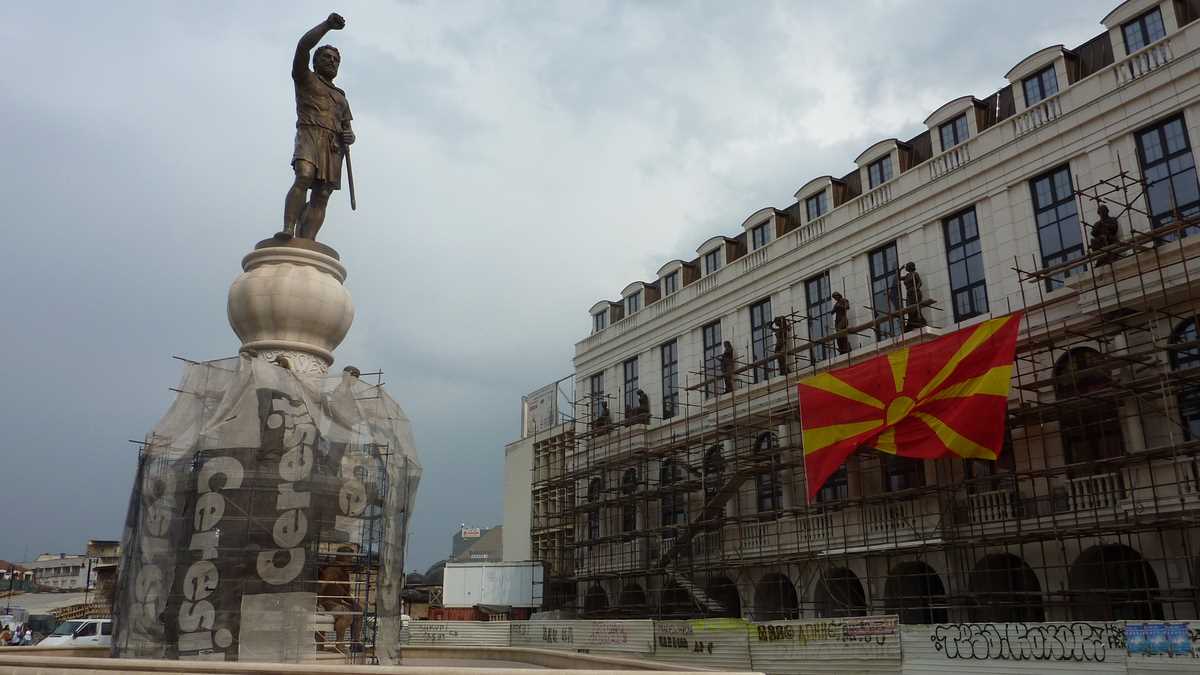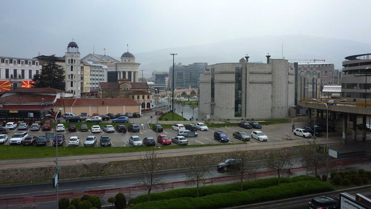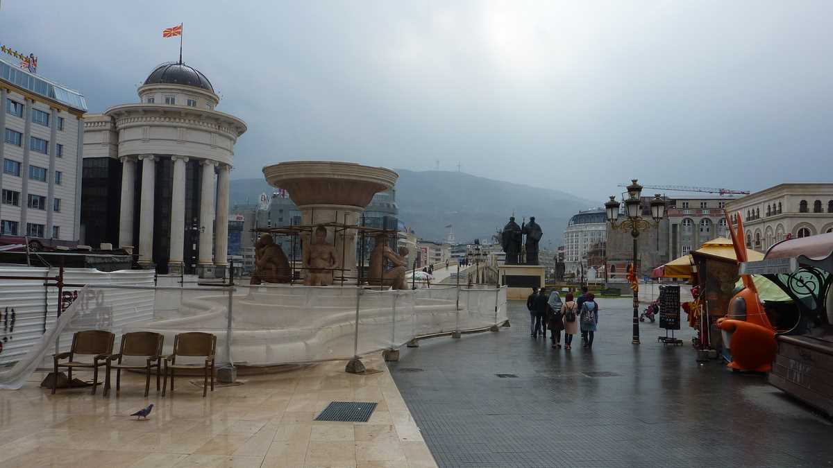 Rezumînd, plecați din București, vineri la prînz, și, din Sofia, dimineață la 9,30, intram în capitala Macedoniei, sîmbătă, pe la 2 după-amiază, ora locală (Macedonia ține timpul pe vechi, odată cu ora Europei Centrale). Orașul, aproape complet distrus de un teribil cutremur în 1963, s-a repopulat în principal cu blocurile comuniste ale perioadei iugoslave, centrul fiind recent reconstruit într-un stil istoric de un kitsch monumental care a umplut malurile și podurile peste rîul Vardar cu sute de statui ale unor personalități locale mai mari sau mai mici (probabil că fiecare familie de macedonean are un reprezentant aici). Un proiect naționalist de un fake spectaculos, marcat cu drapelul galben-roșu pe aproape fiecare turn sau fațadă: sub grandoarea coloanelor – cică, de pe vremea lui Alexandru cel Mare – susură tuburile de PVC ale scurgerilor moderne. Pentru butaforia asta ieftină, în aparență, dar foarte scumpă, în facturi, localnicii îl consideră responsabil pe prim-ministru, aflat în funcție de mai bine de zece ani, un Băsescu macedonean la fel de controversat. De altfel, macedonenii sînt în criză politică de vreo șase luni, după ce în media naționale s-au scurs înregistrările a vreo 30.000 de cetățeni urmăriți electronic ilegal, țara fiind divizată acum în două tabere: cei mai în vîrstă sînt convinși de propaganda Guvernului că albumele audio înregistrate fără voia vocaliștilor sînt niște falsuri conspiraționiste, iar tinerii, de realitatea Big Brother a premierului.