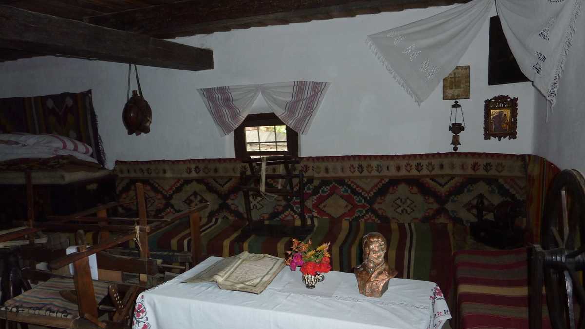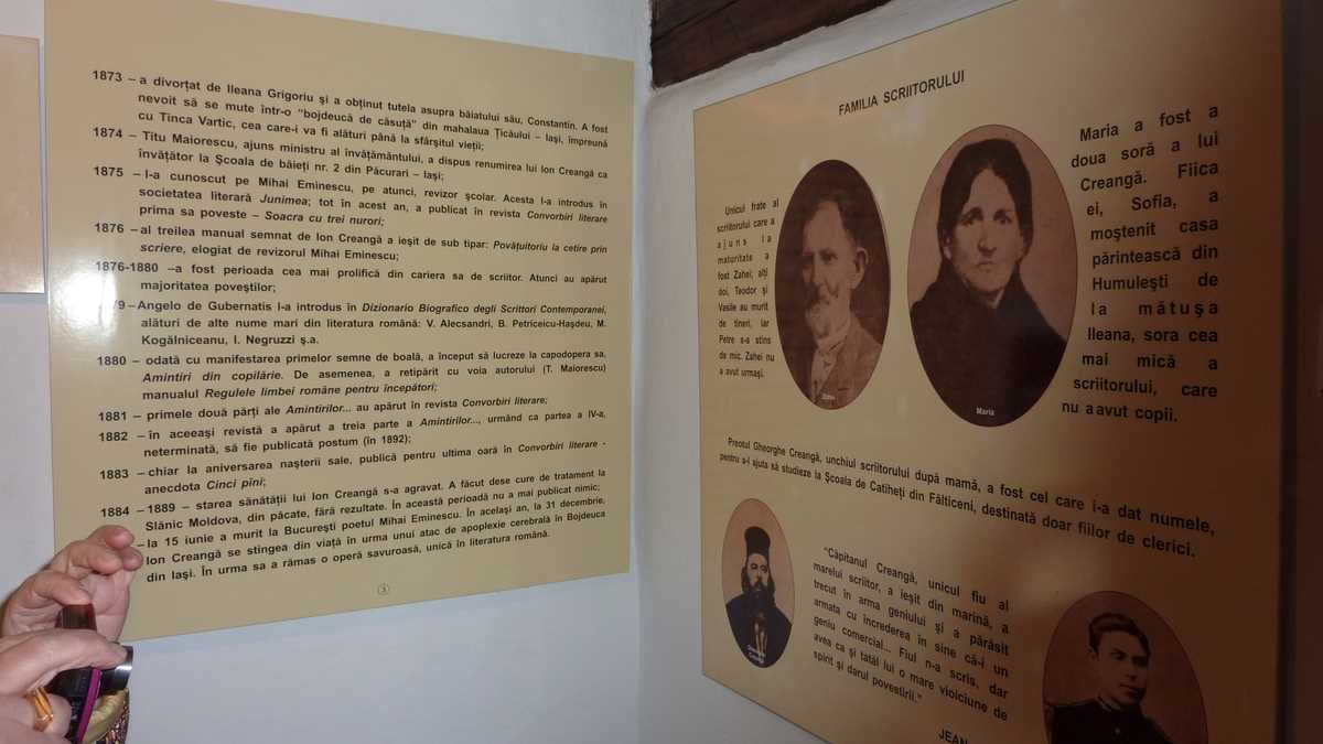 Bustul la maturitate al fostului locatar privește duios către căsuța simplă din lemn lutuit cu acoperiș din draniță, șopron și prispă pe trei laturi. O încăpere scundă cu podea de pămînt, tindă și cămară – asta a fost locuința copilului Creangă, a părinților săi și a celor patru frați și trei surori. Un apartament modest de o singură cameră pentru zece suflete, în care soba, patul, lada de zestre, lavița, măsuța joasă și rotundă cu scăunele, ceva veșminte populare, ștergarele, opaițul, candela și icoanele, plus plugul, grapa și vita de afară, erau cam toată averea unei familii de țărani de mijloc de secol XIX.