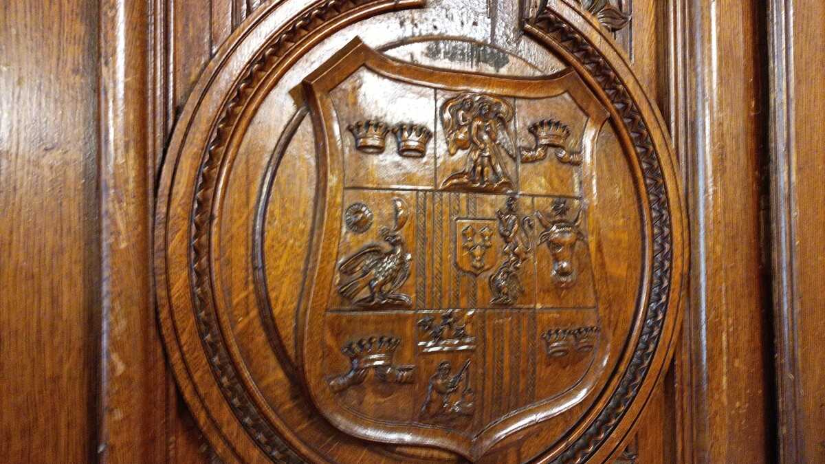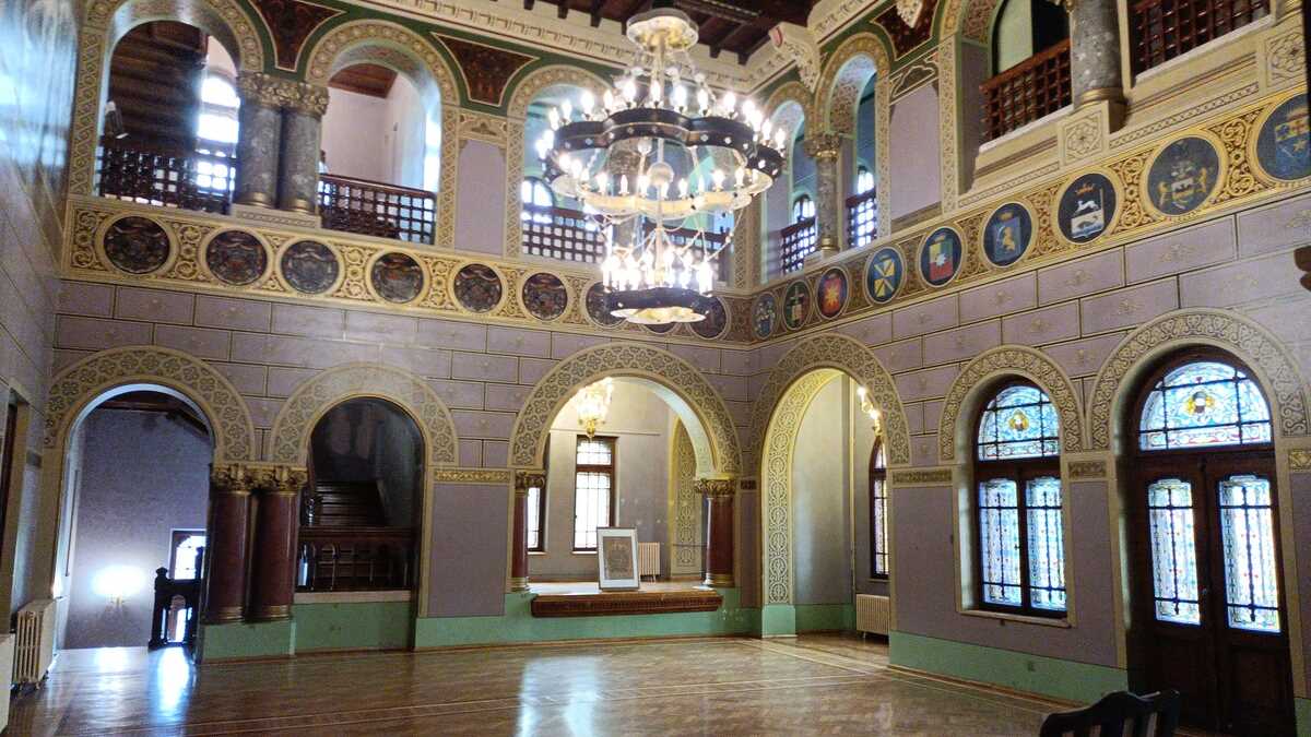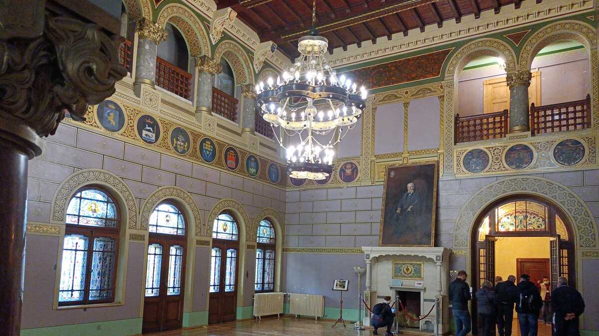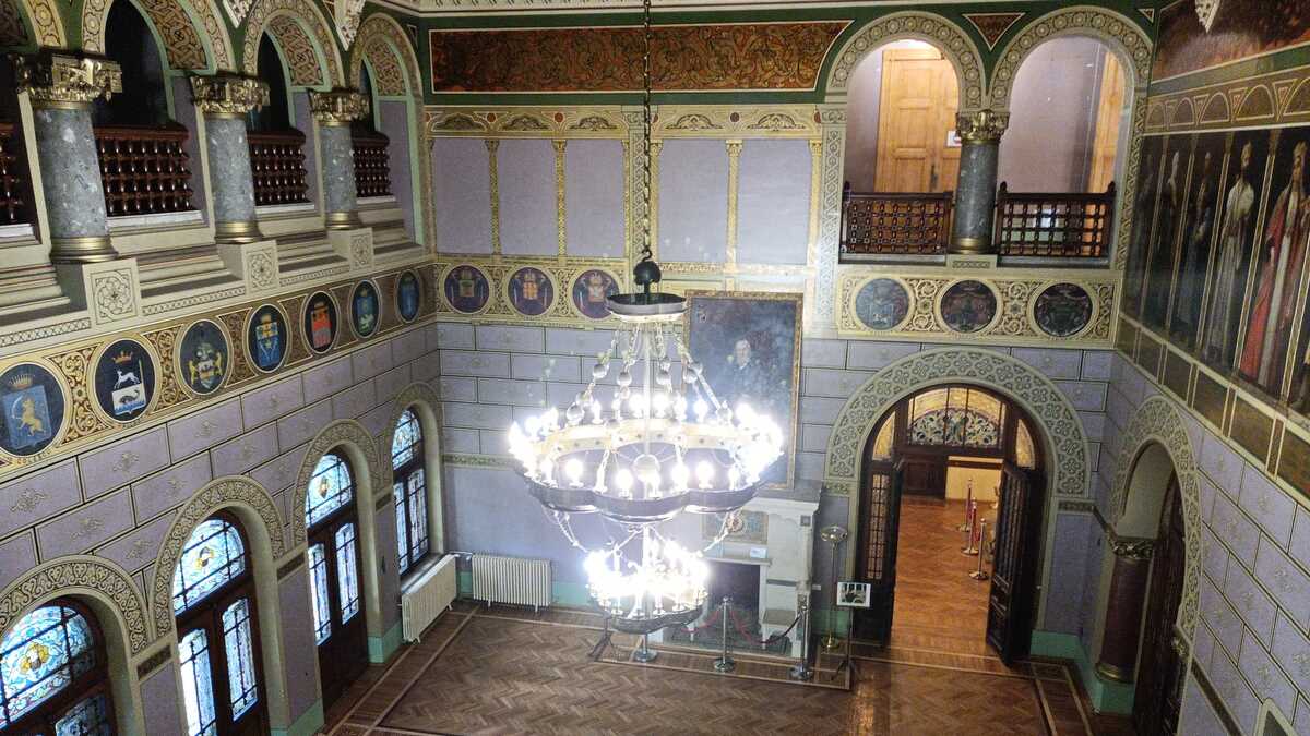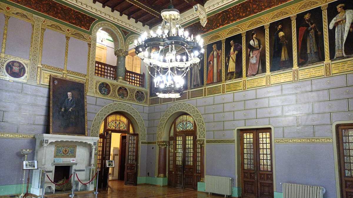 Cea mai impresionantă e, fără îndoială, sala de bal, inima castelului, în care atîrnă încă singurul candelabru original al clădirii, lucrat din bronz în stil neobizantin, între pereții înnobilați de blazoanele tuturor familiilor boierești înrudite cu Cantacuzinii și de cele 12 picturi pe piele de Cordoba care-i înfățișează pe cei mai importanți înaintași ai prințului, în mărime naturală. Postelnicul Constantin, fondatorul ramurii muntene a Cantacuzinilor, spătarul Mihail, ctitorul Mănăstirii Sinaia, Șerban Vodă, domnitorul care a tipărit prima Biblie în românește și a înființat prima școală de rang superior în limba română (actualul Colegiu „Sf. Sava“), nepotul său, Ștefan, decapitat de turci la Stambul, ultimul voievod pămîntean de dinaintea perioadei fanariote. Picturile au scăpat ca prin minune renovării comuniste, salvate de un anonim cu conștiință artistică care le-a acoperit cu hîrtie și pînză de sac înainte să intre în ele mistria tencuielii și bidineaua varului ordinar comandate de secretarul de partid cu propaganda.