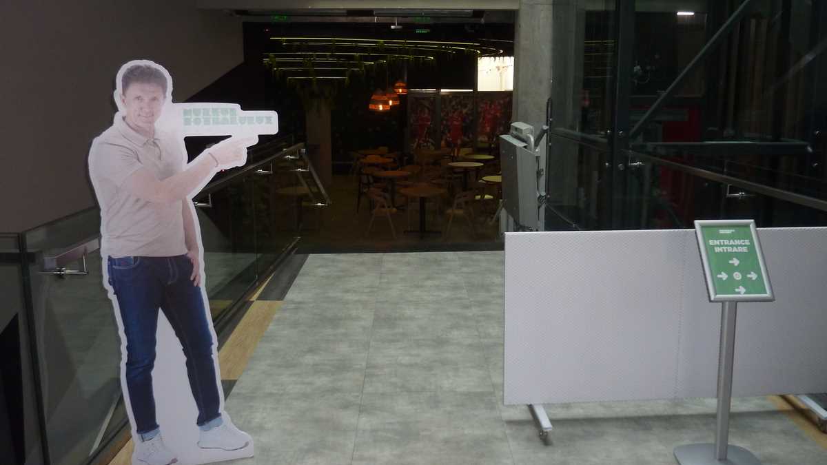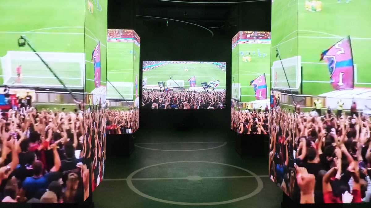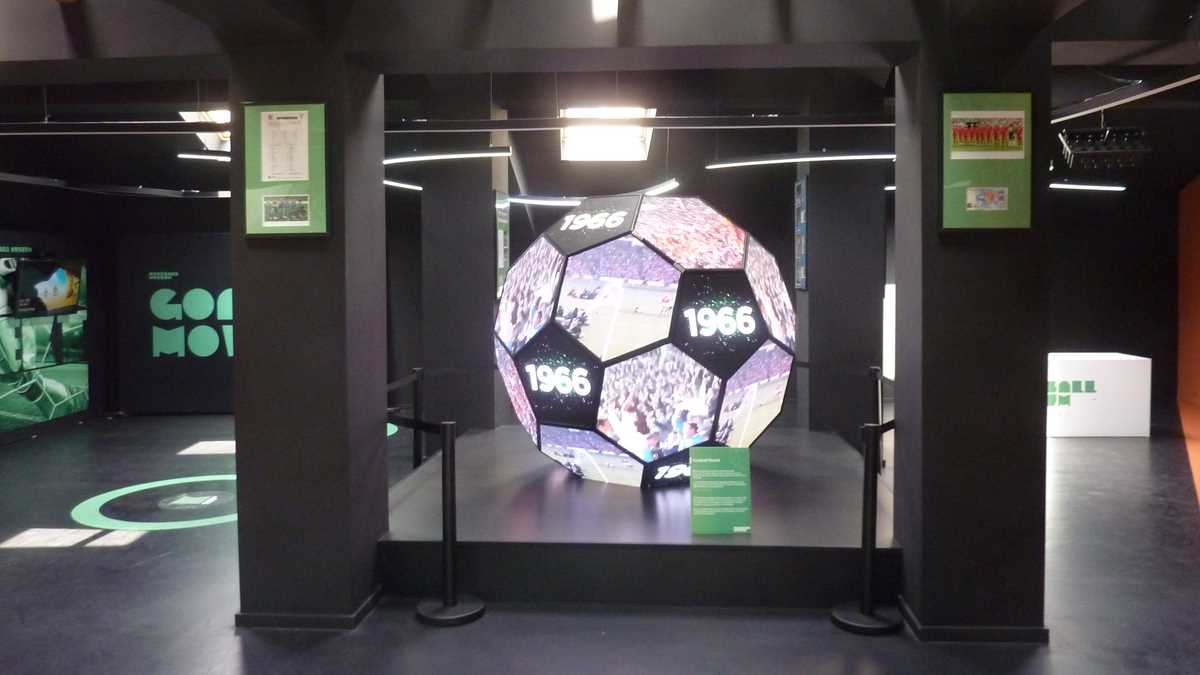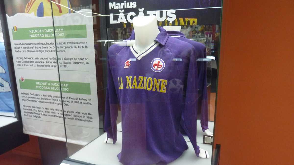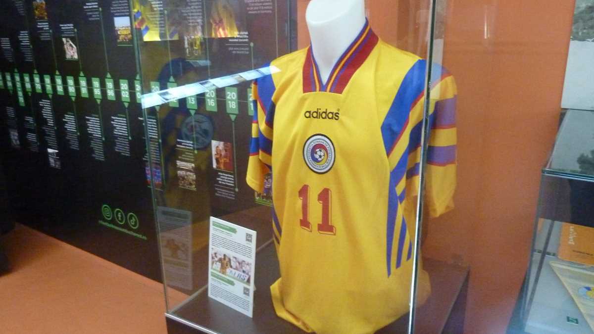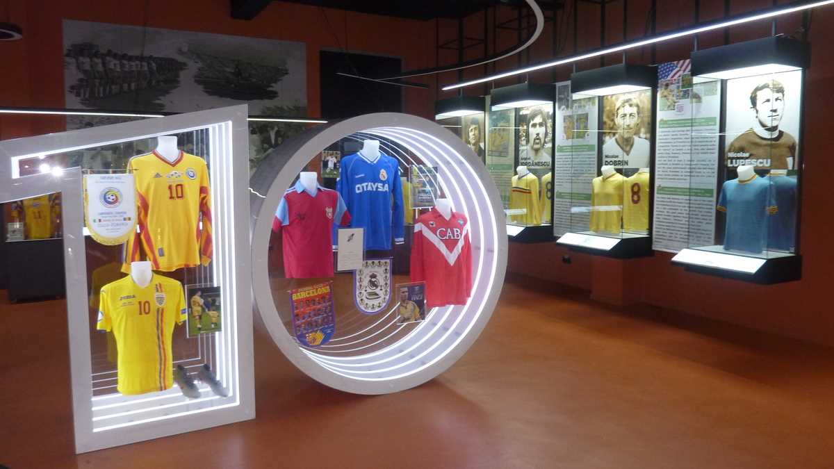 În capătul holului în care-ai intrat din stradă, un Gică Popescu din carton colorat te invită să urci treptele spre primul etaj, în sala Romanian Room, dedicată exclusiv fotbalului românesc și echipei naționale. Central, o vitrină deosebită cu două corpuri în formă de 10 expune succint cariera lui Hagi: în 0, tricourile de la Steaua, Real Madrid și Brescia, în 1, cel de Națională, din celebrul meci de retragere al Galei Hagi, plus cel al lui Ianis de la partida cu Germania de la CE de tineret din Italia 2019. În lateral, dreapta, din casete bine iluminate, zîmbesc Culae Lupescu, Dobrin, Iordănescu sau Sameș, tricourile lor de titulari în meciuri internaționale deschizînd parada continuată de cele ale lui Dan Coe, Dorinel Munteanu, liderul selecțiilor all-time, Gabi Balint, Cămătaru, Gică Popescu, replica oficială a tricoului regretatului Daniel Prodan, cu autografele colegilor, sau ghetele lui Mutu și Chivu. Vizavi, în Experience Room, pereții sînt pavoazați cu alte tricouri importante, purtate de mari fotbaliști străini, unii dintre ei cîștigători de Balon de Aur: Figo, Ronaldo brazilianul, Stoicikov, Baresi, Maldini, Baggio, Maradona, Pelé. La fiecare cîteva minute, filmulețul de prezentare a muzeului, rulat în buclă pe ecranul instalației video prelungite pe stîlpi, creează senzația de spectator în tribună, o ambianță care dă fiori microbiștilor.