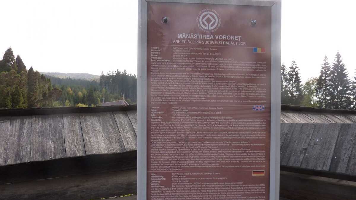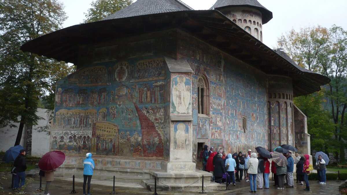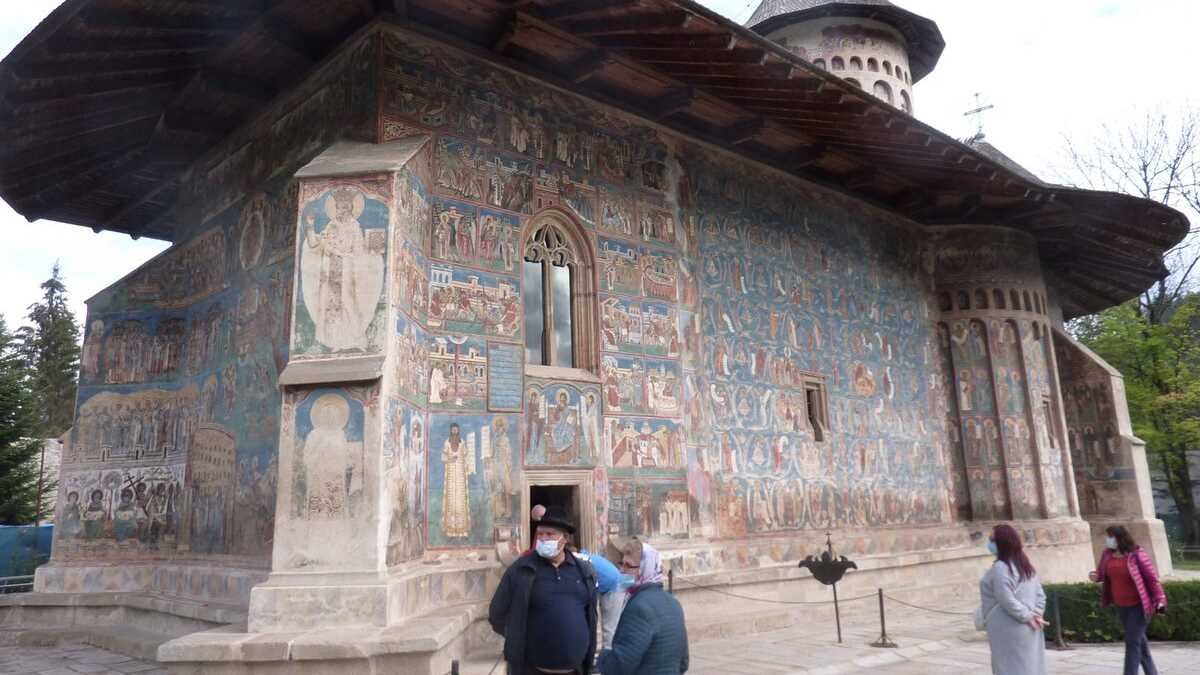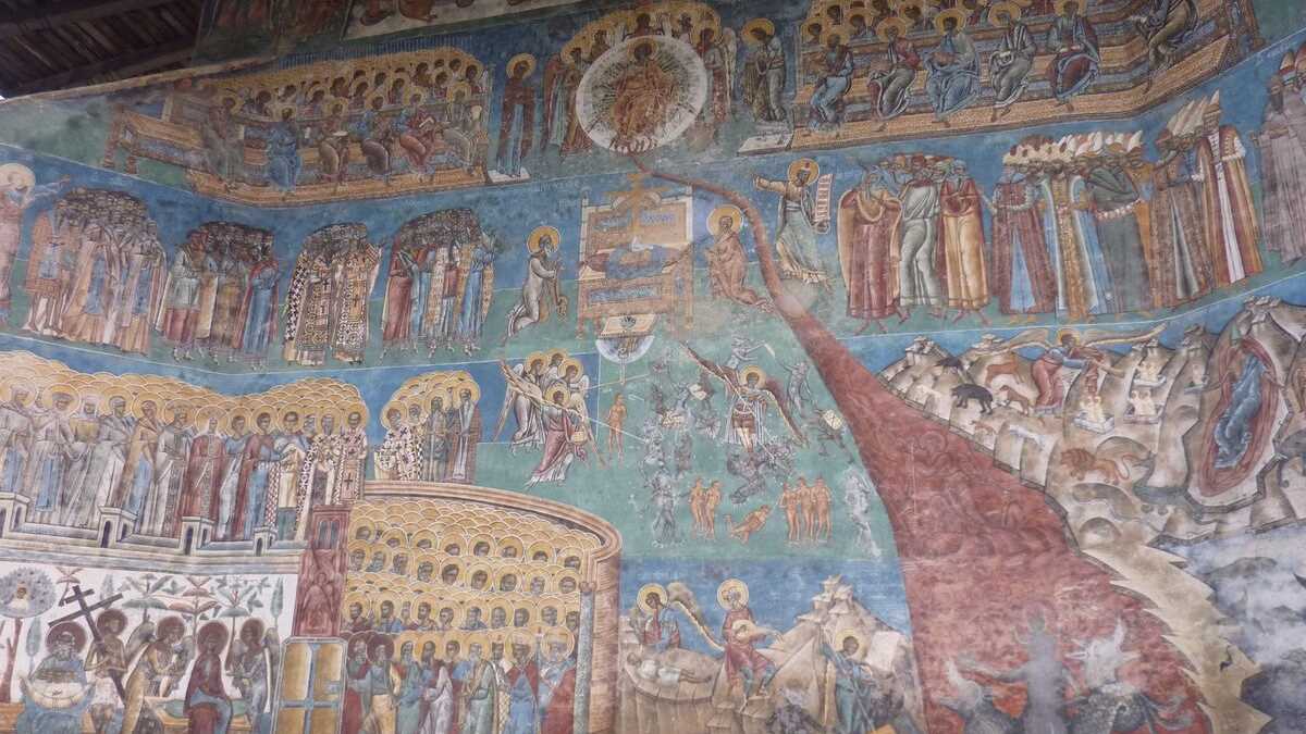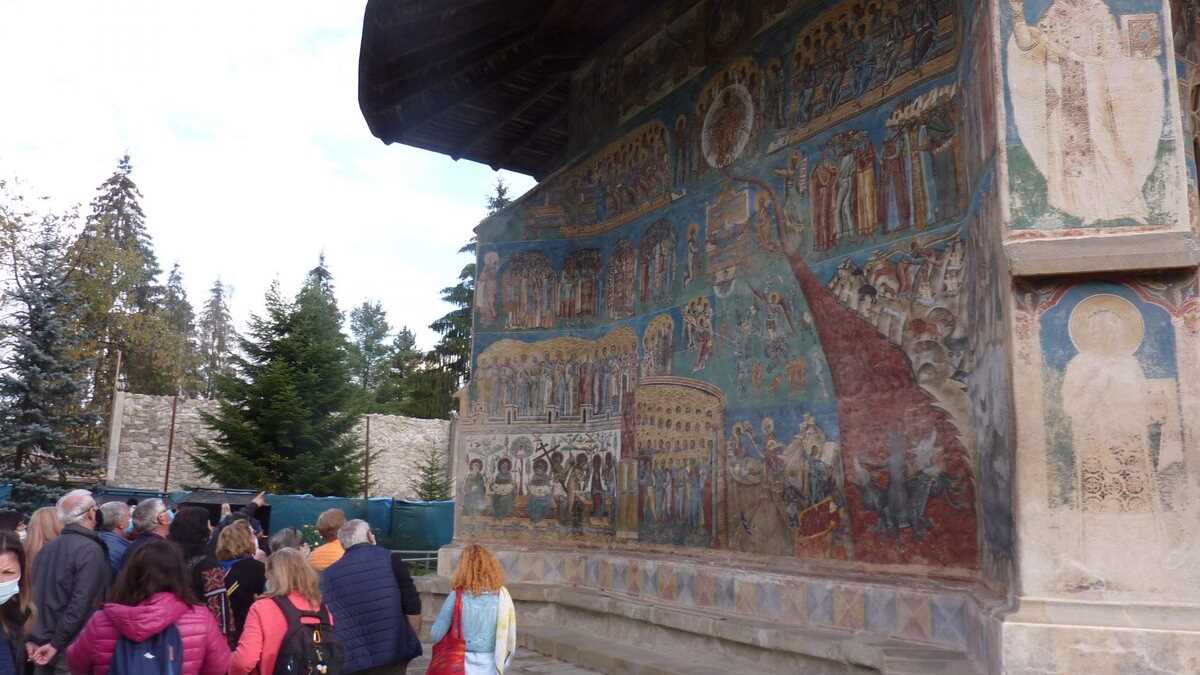 Dacă n-ai fost deturnat din drum de vreo plăcintă poale-n brîu aburindă, înseamnă c-ai ajuns deja în fața turnului clopotniței, la poarta din lemn sculptată cu bourul Moldovei practicată în înaltul zid de piatră al incintei împrejmuite ca o fortăreață. Pătruns dincolo de ea, ca să faci ocolul complet al bisericii, pe aleea îngrijită, flancată de tufe de trandafiri, trebuie să slalomezi cu atenție printre enoriașii veniți din toată țara în excursie cu parohia care gravitează în jurul grupului cu urechea la explicațiile preotului însoțitor și ochii lipiți pe faimoasa nuanță de albastru de pe pereți. Cea mai studiată e fresca de pe fațada vestică, o imensă icoană cu scena Judecății de Apoi, compoziția unică în arta grafică a Orientului creștin care i-a făcut pe unii să proclame Voronețul „Capela Sixtină a Estului”.