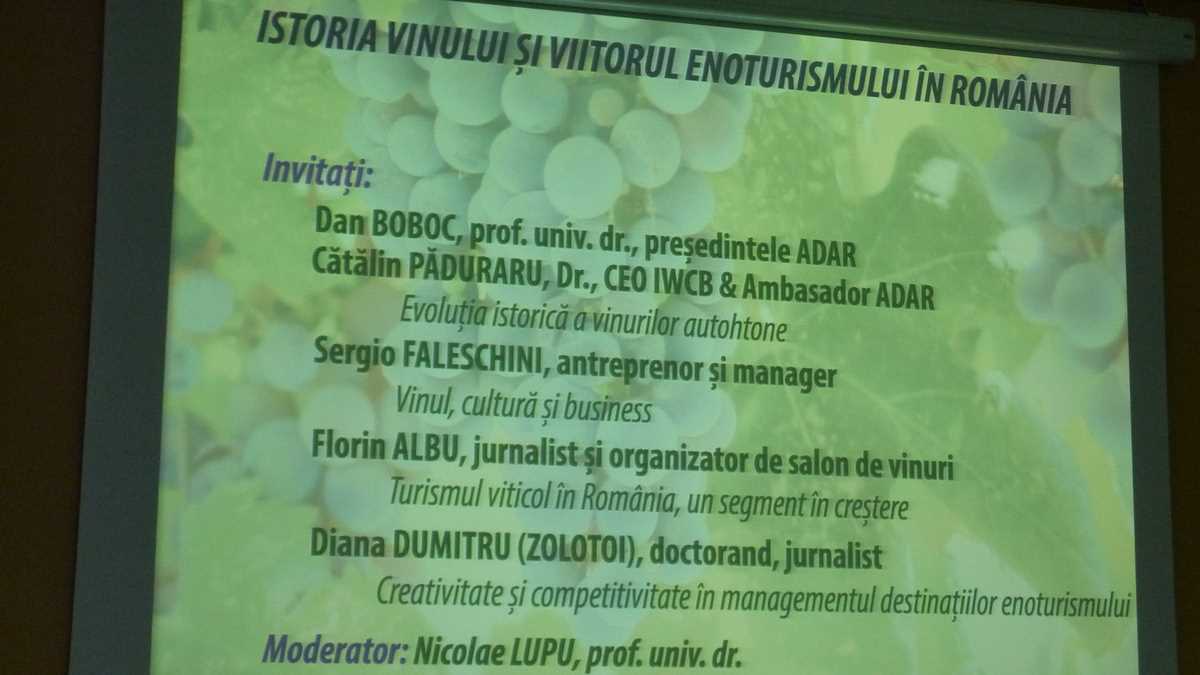 Ai cărui reprezentanți, așa cum a remarcat și doamna Pîrvu, au lipsit cu desăvîrșire din sala Nicolae Iorga a pavilionului C6 din complexul Romexpo, locul unde s-a ținut dezbaterea asta din programul de evenimente ale Tîrgului de Turism al României. „Istoria vinului și viitorul enoturismului în România” a fost organizată de Departamentul de Turism și Geografie al Facultății de Business și Turism de la ASE, în parteneriat cu ADAR, VinaArte, revista Top Business și Clubul Presei de Turism – FIJET România, și moderată de prof. univ. dr. Nicolae Lupu. Cel care, la final, ne-a invitat pe toți cei din sală la un mic drum al vinului. Unul de vreo 30 de metri, între miniexpoziția de ustensile și gadget-uri ale sommelier-ului și standul de degustare VinArte, la care vedete au fost Prince Mircea de Stârmina și Castel Bolovanu de Sîmburești, vinuri multiplu medaliate la concursuri internaționale.