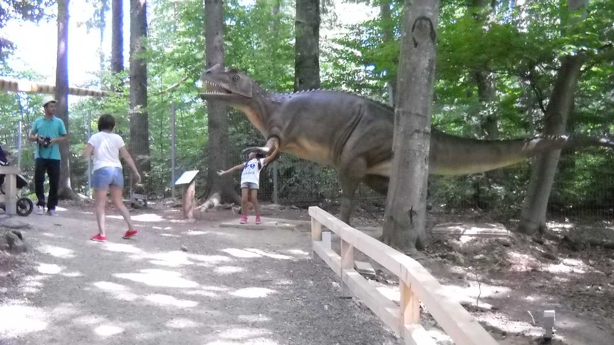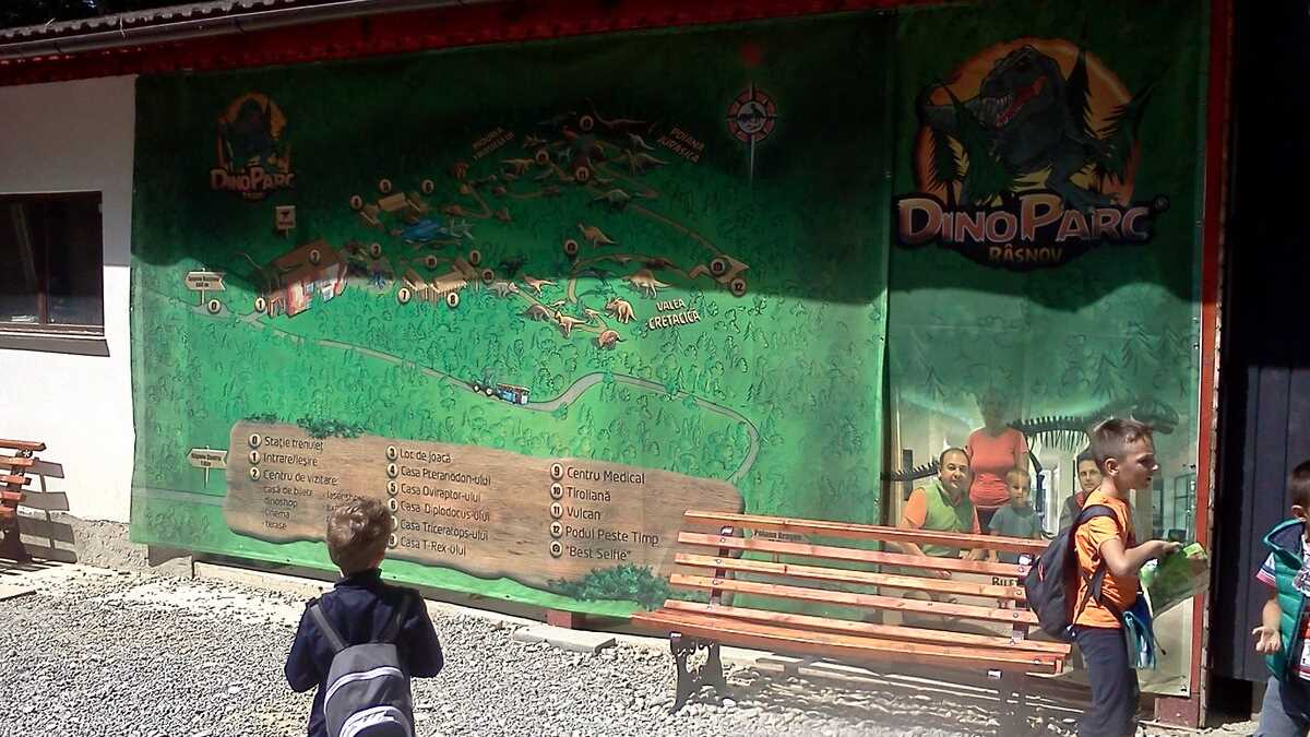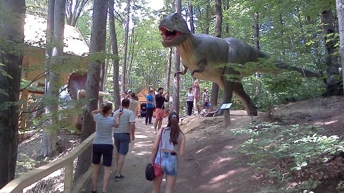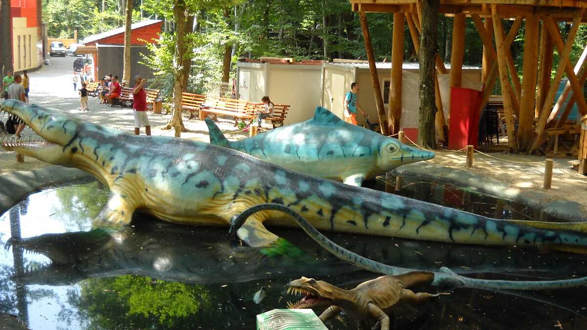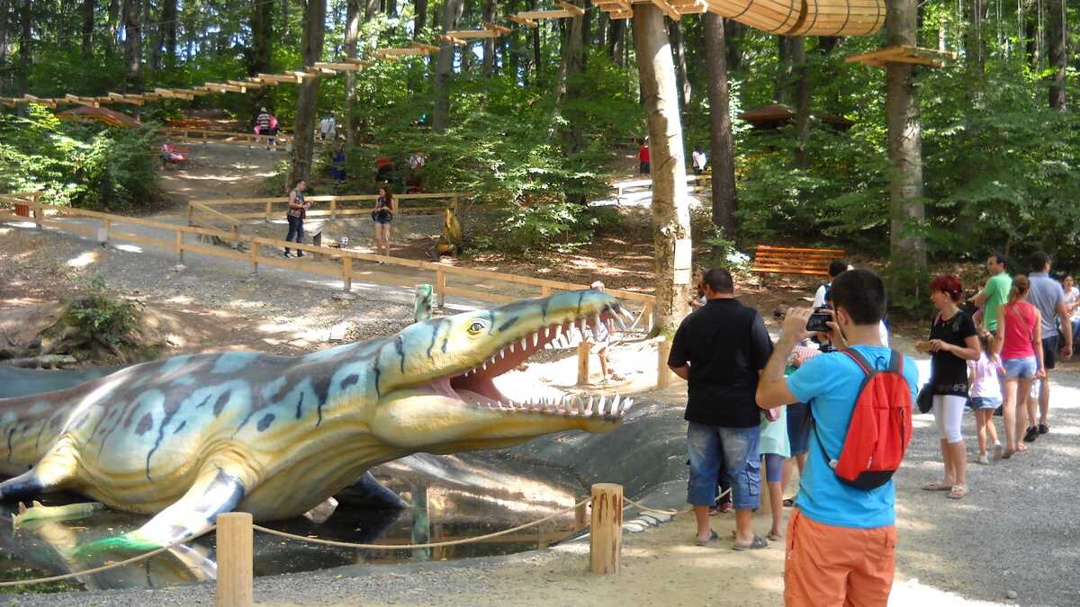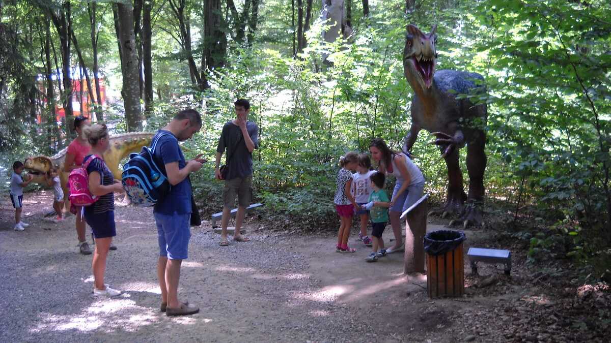 Nu te aștepta la un Jurassic World, în care dinozauri clonați să performeze ca la grădina zoologică; totuși, fără să aibă spectaculozitatea celor din film, cele 45 de machete la scară 1:1, updatate conform ultimelor cercetări în domeniu, par – de la distanță, cel puțin –, foarte reale (paleontologii români le-au dat note de peste 8 și 9, pentru acuratețea realizării). De la o plăcuță informativă la alta, pe un circuit cronologic de vreo 150 de milioane de ani, Triasic – Jurasic – Cretacic, o să dai prin pădure de același peisaj: părinți cu camere foto în mînă și copii curajoși, ieșiți din faza de timorare, care se cațără pe gîturi și spinări, se agață de gheare, bagă capul printre colți, în guri larg deschise. Atracțiile principale sînt un pui de dinozaur scos de trei ori pe zi la plimbare printre puști în extaz și vulcanul artificial care fumegăie și, din timp în timp, erupe, cutremurînd platforma din lemn din apropiere. Sfat prietenesc: la sfîrșit de săptămînă e o aglomerație de vizită la moaște – vino cu copiii odihniți și mîncați, altfel o să ai parte de altfel de distracții.