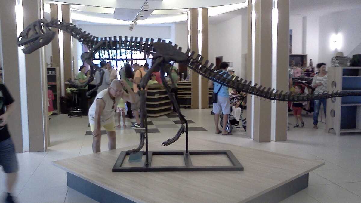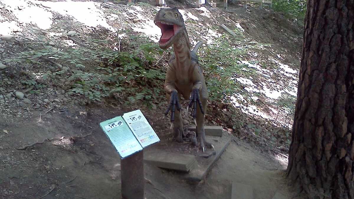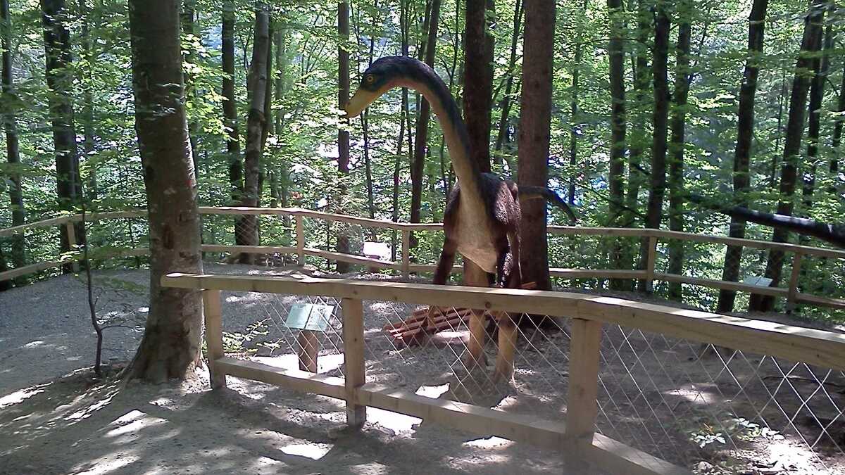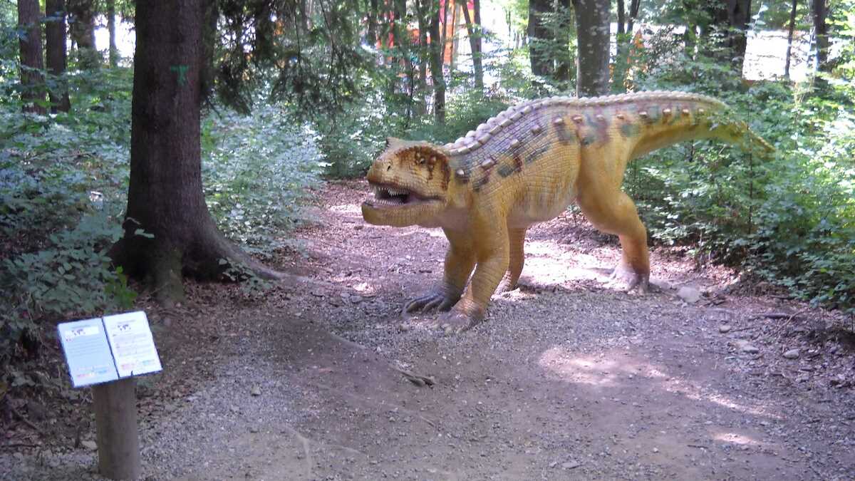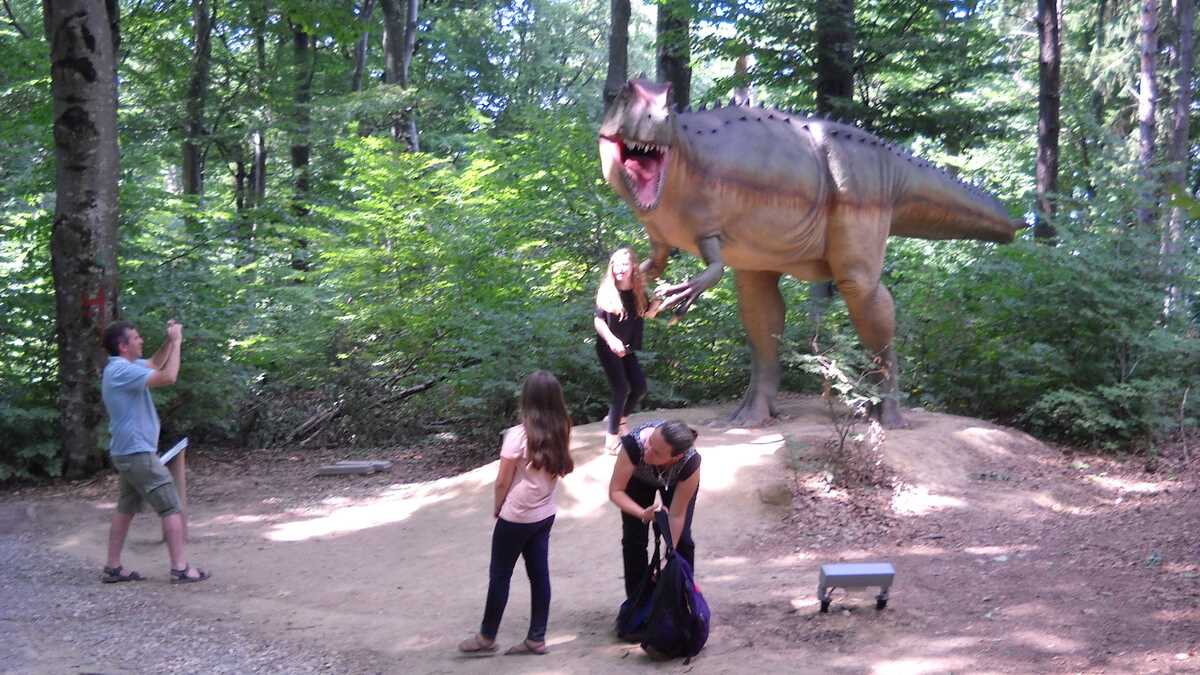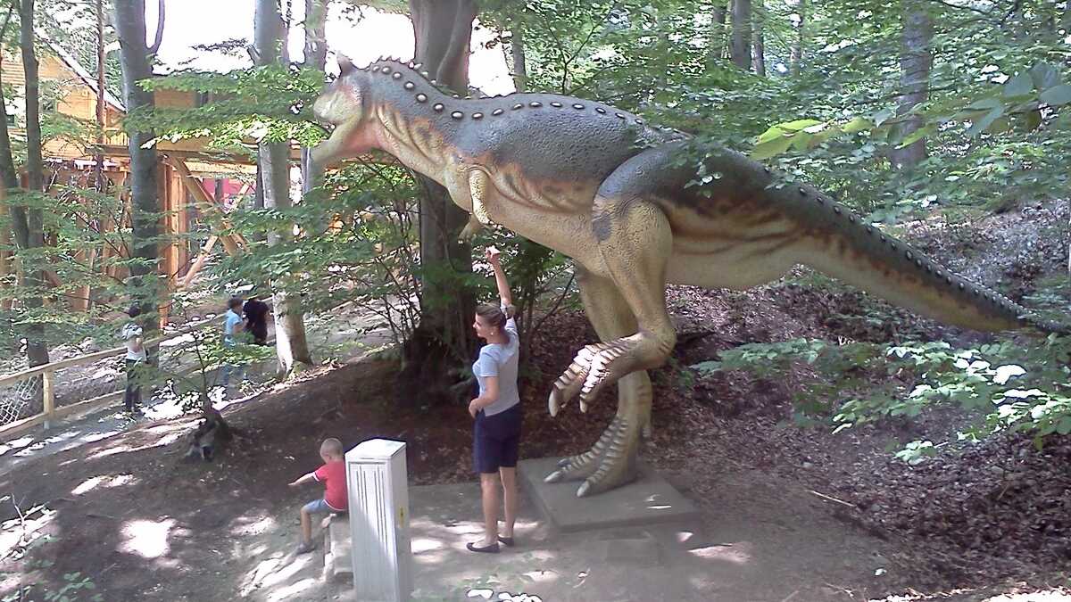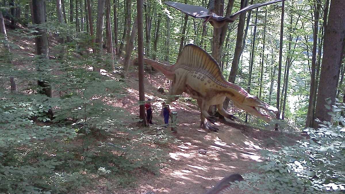 Nu te aștepta la un Jurassic World, în care dinozauri clonați să performeze ca la grădina zoologică; totuși, fără să aibă spectaculozitatea celor din film, cele 45 de machete la scară 1:1, updatate conform ultimelor cercetări în domeniu, par – de la distanță, cel puțin –, foarte reale (paleontologii români le-au dat note de peste 8 și 9, pentru acuratețea realizării). De la o plăcuță informativă la alta, pe un circuit cronologic de vreo 150 de milioane de ani, Triasic – Jurasic – Cretacic, o să dai prin pădure de același peisaj: părinți cu camere foto în mînă și copii curajoși, ieșiți din faza de timorare, care se cațără pe gîturi și spinări, se agață de gheare, bagă capul printre colți, în guri larg deschise. Atracțiile principale sînt un pui de dinozaur scos de trei ori pe zi la plimbare printre puști în extaz și vulcanul artificial care fumegăie și, din timp în timp, erupe, cutremurînd platforma din lemn din apropiere. Sfat prietenesc: la sfîrșit de săptămînă e o aglomerație de vizită la moaște – vino cu copiii odihniți și mîncați, altfel o să ai parte de altfel de distracții.