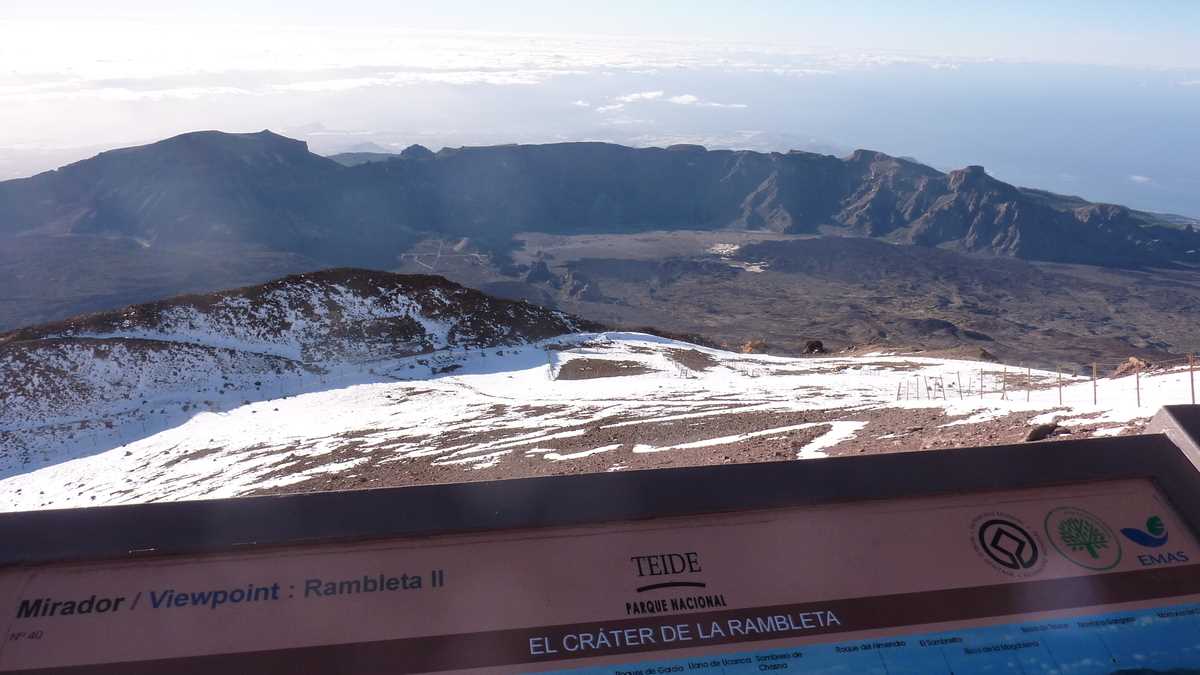 Tenerife e unul dintre puținele locuri de pe glob în care poți ajunge de pe țărmul oceanului pe vîrful muntelui (mai exact, de la 0 la 3.550 de metri altitudine, cît are stația de sus a telefericului), în sub două ore, ultimii 1.200 de metri în chiar mai puțin de un sfert de oră. Cum ar veni, de la Vama Veche la un kilometru deasupra Moldoveanului, în cam 90 de minute, dacă Făgărașul ar fi pe undeva pe la Cernavodă. De aici, de pe platforma stației unde bate tot timpul vîntul și e și ceva zăpadă, ca să urci și mai sus, îți trebuie un permis special de acces pe poteca care, după vreo oră de ascensiune, te duce pe vîrf; dacă nu-l ai, tot ce poți face e să admiri peisajul, mai ales cel de dincolo de caldera vulcanică, unde se vede marea. Marea de nori ce acoperă restul insulei pînă departe, la linia orizontului, unde nu mai știi care-i cerul și care-i oceanul.