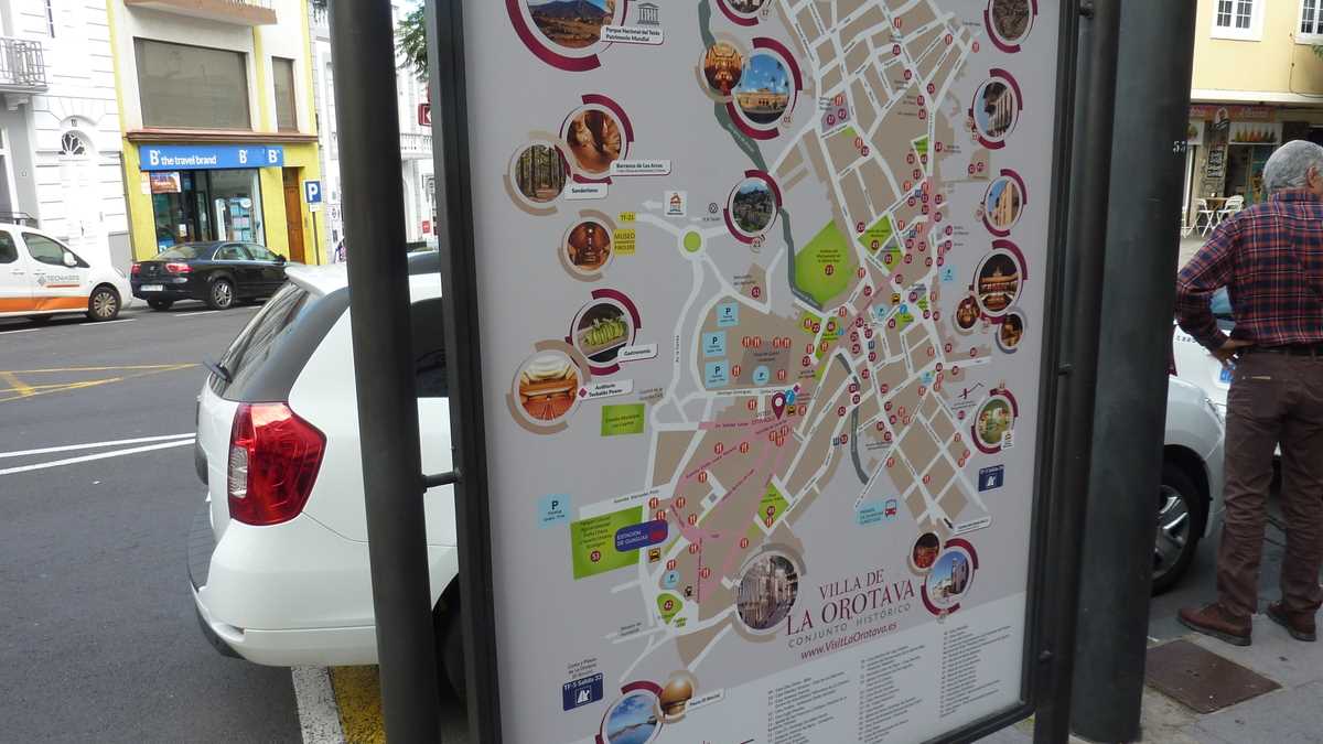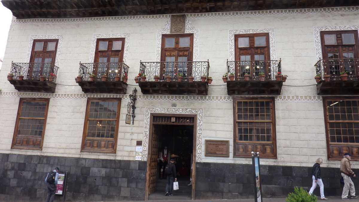 După o pauză scurtă la centrul de informare al rezervației pentru un filmuleț despre vulcani, autocarul și-a reluat traseul și a coborît pe partea cealaltă a masivului, în amfiteatrul natural pe care e construit La Orotava, orășelul-port în care a supraviețuit o parte din vechea arhitectură spaniolă colonială. Sîntem aici în special pentru Casa de Los Balcones, o clădire canariană tradițională din lemn sculptat (și, nota bene, netratat) transformată în muzeu, care are balcoane și în exterior, spre stradă, și spre curtea interioară inundată de plante subtropicale; camerele au cîteva piese din mobilierul original, iar oalele de pe plita din bucătărie, masa întinsă din salon și albumele foto deschise pe măsuța de lîngă pian îți dau senzația atemporală că sînt încă locuite.