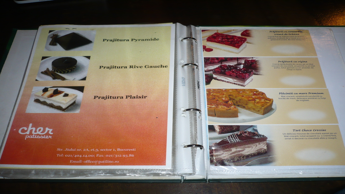 Să aruncăm și noi o privire în caietul-program, curioși să vedem ce consumă actorii între două acte. Ceva subțire, de fugă: o distribuție largă de sandvișuri (14–25 lei) și salate (19-30 lei), vreo șase feluri de paste, plus deserturi (plăcintă cu mere, prăjituri cu fructe, profiterol, înghețată), limonadă, ceai, bere, cocktail-uri. Ultima dată, așteptînd o prietenă, am ales o piesă scurtă, mai mult o scenetă: sandviș cu pui (pîine neagră, ardei gras copt, piept de pui la grătar, salată verde – 16,50 lei) în deschidere și Carlsberg (7 lei) pînă la căderea cortinei.