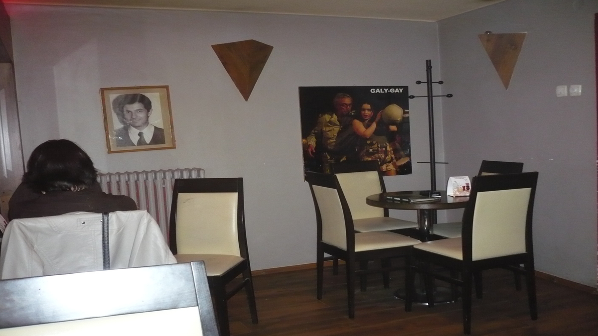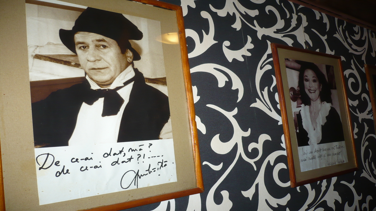 Imediat după intrare, urci scara care începe din ușă pe deasupra barului, calci podeaua din lemn care scîrțîie sub picioare ca scîndura scenei, și-ți cauți o masă la etaj, într-una din încăperile micuțe, ca de garderobă a teatrului. Lume tînără, ambianță boemă: Jos Pălăria e foaierul în care se ține aproape tot timpul un colocviu cu studenții de la Universitate, aflați la o cafea între două cursuri. Înghesuit, dar intim, deși actorii din tablourile cu autograf sau fotografiile-instantaneu din piese de teatru (cu dedicație specială pentru colegul Mihăiță) ți se cam uită peste umăr, în pahar și farfurie.