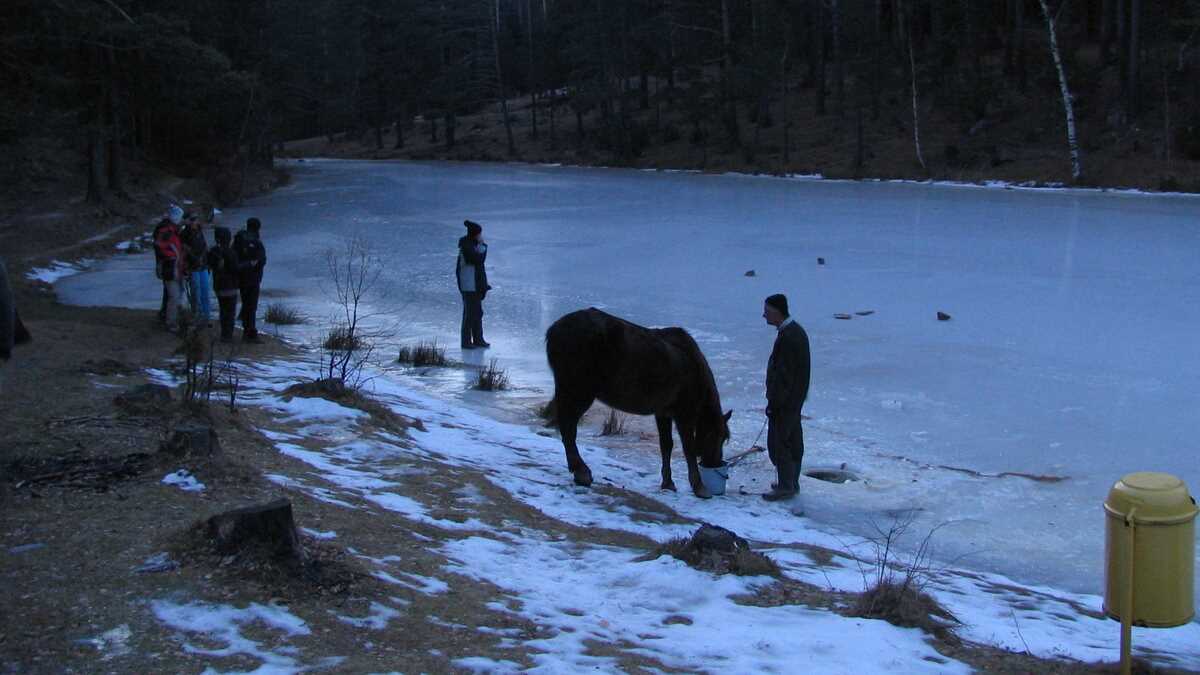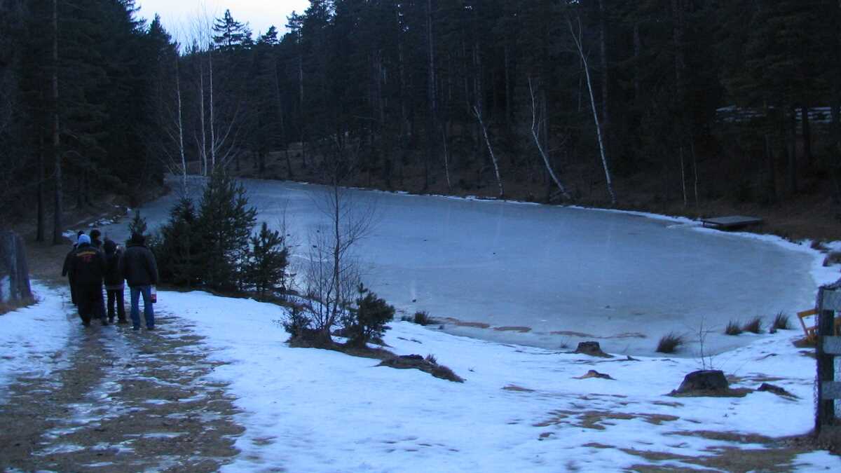 Yupii, excursie! Urcăm pe deal, la “Tabără“ – locul de promenadă al satului, fosta tabără de pioneri din timpul comunismului. Pe drum, pînă acolo, dăm de alt obiectiv celebru în Bisoca: vila pesedistului Ion Vasile, tatăl ziaristei “răpită în serai“ mai acum cîţiva ani. În apropierea taberei, o Sf. Ana la scară 1/10, cred. Lacul e îngheţat bocnă; un nene a fost nevoit să taie o copcă în gheaţă ca să-şi poată adăpa calul. Se încinge spontan un fel de fotbal-hochei. Sînt în echipă cu Mişu şi Bogdan. Fetele (Diana, Roxana, Paula, Iulia şi Alina) fac galerie.