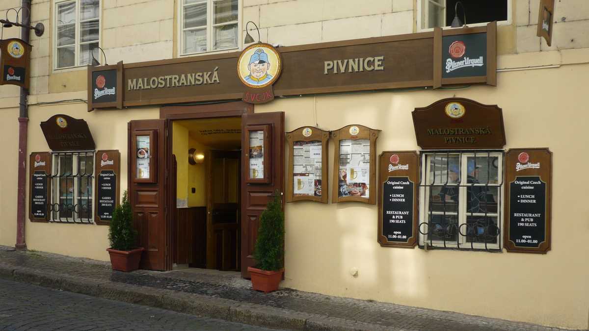 Seara. Cea mai veche berărie pragheză. U Fleků, 1499. Acordeoniştii de serviciu au în playlist piese celebre din repertoriul internaţional. Într-un salon e Katiuşa, de alături se aude E viva Espana!, toată lumea rîde, cîntă şi bea bere. Unii dansează. Chelnerii trec printre mese cu tăvile cu shot-uri de Becherovka (nu face greşeala: în combinaţie cu berea, tăria asta dulceagă e letală). Supă de ceapă/usturoi (59 CZK), cîrnaţi pe varză (139 CZK), berea casei – lager, 13% (59 CZK, 400 ml).