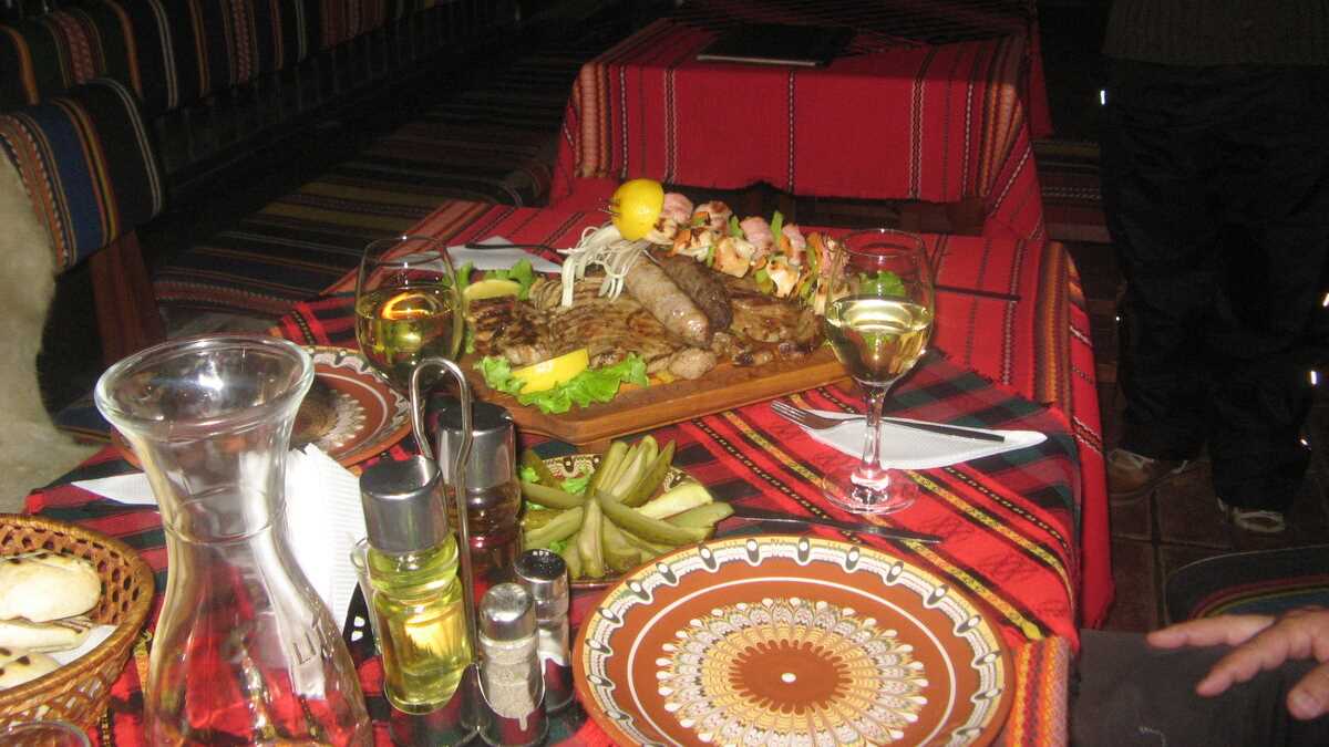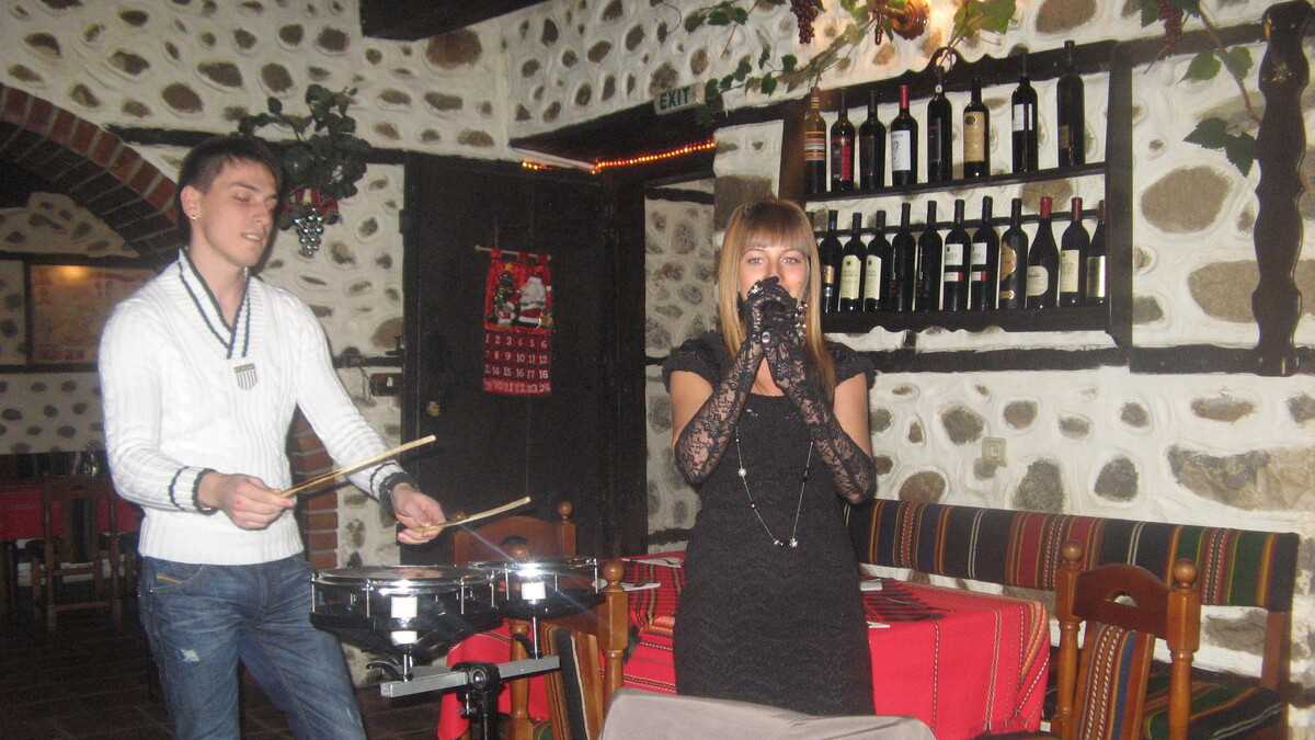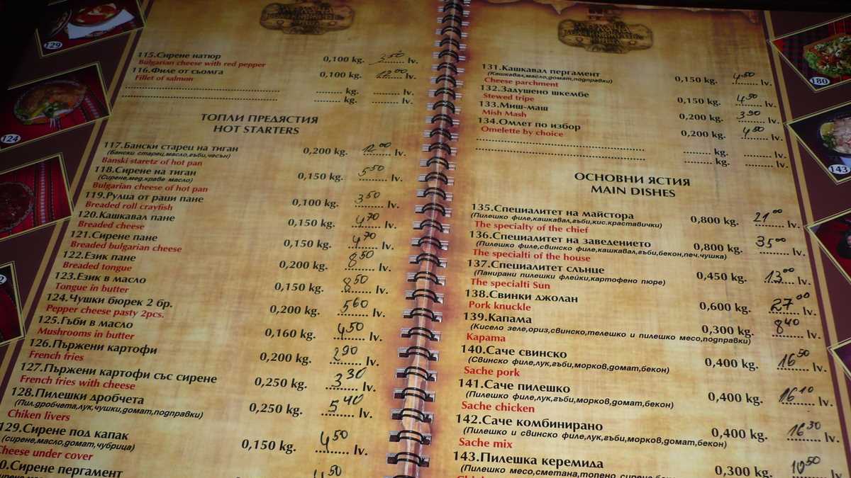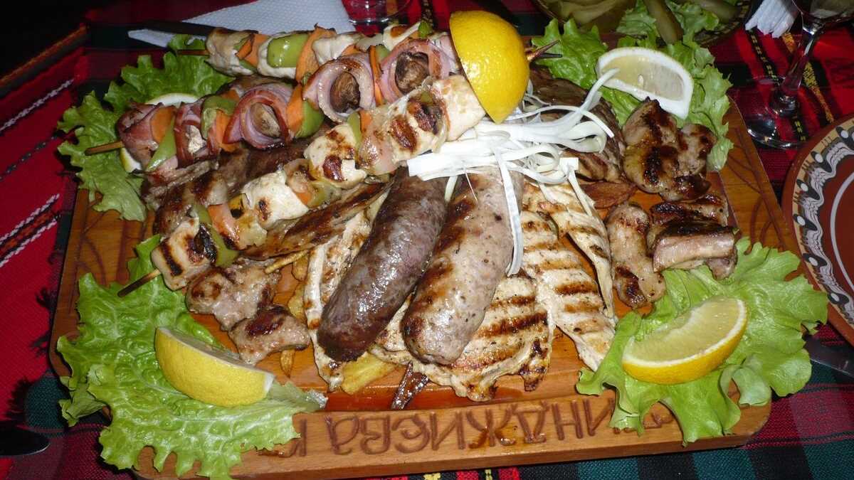 Cu ajutorul îndoielnic al unui meniu bilingv (BG/UK), precum și cu cel al unui ospătar amabil, vorbitor-înțelegător de engleză, care o rupea însă binișor și pe românește, s-a început cu cîte o rakia mică, apoi s-a ciugulit, de amețit foamea, de prin farfuriile cu clasicii castraveți murați, pînă la sosirea celor două Platoul casei (fleici, mușchi, costiță, cîrnați, frigărui, cartofi, salată, lămîie) – 1,7 kg de carne la grătar/blat de lemn, cu chifle prăjite și trecute prin mujdei. Totul udat cu un vin alb, sec, Chateau Karnobat la carafă (pînă a pierdut numărătoarea, Bursucul își amintește de primele patru carafe).