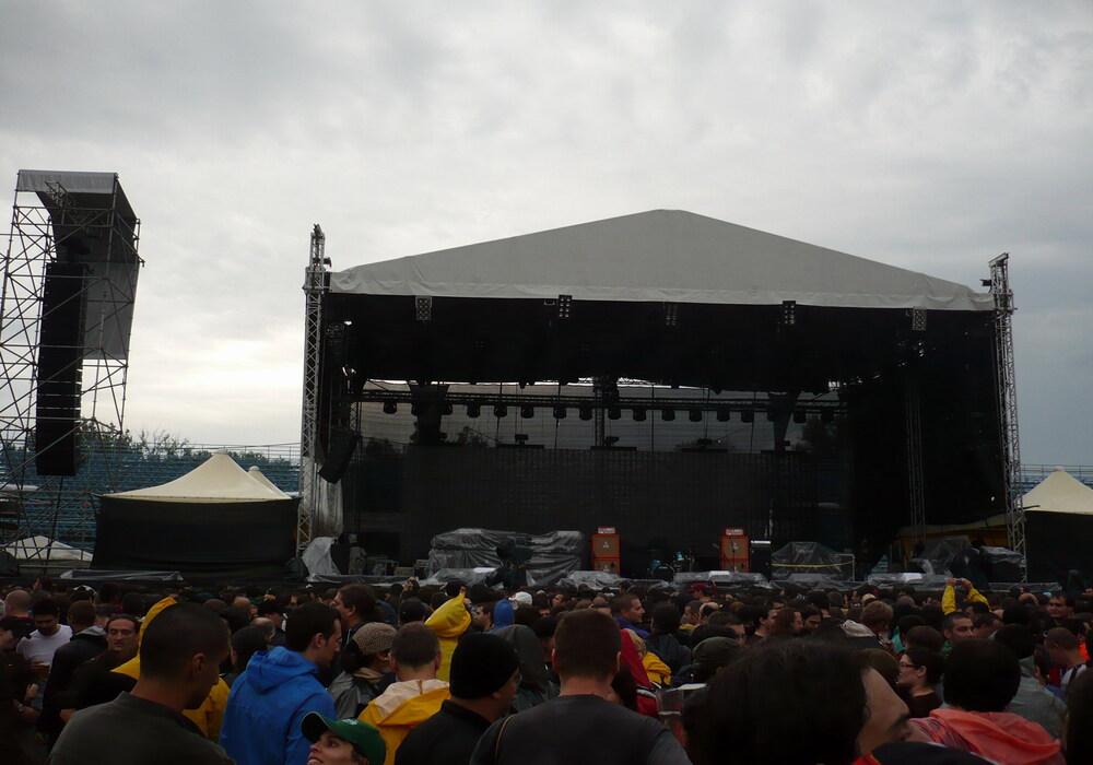 Pe la 6 sînt pe gazon. Pe pista de atletism, chioșcuri cu sucuri și apă servite în peturi. Lume foarte diversă. Tricouri, freze de toate formele și culorile. Un nene cu o bîtă cu lanțuri se plimbă țanțoș de colo-colo; foarte natural, ca și cum își face plimbarea de seară în baston. Cum pana lui Hetfield a reușit să intre cu ea?! Unde și-a ascuns-o?