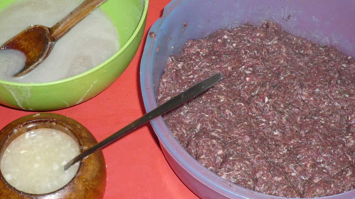 Se frământă carnea într-un vas pe măsură timp de un ceas, adăugând la început bicarbonatul de sodiu, care se stinge cu zeama de lămâie. Jumătate din zeama de oase şi toate celelalte condimente, afară de usturoi, se adaugă treptat, uniform şi puţin câte puţin. Amestecul se acoperă şi se dă la gheţar o zi şi o noapte, după care se scoate, se lasă câteva ceasuri la dezmorţit şi se mai frământă o dată preţ de o jumătate de ceas cu restul de zeamă de oase dezmorţită. Se face un mujdei de usturoi cu apă călduţă dintr-o căpăţână pentru fiecare kilogram de carne, care se lasă la tras o jumătate de ceas. Se stoarce mujdeiul de usturoi într-un tifon, se adaugă sucul de mujdei şi se mai frământă odată amestecul preţ de un sfert de ceas.