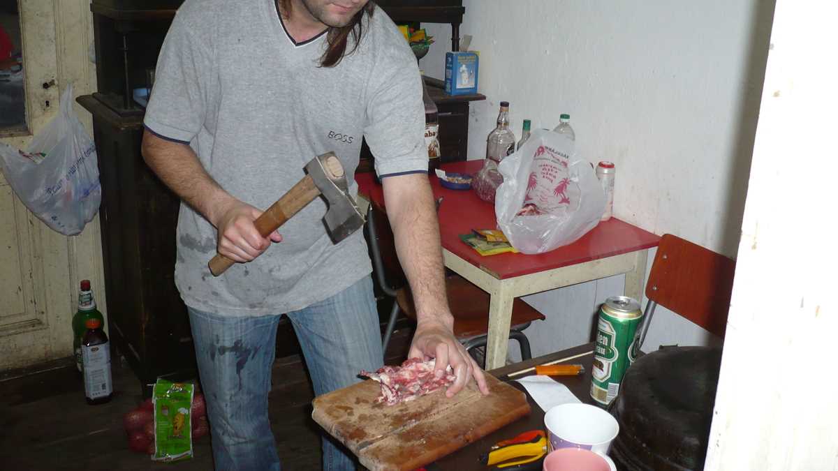După ce-am cumpărat de la măcelarie exact carnea de vită din rețetă, pe care ne-a tocat-o mărunt o tanti amabilă (De două ori, băieți?! Da, doamnă, vă rugăm!), plus oasele de vită aferente, odată ajunși acasă, am pus oasele la fiert și… ne-am împotmolit în condimente, uitîndu-ne lung unul la altul, apoi din nou la foile pline de grăsime pe care printasem rețeta: Ce pana mea or fi anisul stelat și chimionul turcesc? Prietenul nostru google ne-a lămurit buștean (numele astea muriseră demult), livrîndu-ne în loc aproximative denumiri actuale sau corespondentele moderne ale lor. În fine, am făcut rost de ce ni s-a părut mai potrivit din respectivele mirodenii și am trecut în linia întîi a frontului de operațiuni: am frămîntat carnea, respectînd toate indicațiile strategice din rețetă, apoi am dat-o la congelator. A doua zi, vineri seară, i-am mai tras un masaj cu zeamă de usturoi și am trecut-o din nou la rece.