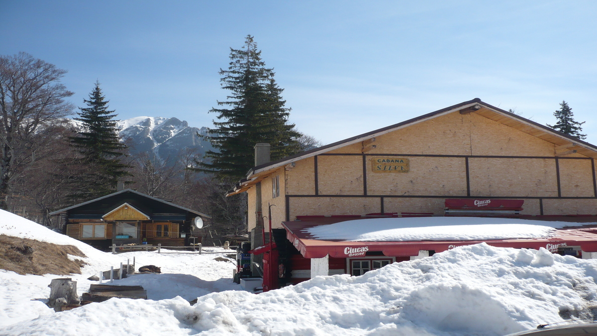 Pe partea stîngă a drumului cu troiene pe margine, puteţi observa ciupercăria de clădiri cu acoperişuri roşii şi discotecă – Cabana Muntele Roşu, dedicaţie specială pentru cei care au venit la munte să danseze. Cu ursul. Două sute de metri mai încolo, la capătul drumului, pe partea dreaptă cum te uiţi la Staţia Seismică (da, clădirea aia din buza pădurii care domină zona), recomandarea emisiunii pentru munţomanii ajunşi aici. Cabana Silva: căsuţe cochete din lemn încălzite la radiator electric (65 lei căsuţa cu două paturi), grupuri sanitare cu apă curentă şi săpun lichid, cabanier superamabil (Vă salut, dom’ Sorin!). Ceai – 2 lei, bere la doză – 4 lei, vin fiert – 5 lei, ciorbă de văcuţă – 6 lei, piept de pui cu garnitură – 14 lei.