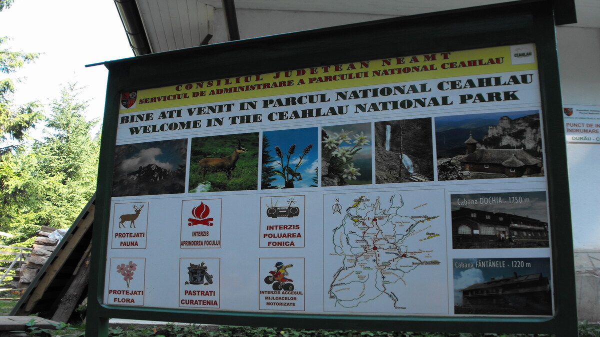 A doua zi dimineață, sîmbătă, pe la 8, e programată intrarea în traseu: Durău – Cabana Fîntinele – Toaca – Cabana Dochia, 3,5 ore, vara, după cum vă informează amabilul indicator de la plecare. Bineînțeles, după ce vă scobiți prin buzunare de taxa de protecție, pardon, rezervație (7 lei – adulții cu job și venituri, 3,5 lei – studenții, elevii, pensionarii și alți paraziți care sug sîngele poporului). Purcedeți așadar la urcat prin pădurea de fag, călare pe poteca spre Poiana Fîntînele și cabana cu același nume de familie. Atenție, ultima porțiune, aia care dă la cabană, e de scos limba la bocanci. Pauză de realimentare. Hăpăiți sandvișurile măiastru construite înainte de plecare de jumătatea cu talente culinare, la una dintre mesele de pe terasa din fața cabanei, căscînd gura între îmbucături și la tablou: înălțimile Ceahlăului, Durăul, Obcina Boiștea, munții Bistriței, valea pîrîului Schit – toate identificate, printre firmituri, pe harta primită odată cu biletele de acces.