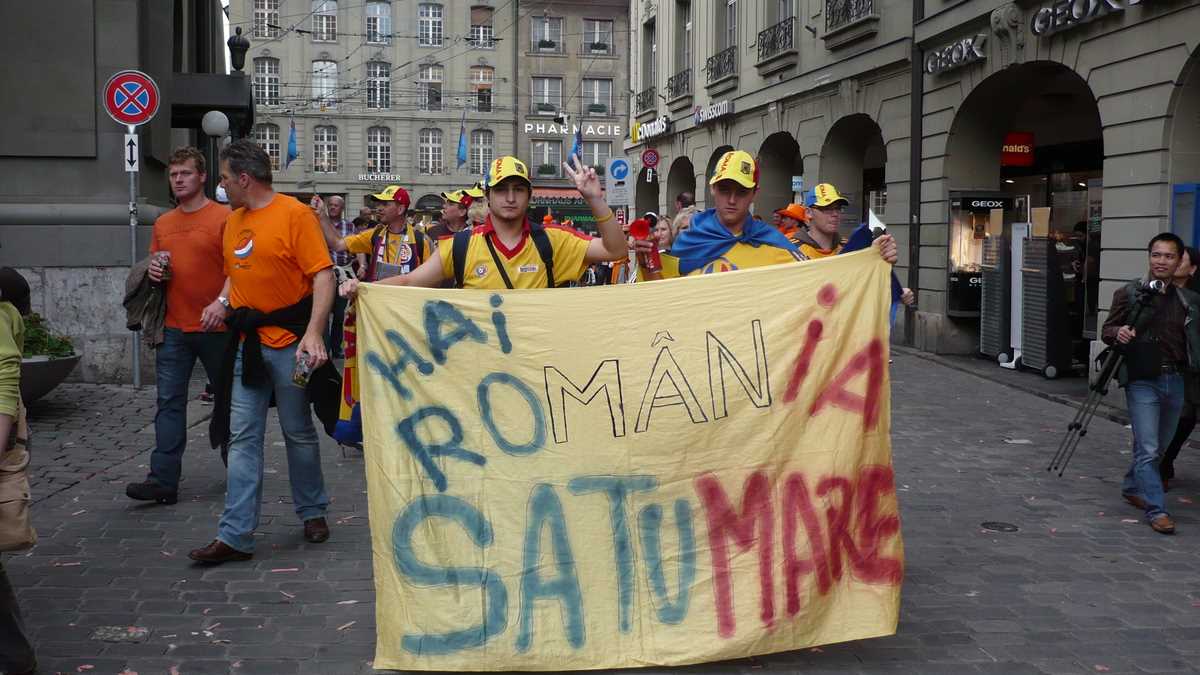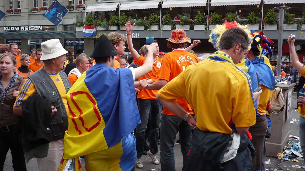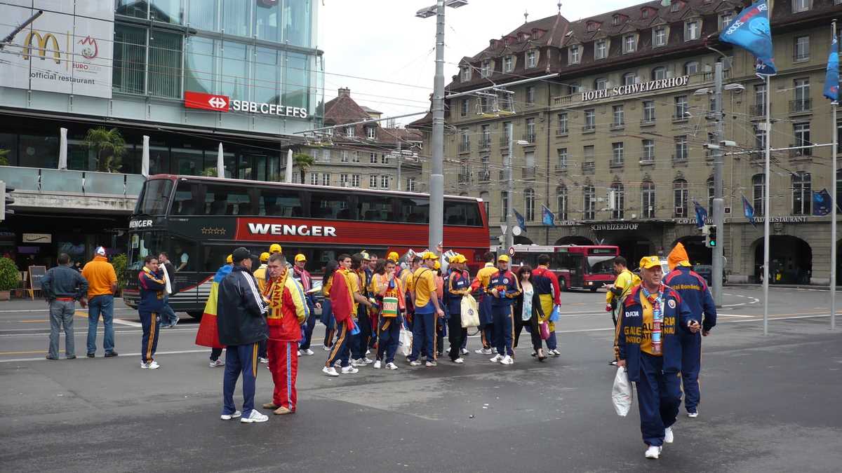 4,00 p.m. Un grup de olandezi (cu tricouri oranj pe care scrie „Popescu“!) intră în hora românilor. Ai noștri dau tonul la cîntec: „Pe Carla Bruni / S-o facem pe Carla Bruni!“. Ai lor urlă și ei; Carla Bruni are fani în toată Europa… Un nene de cetățenie incertă vinde fulare dedicate meciului. 20 CHF (aproximativ 14 euro), cam două beri pe terasele din centru. Sau 20, la supermarket.