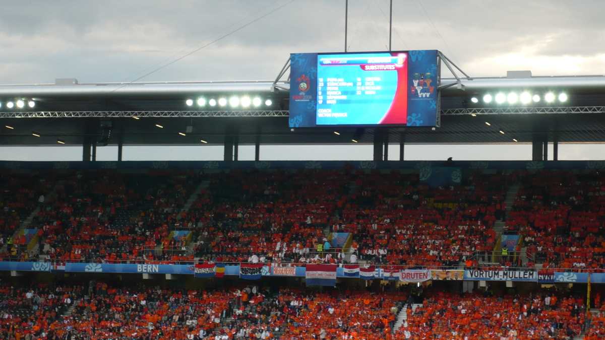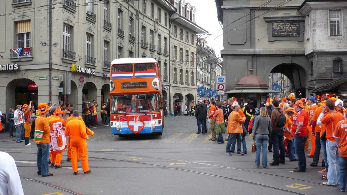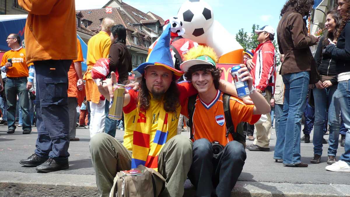 7,00 p.m. Pe drumul spre stadion, localnicii stau pe margine și se uită ca la ursul-simbol al orașului din groapa de la capătul podului Nydeggbrucke. Portocalele mai mult se rostogolesc de la atîta bere, dar suflă în goarne și strigă răgușit „Oranje!“. Ai noștri agită fulare și fac poze. Ici-colo, cîte unul care plînge că vrea bilet, dar nu de ăla scump de la bișnițari (da, au fost și de-ăștia). N-am văzut însă doamnele cu „de floare și dovleac am, băieți!“. Or fi avînd altă treabă, mai bănoasă. Să cerșească prin centru, de exemplu.