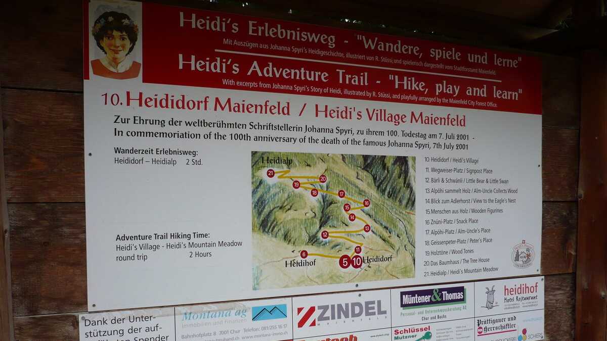 Prima oprire e în Maienfeld. Localitate pe Valea Rinului, lîngă graniţa cu Liechtenstein, care are, mai în deal, Heididorf – adevărata reşedinţă a lui Heidi (după cum scrie pe toate panourile din tîrg). Nu ştiţi cine e Heidi? O Sandy Bell, inventată, pe la 1880, de o scriitoare elveţiană care a înnebunit Japonia; după ce s-au făcut filme şi desene animate celebre la ei pe stradă, niponii vin aici ca la Mecca. Oferta este cu totul inedită: vizită la casa bătrînească cu stivă de lemne în spate, plimbare cu căruţa, promenadă printre găini şi capre. Toate contracost, bineînţeles.